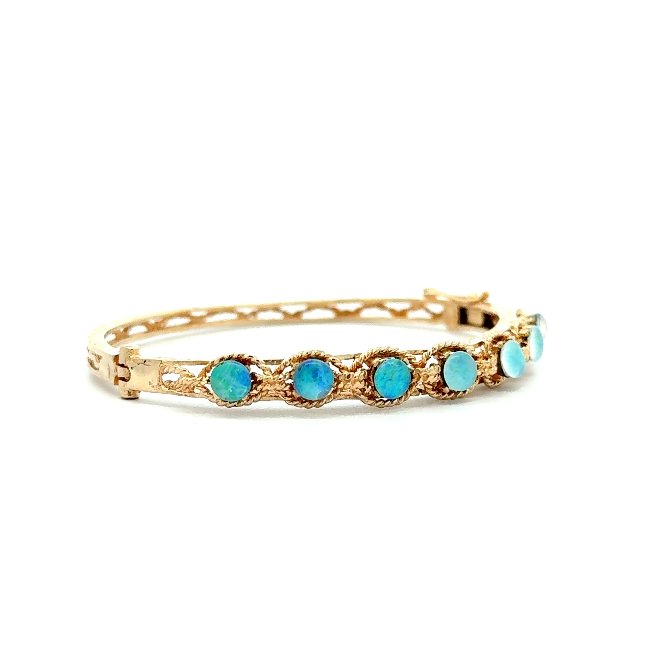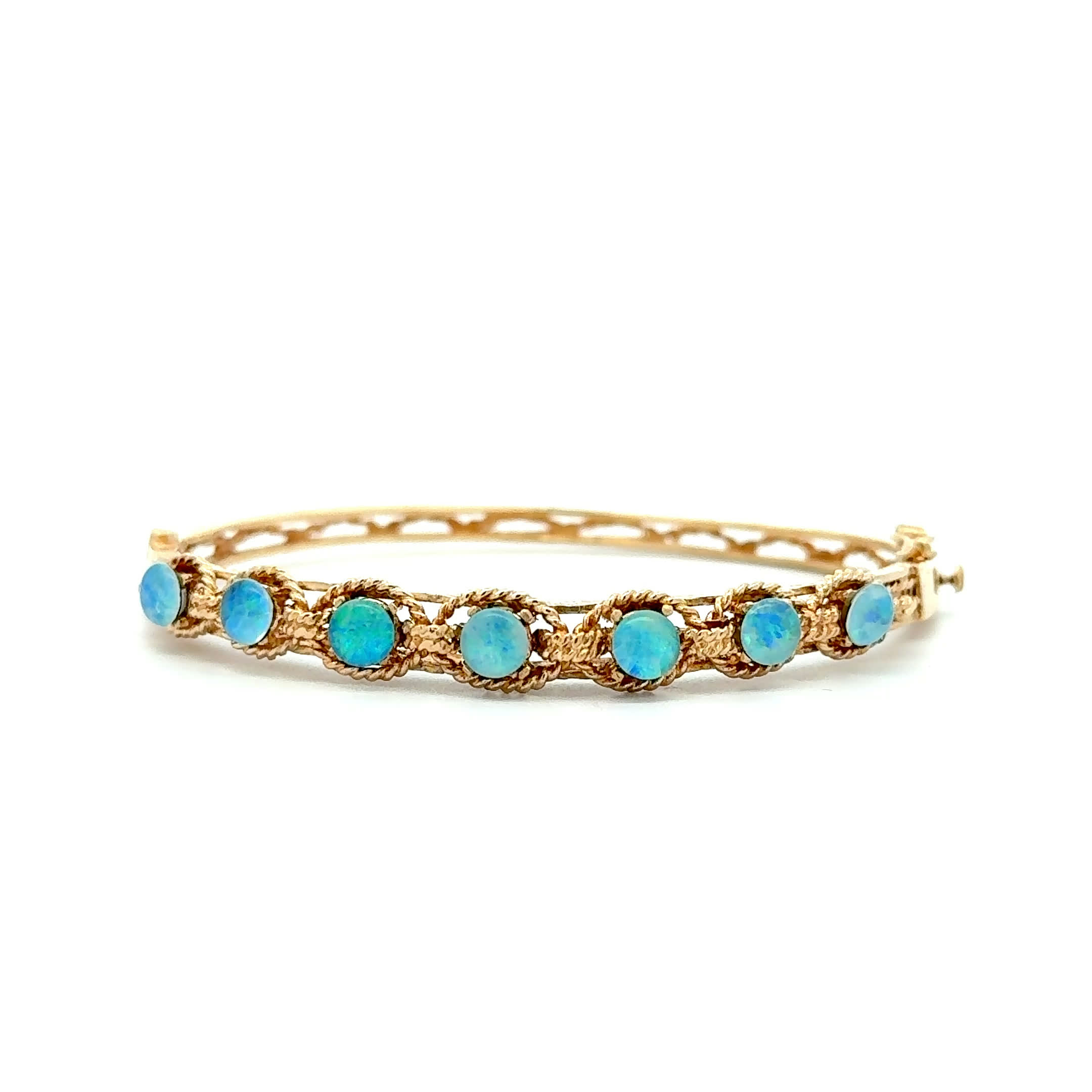 Wie ein Regenbogen um Ihr Handgelenk – dieser zauberhafte Vintage-Armreif aus den goldenen 1950ern lässt mit seinen schimmernden Opalen jeden Tag zu einem farbenfrohen Traum werden. Das warme 14 Karat Gelbgold umhüllt Sie mit zeitloser Eleganz, während die lebendigen Opale Ihre Persönlichkeit in allen Facetten zum Strahlen bringen. Ein seltenes Juwel, das nicht nur Blicke verzaubert, sondern auch das Herz mit seiner einzigartigen Vintage-Seele berührt.