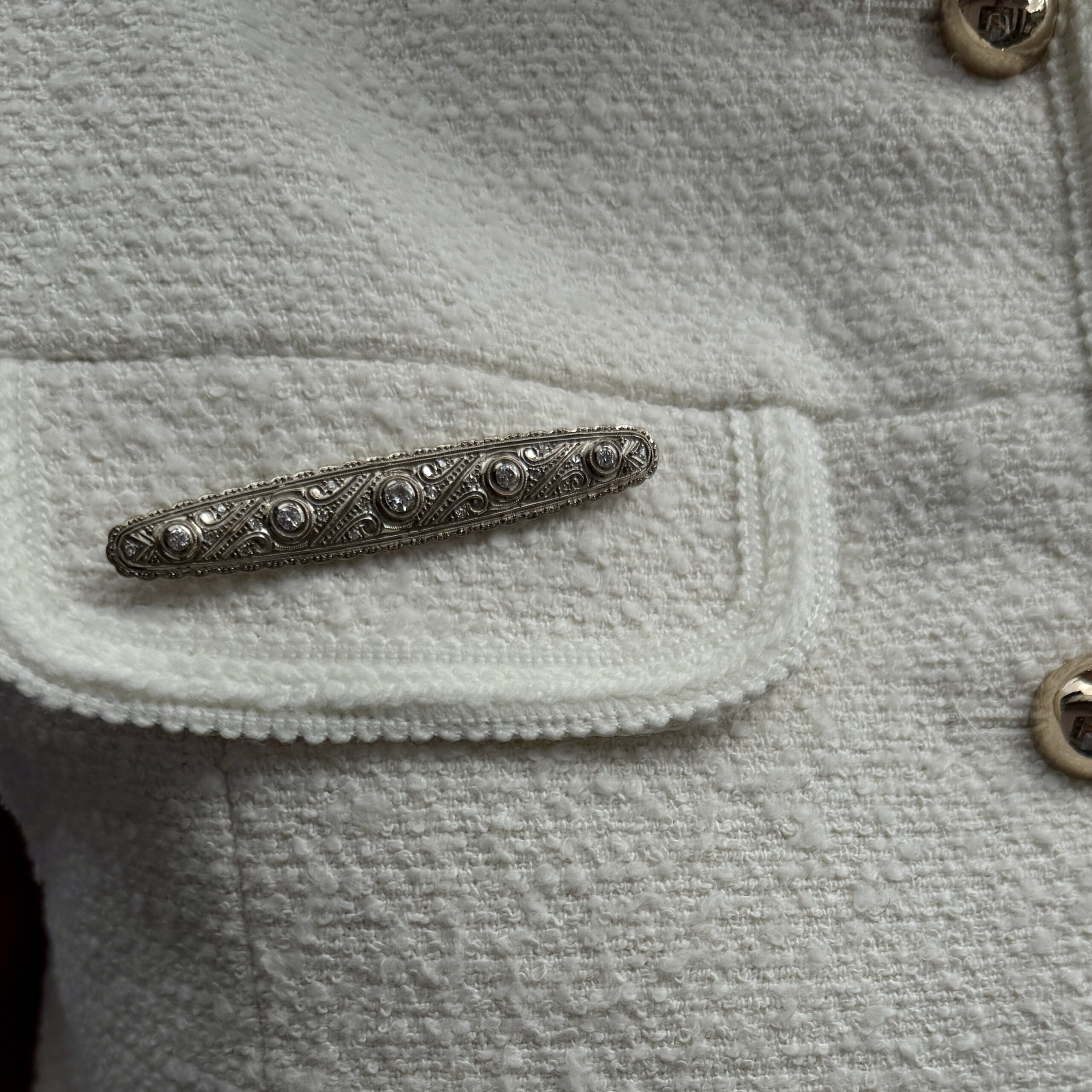 Diese elegante Art Deco Stabbrosche aus den goldenen Zwanzigern trägt die Seele einer ganzen Epoche in sich – wenn das zarte Milgrain-Dekor und die funkelnden Altschliff-Diamanten das Licht einfangen, erwachen Träume von Eleganz und zeitloser Raffinesse zum Leben. Ein Schmuckstück, das nicht nur Ihr Outfit krönt, sondern Sie mit der glamourösen Aura vergangener Zeiten umhüllt und jeden Moment zu etwas Besonderem macht.