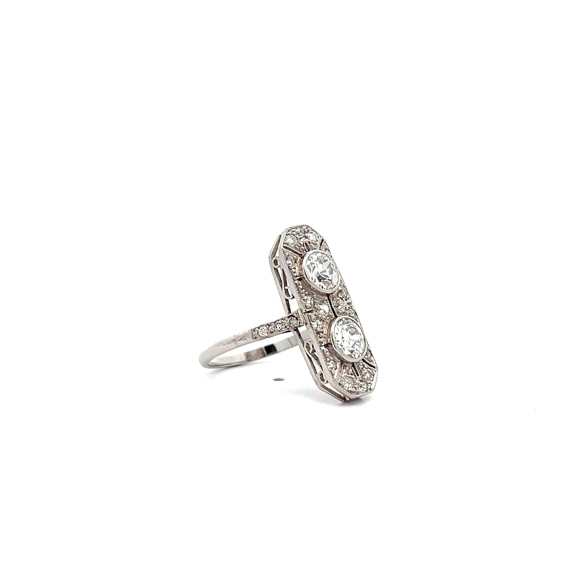 Ein Ring, der die goldenen Zwanziger zum Leben erweckt – dieser Art Déco Traum aus Platin trägt die Seele einer ganzen Epoche in sich. Seine funkelnden Altschliff-Diamanten flüstern Geschichten von glamourösen Nächten und großen Liebeserklärungen, während seine zeitlose Eleganz auch heute noch Herzen zum Beben bringt. Ein Schmuckstück für Momente, die das Leben prägen – ein Versprechen, das ein Jahrhundert überdauert hat.