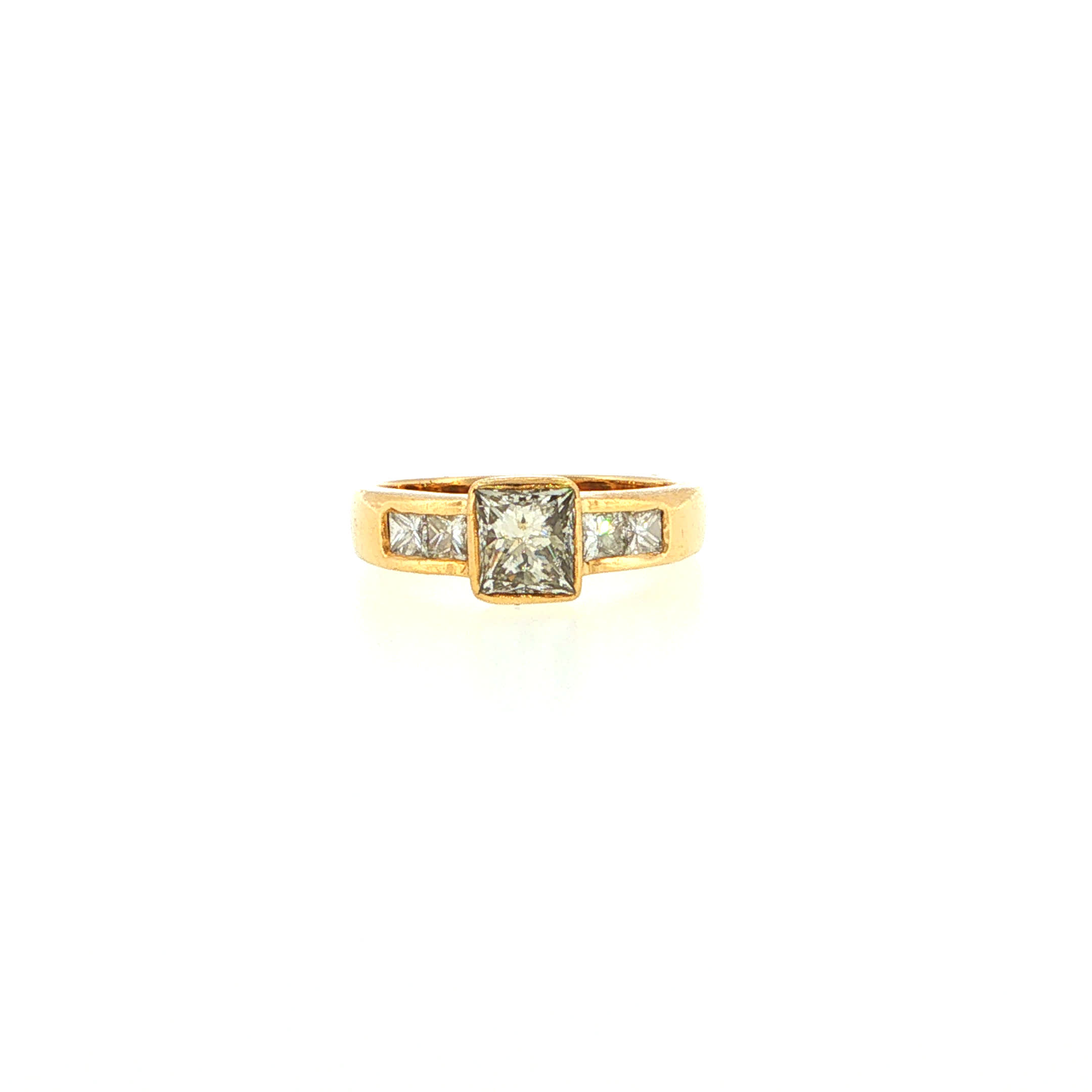 Dieser außergewöhnliche "Big Fancy" - Vintage Ring 18 Karat Gelbgold mit Diamanten aus der exklusiven Kollektion von Juwelier Steiger ist ein Meisterwerk der Goldschmiedekunst. In kostbarem 750er Gelbgold gefasst, spiegelt er höchste Qualitätsansprüche wider. Gekrönt mit 1 Fancy Cut ca. 1.20 ct P / getönt 4 Princess Cut Diamanten zus. 0.20 ct. Si / getönt, erzählt er von besonderen Momenten und ewiger Verbindung. Ein Symbol für Perfektion und bleibende Werte.