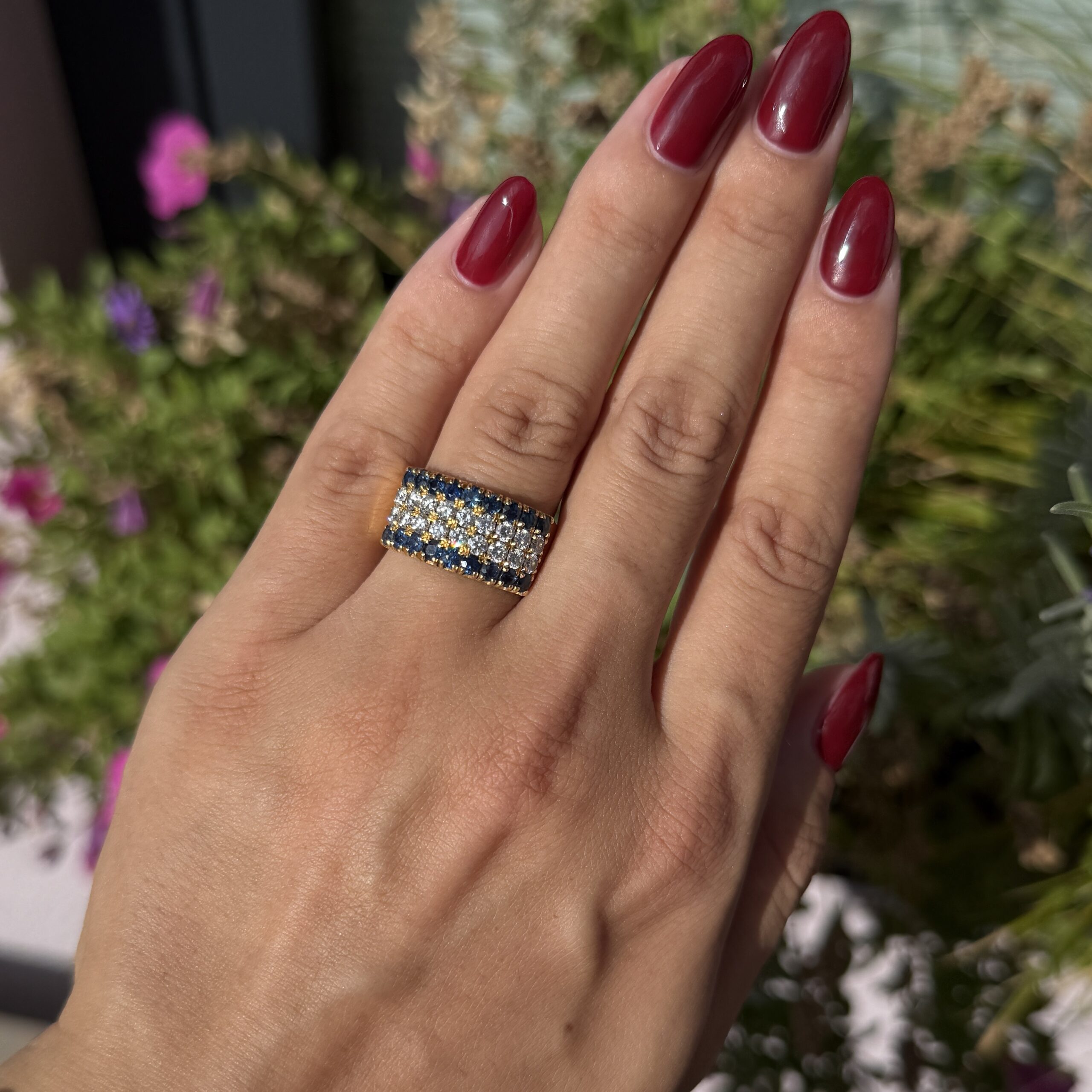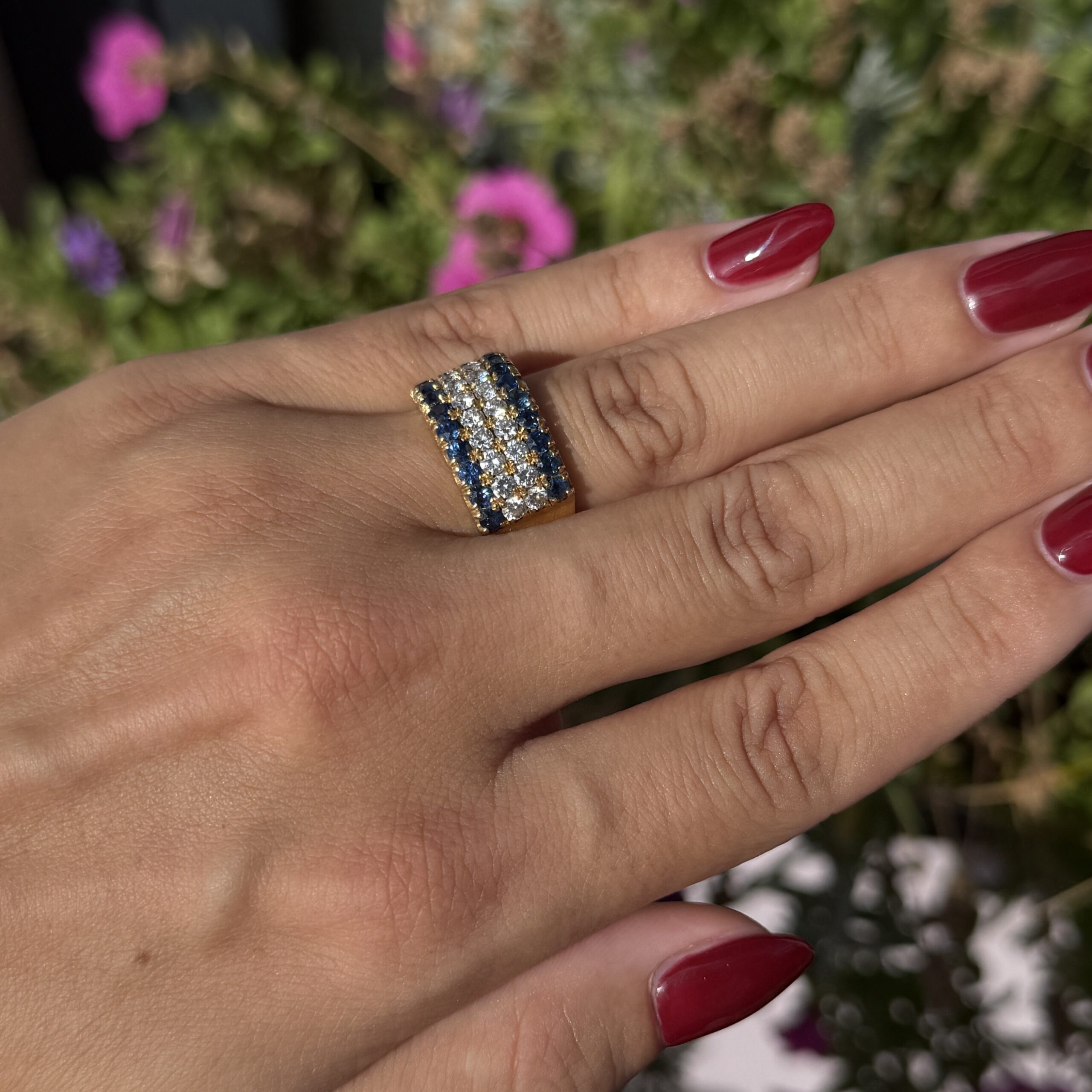 Der „Blue Crown" ist mehr als ein Ring – er ist eine Liebeserklärung an die Ewigkeit, wo 18 funkelnde Brillanten und tiefblaue Saphire in warmem Gelbgold zu einer königlichen Symphonie verschmelzen. Dieser Vintage-Schatz trägt die Geheimnisse vergangener Liebesgeschichten in sich und wartet darauf, Teil Ihrer eigenen zu werden. Spüren Sie, wie er an Ihrem Finger nicht nur Eleganz, sondern pure Magie entfaltet – ein Versprechen, das für immer währt.