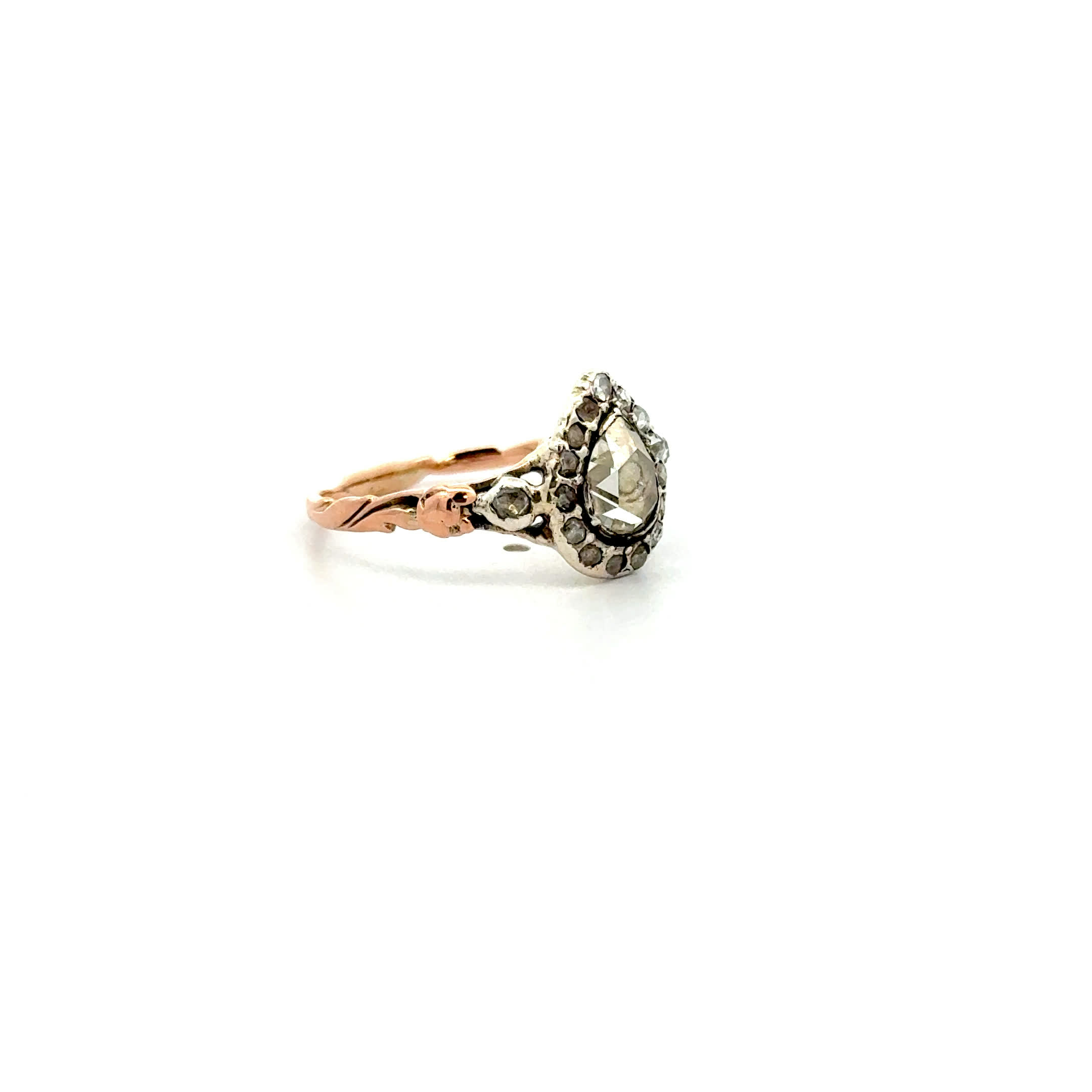 Wie sanftes Mondlicht auf zarter Haut schmiegt sich diese antike Schönheit aus den 1890er Jahren an Ihren Finger – ein Hauch von Ewigkeit in warmem Roségold. Die Diamantrosen flüstern Geschichten längst vergangener Liebesschwüre und werden nun zu Ihrem ganz persönlichen Märchen aus Licht und Zeit. Ein Ring, der nicht nur schmückt, sondern Ihre Seele zum Strahlen bringt.