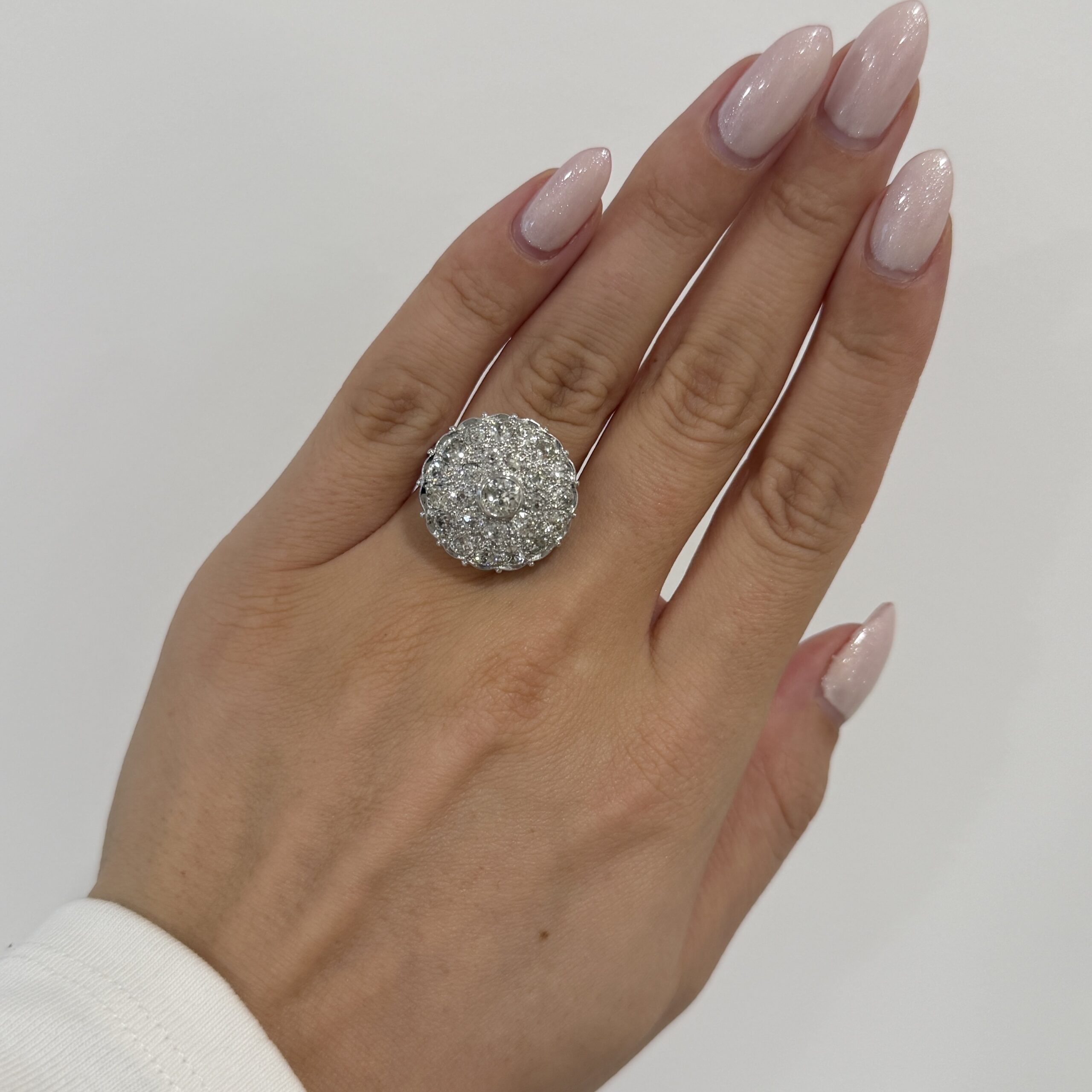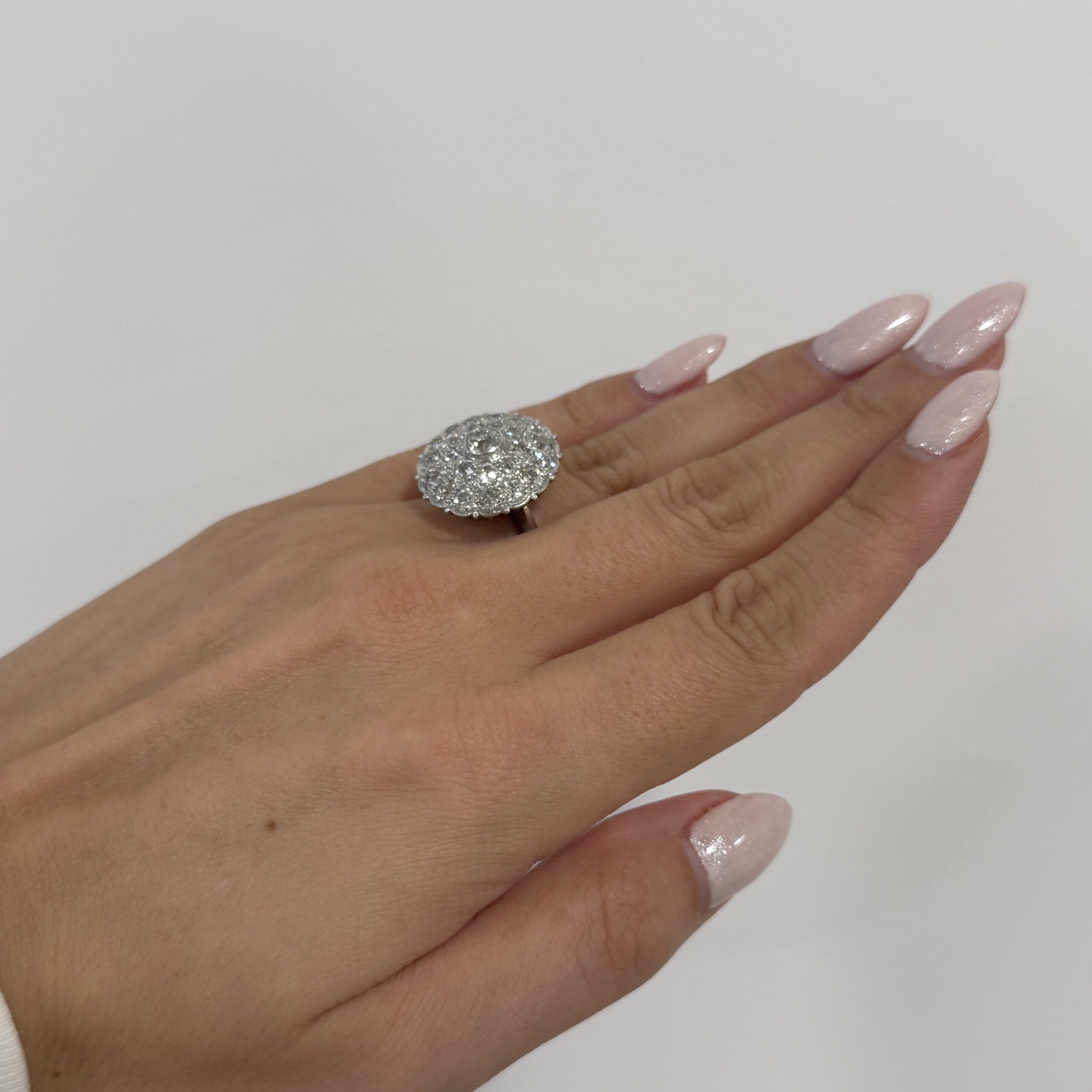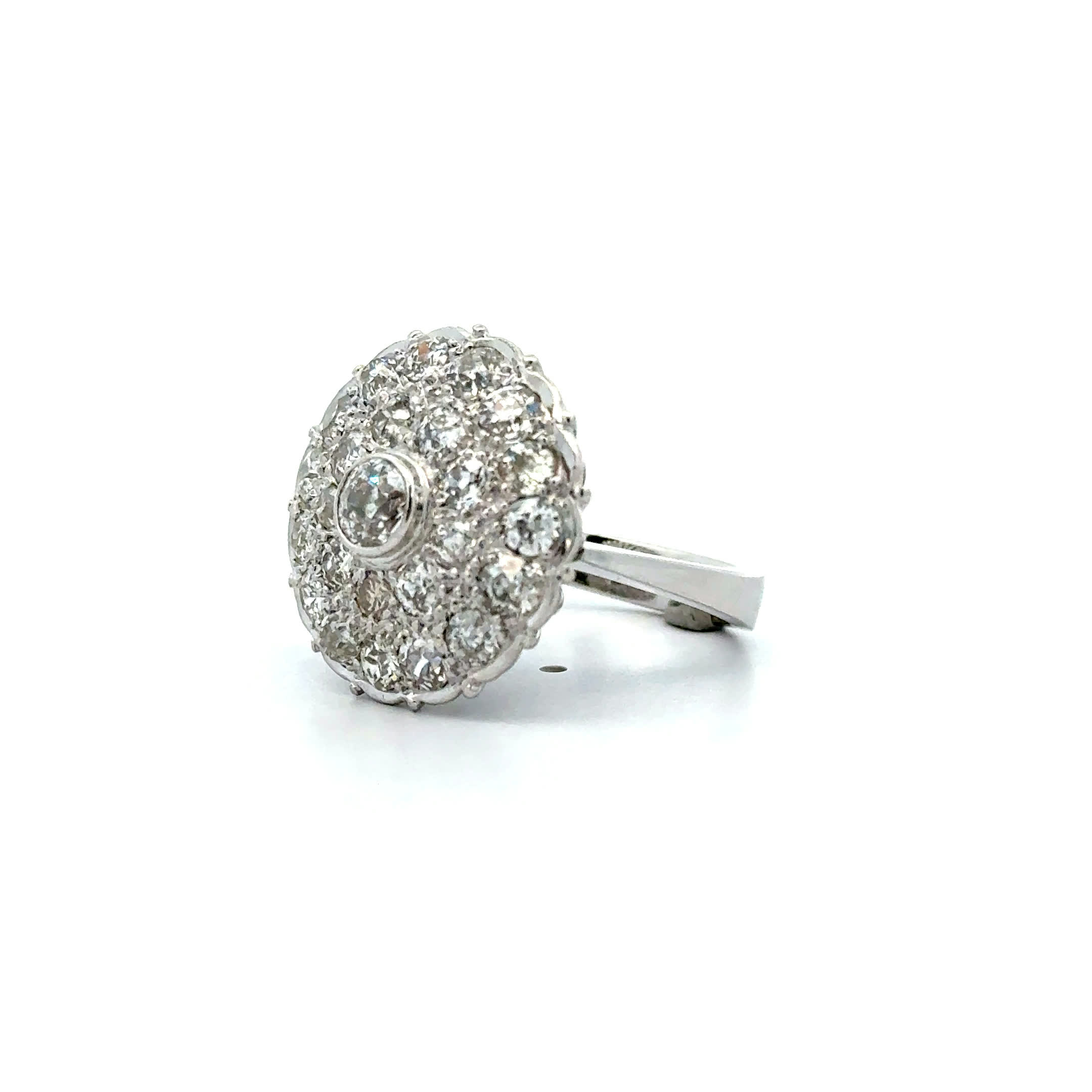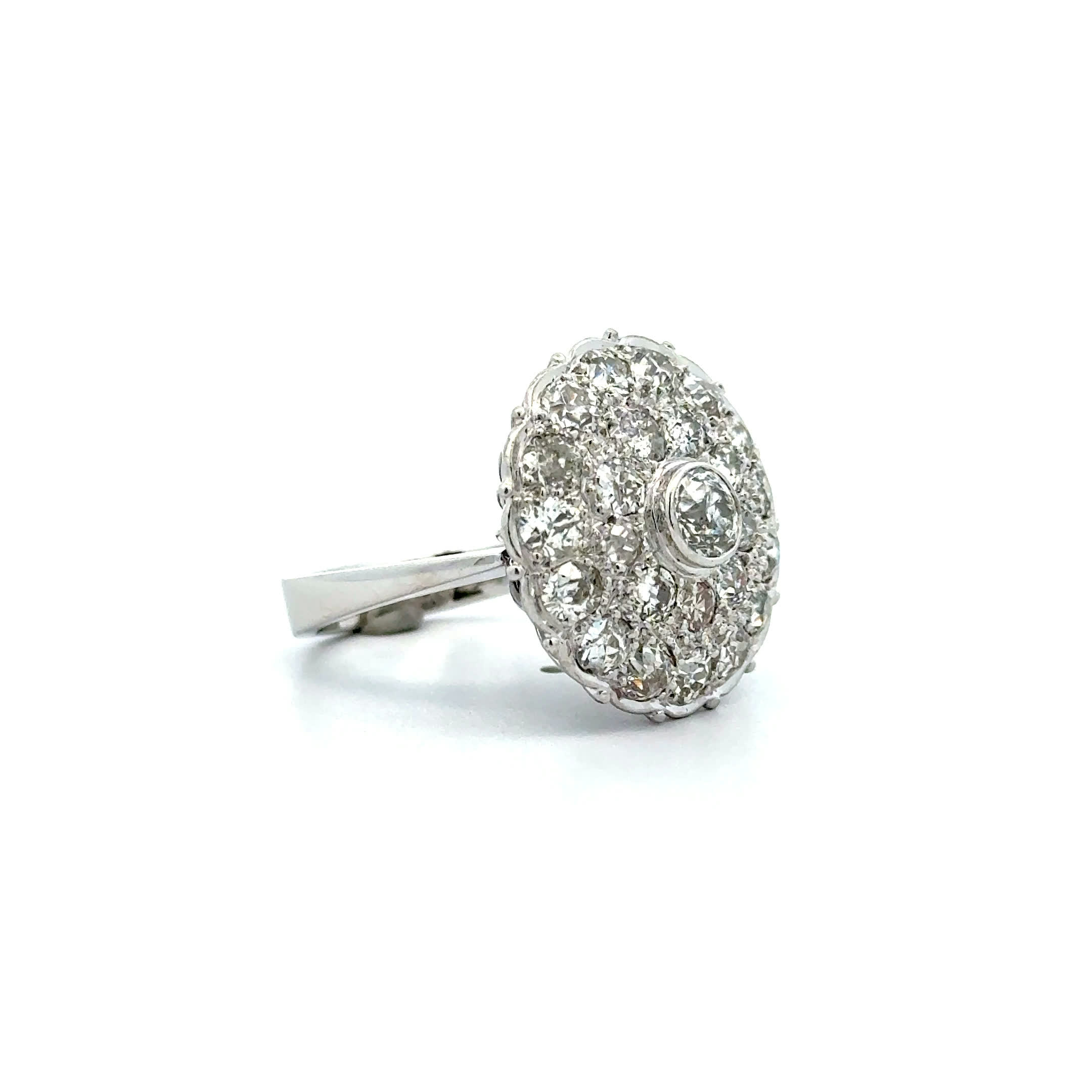Ein Ring, der Geschichten von unvergesslichen Momenten flüstert – 25 funkelnde Altschliff-Diamanten tanzen wie Sterne am nächtlichen Himmel und verwandeln jeden Augenblick in pure Magie. Seine zeitlose Eleganz aus 750er Weißgold umschmeichelt Ihren Finger wie ein sanftes Versprechen ewiger Schönheit. Spüren Sie, wie dieser außergewöhnliche Vintage-Schatz Ihr Herz zum Leuchten bringt und Träume von besonderen Augenblicken wahr werden lässt.