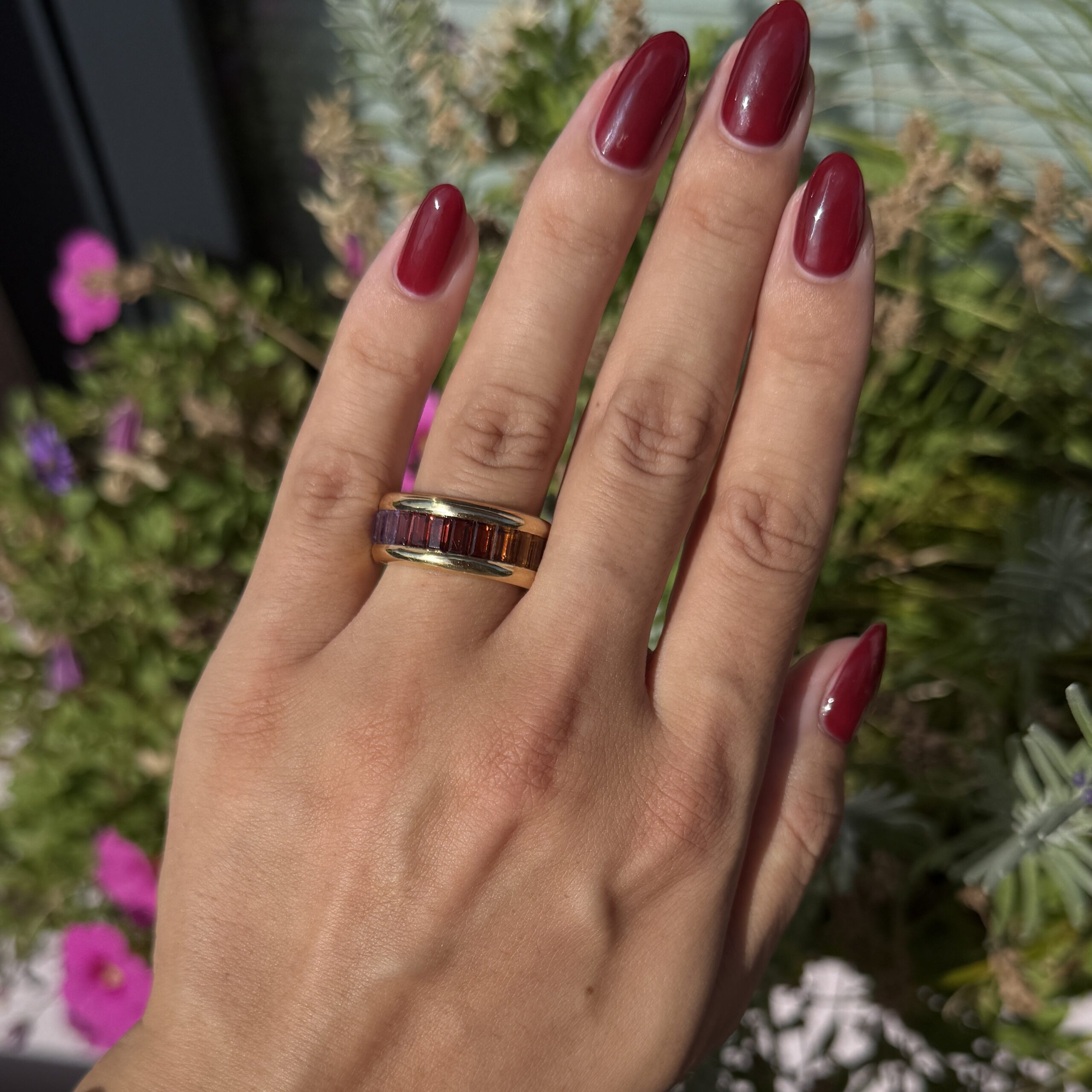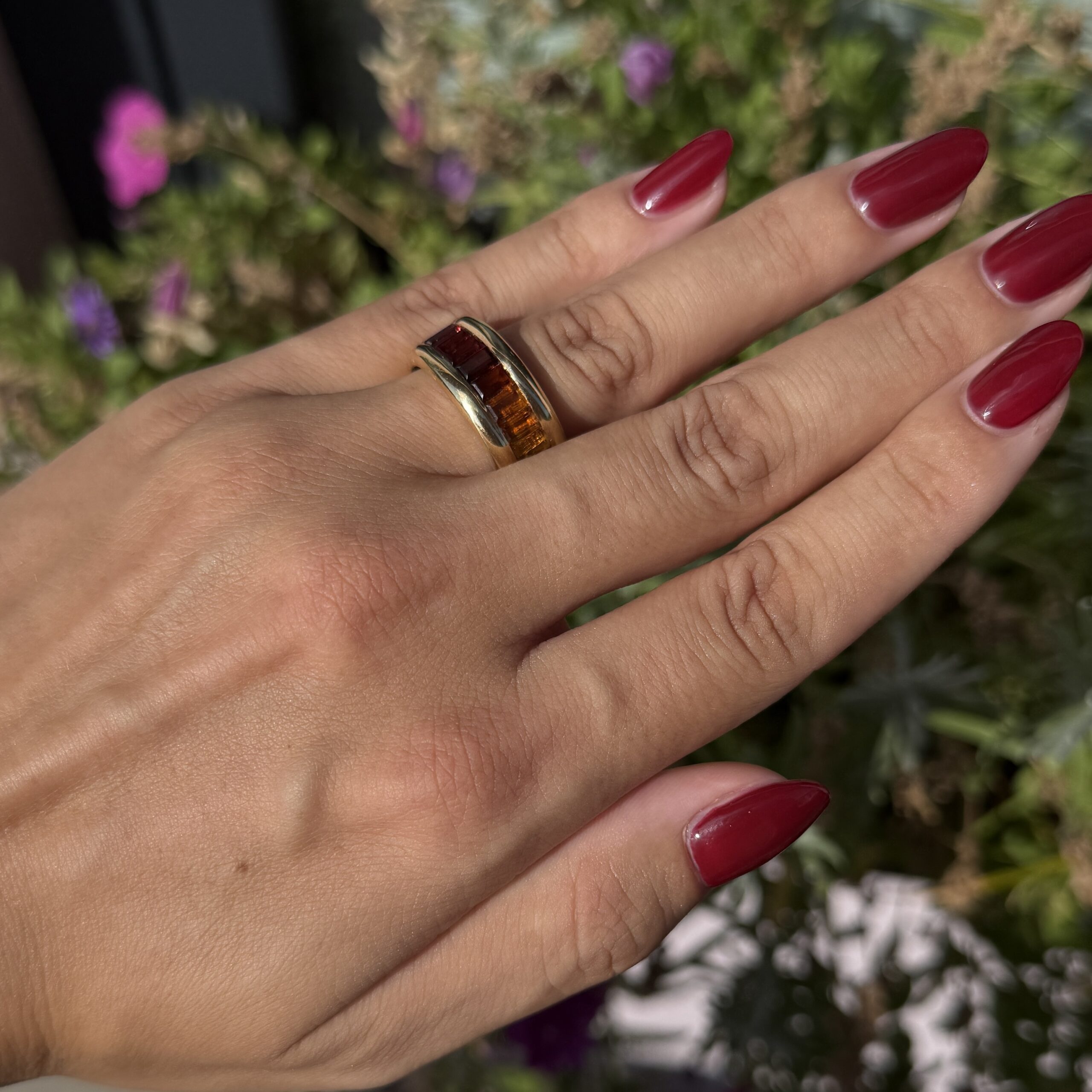 „Buntes Band" – ein Vintage-Juwel aus 18 Karat Gelbgold, das wie ein Regenbogen aus vergangenen Zeiten am Finger erstrahlt. 25 zauberhafte Farbsteine tanzen in perfekter Harmonie und erzählen Geschichten von Leidenschaft, Träumen und unvergesslichen Augenblicken. Ein Ring, der nicht nur schmückt, sondern die Seele berührt und jeden Tag zu einem besonderen Moment werden lässt.