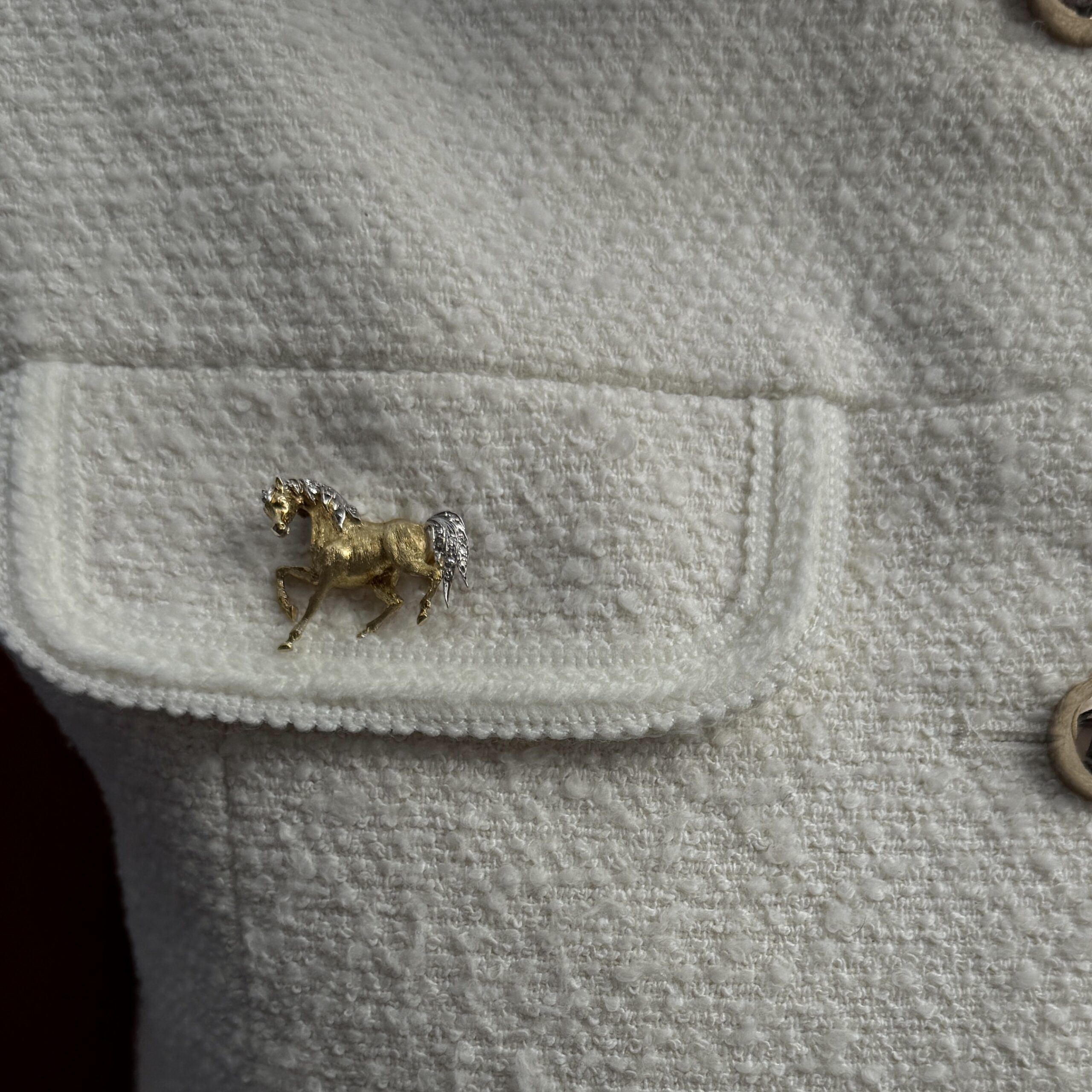 Diese zauberhafte Gelbgold-Brosche aus den 1960er Jahren trägt die Seele einer ganzen Epoche in sich – funkelnde Diamanten im klassischen 8/8 Schliff verleihen ihr einen zeitlosen Glanz, der Herzen zum Leuchten bringt. Ein Schmuckstück, das nicht nur Blicke auf sich zieht, sondern Geschichten erzählt und kostbare Momente für die Ewigkeit bewahrt. Cheval d'Or – ein goldenes Pferd, das Sie auf einer Reise voller Eleganz und Erinnerungen begleitet.