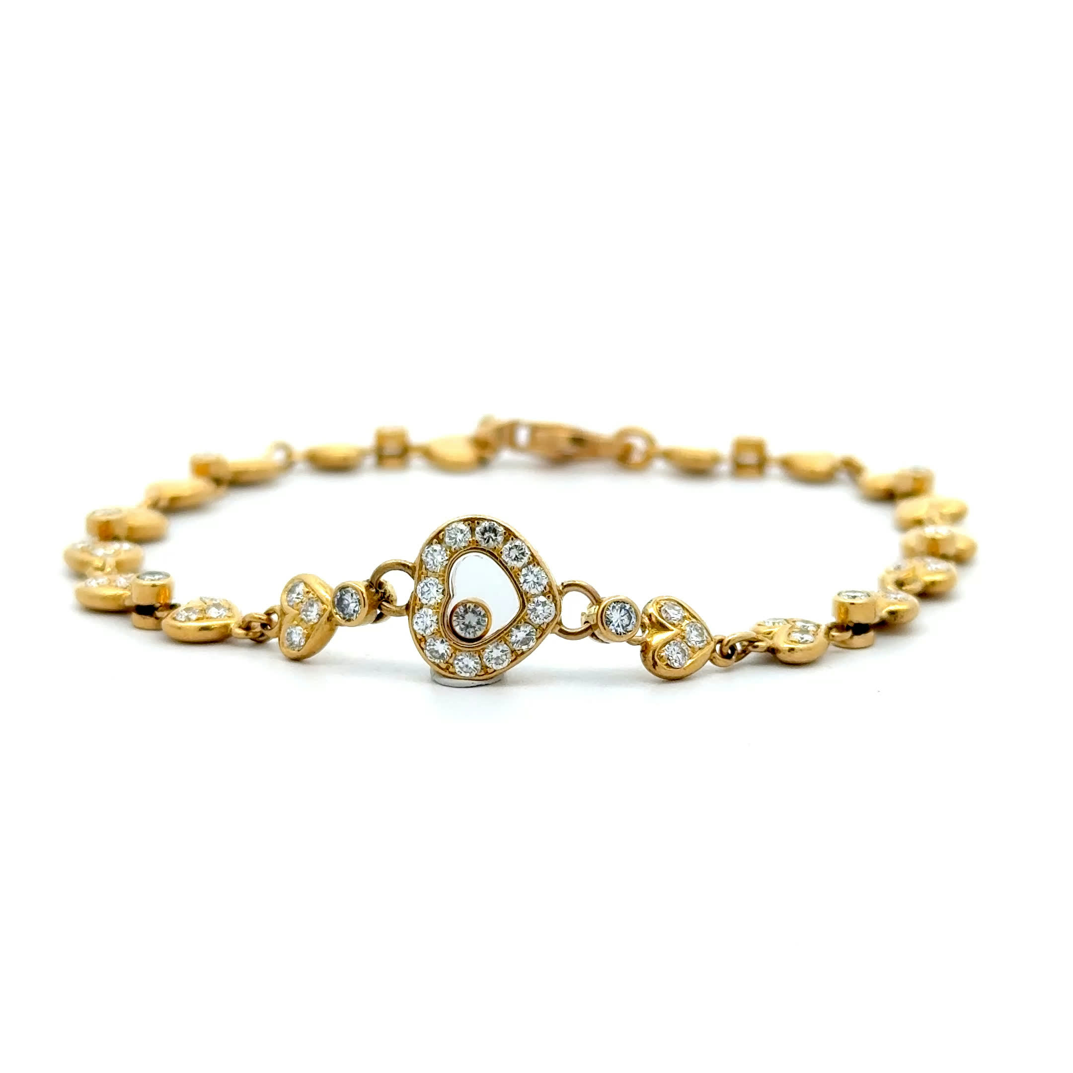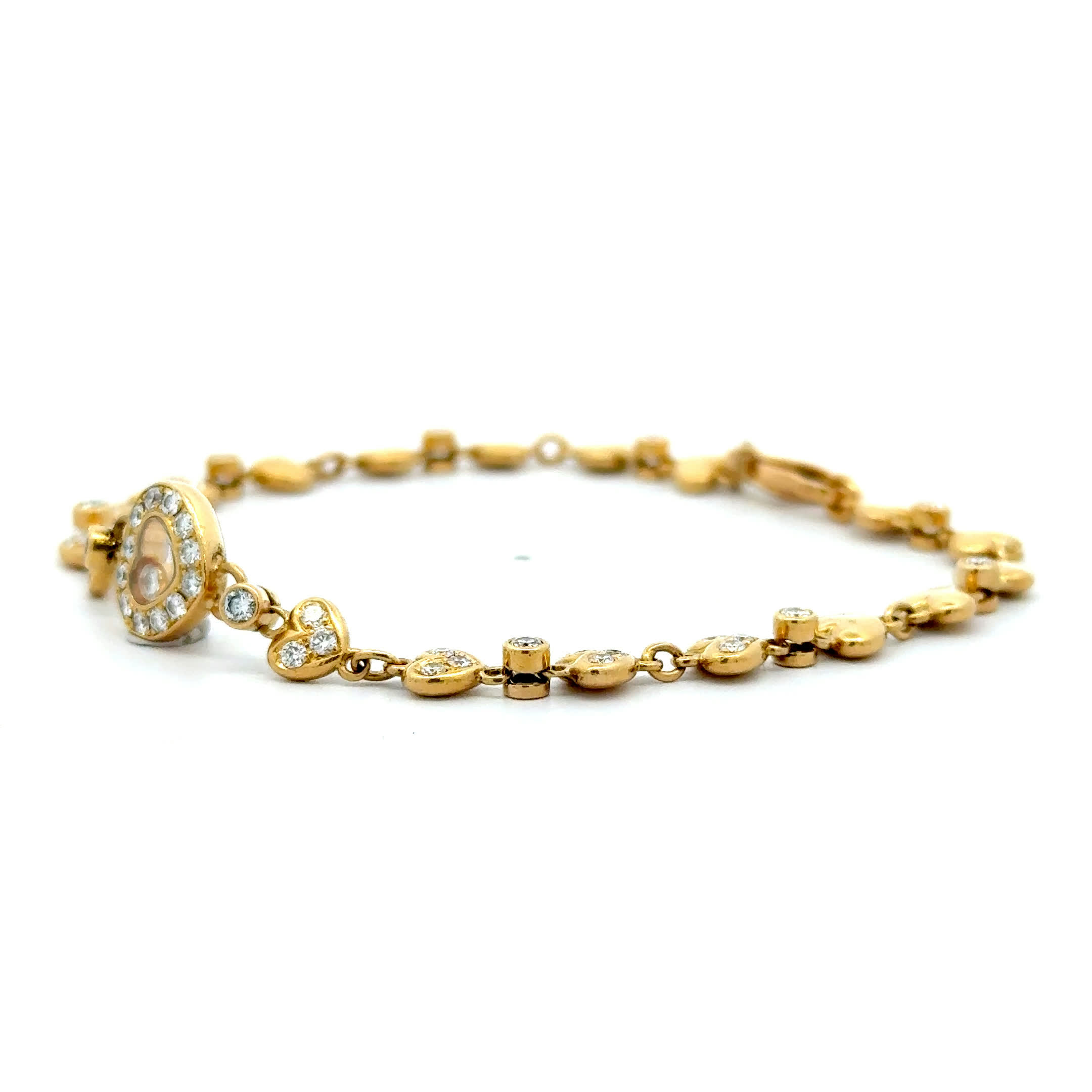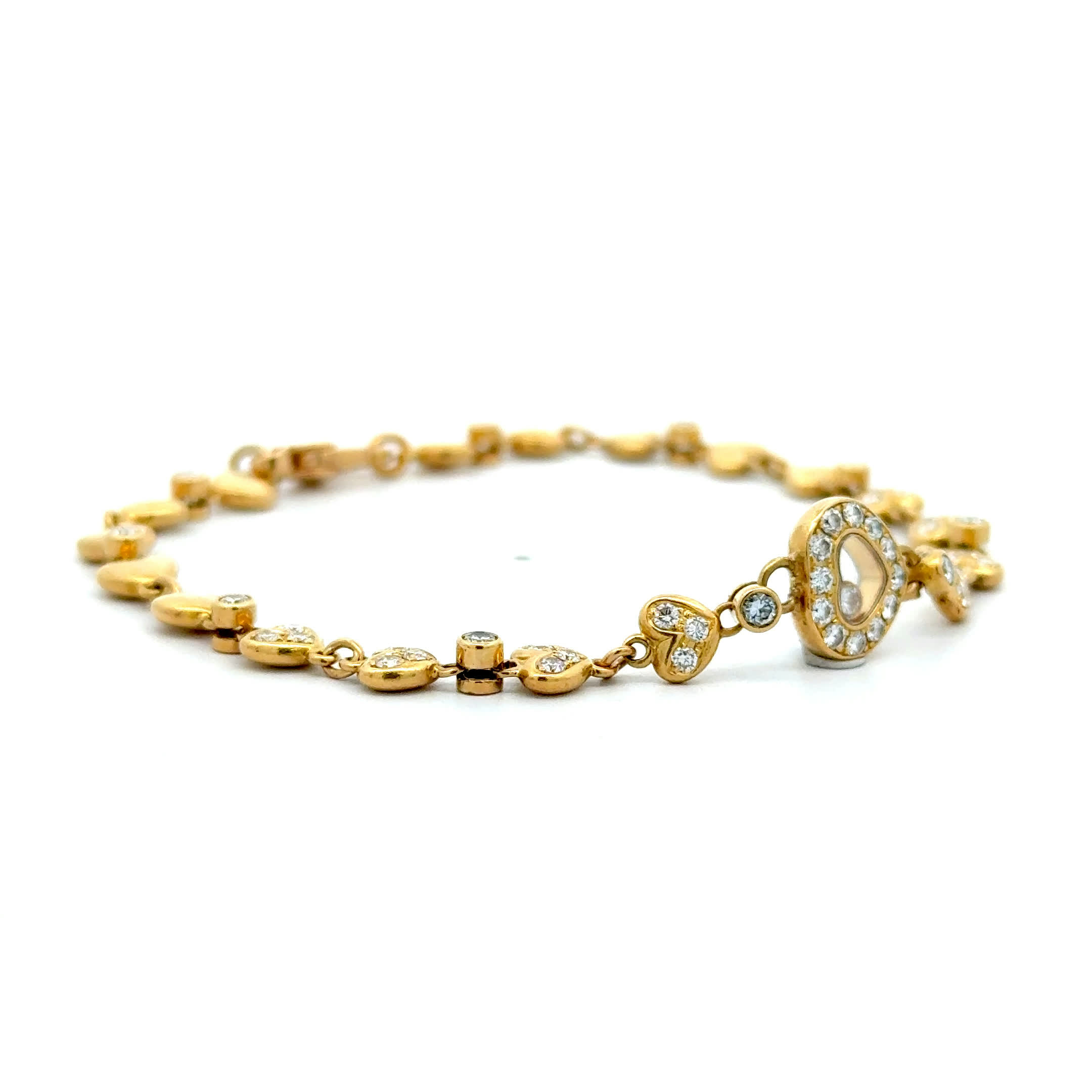 Ein Armband, das Ihr Herz zum Funkeln bringt – "Chopard with a Heart" vereint die Ewigkeit von 18 Karat Gold mit dem sanften Schimmer von Diamanten, die jede Ihrer Bewegungen in pure Poesie verwandeln. Dieses vintage Juwel flüstert Geschichten von unvergesslichen Momenten und wird zur zarten Umarmung um Ihr Handgelenk, die Sie an all die kostbaren Augenblicke erinnert, die das Leben so wertvoll machen. Tragen Sie nicht nur Schmuck – tragen Sie ein Stück Glück, das mit jedem Herzschlag Ihre innerste Schönheit zum Strahlen bringt.