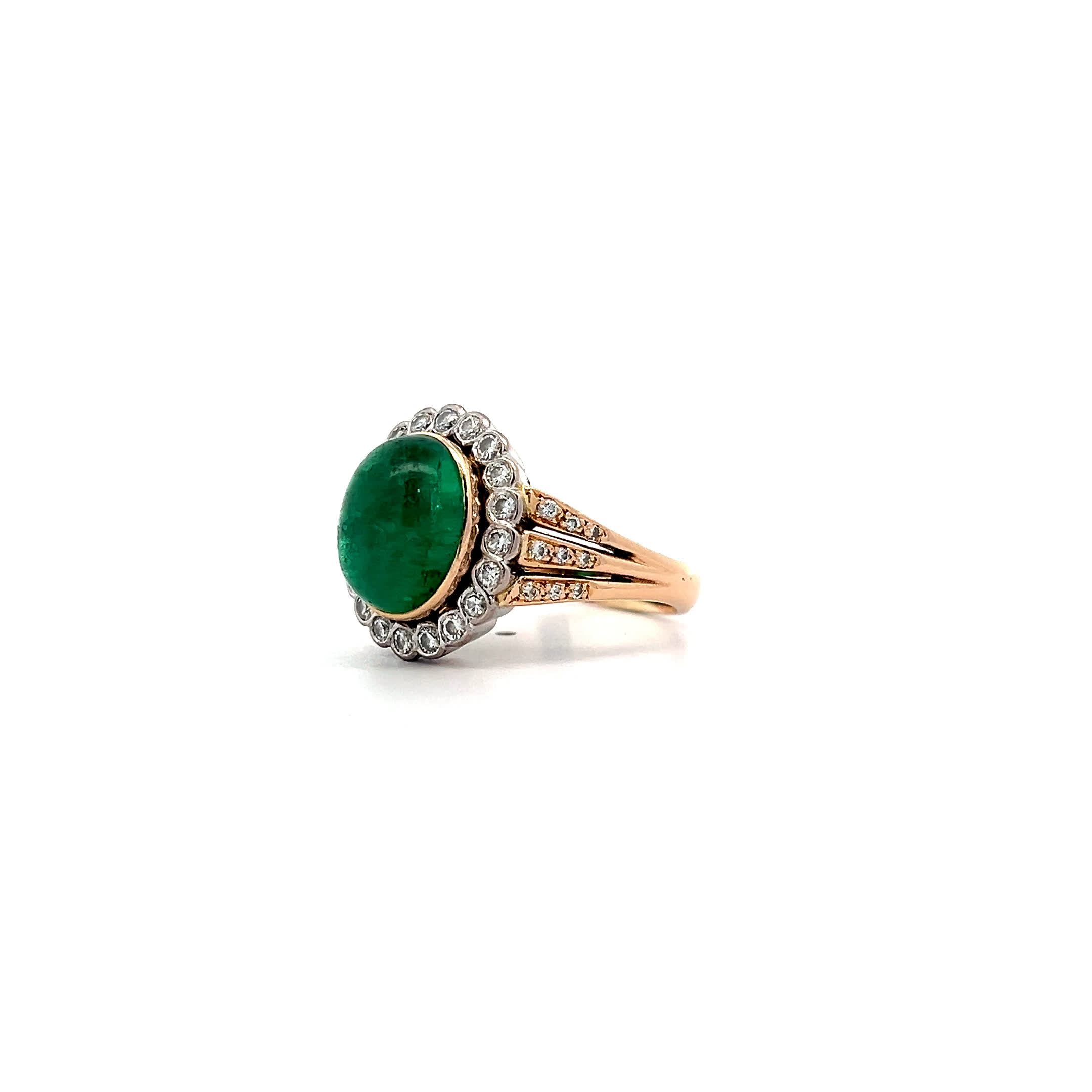 Wie eine Königin aus längst vergangenen Zeiten thront dieser außergewöhnliche Smaragd-Ring an Ihrem Finger – ein 6,04 Karat schwerer Smaragd-Cabochon, umhüllt von funkelnden Brillanten, die wie Sterne um seine tiefgrüne Seele tanzen. Seine warme Gelbgold-Fassung flüstert Geschichten von Eleganz und zeitloser Schönheit, während der majestätische Smaragd jeden Blick magisch anzieht und Sie zur strahlenden Protagonistin Ihrer eigenen Geschichte macht. Ein Schmuckstück, das nicht nur getragen wird – es verwandelt jeden Moment in pure Magie.