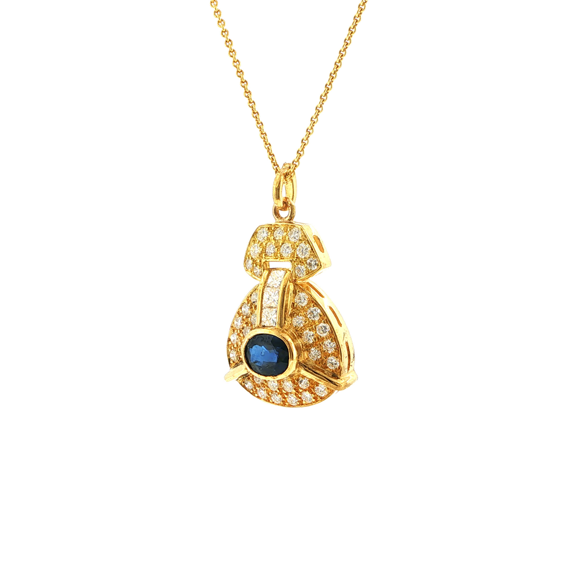 Der "Enterprise" Saphiranhänger ist wie ein Stück eingefangener Nachthimmel – sein tiefblauer Saphir flüstert von Geheimnissen und ewigen Träumen, während die funkelnden Brillanten wie Sterne um ihn tanzen. Diese Vintage-Kostbarkeit in warmem 18 Karat Gelbgold trägt die Seele vergangener Epochen in sich und wird zum strahlenden Begleiter Ihrer schönsten Momente. Ein Schmuckstück, das nicht nur getragen wird, sondern Geschichten erzählt und Herzen berührt.