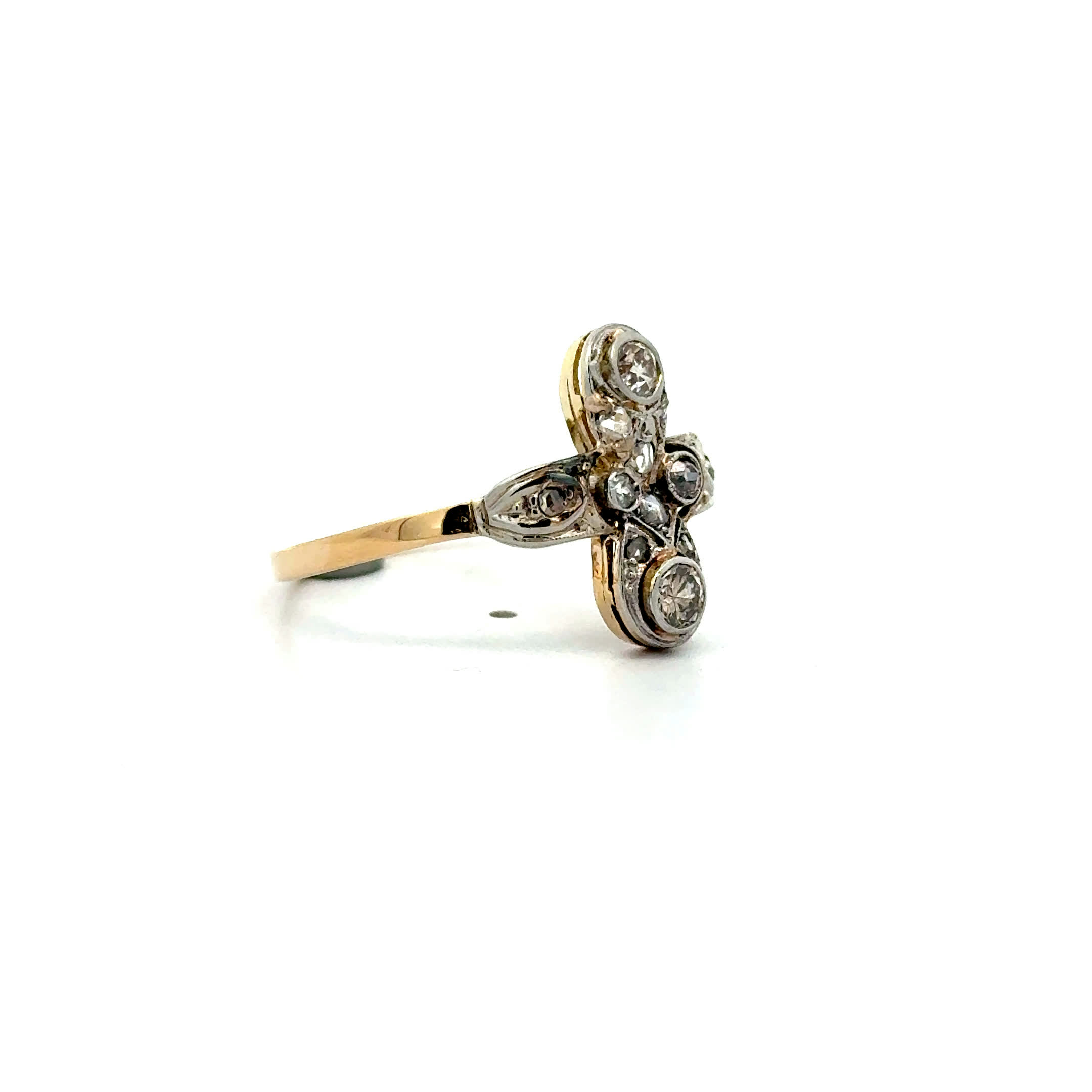 Ein zarter Hauch der Belle Époque, der seit über einem Jahrhundert von ewiger Liebe erzählt – dieser Jugendstil-Ring aus warmem Gelbgold trägt die Romantik vergangener Zeiten in sich. Seine floralen Linien und funkelnden Altschliff-Diamanten flüstern Geschichten von ersten Küssen und lebenslangen Versprechen, während er Ihre Hand mit der zeitlosen Eleganz der 1910er Jahre schmückt. Ein Schmuckstück, das nicht nur getragen wird, sondern das Herz berührt und Träume von großer Liebe wahr werden lässt.