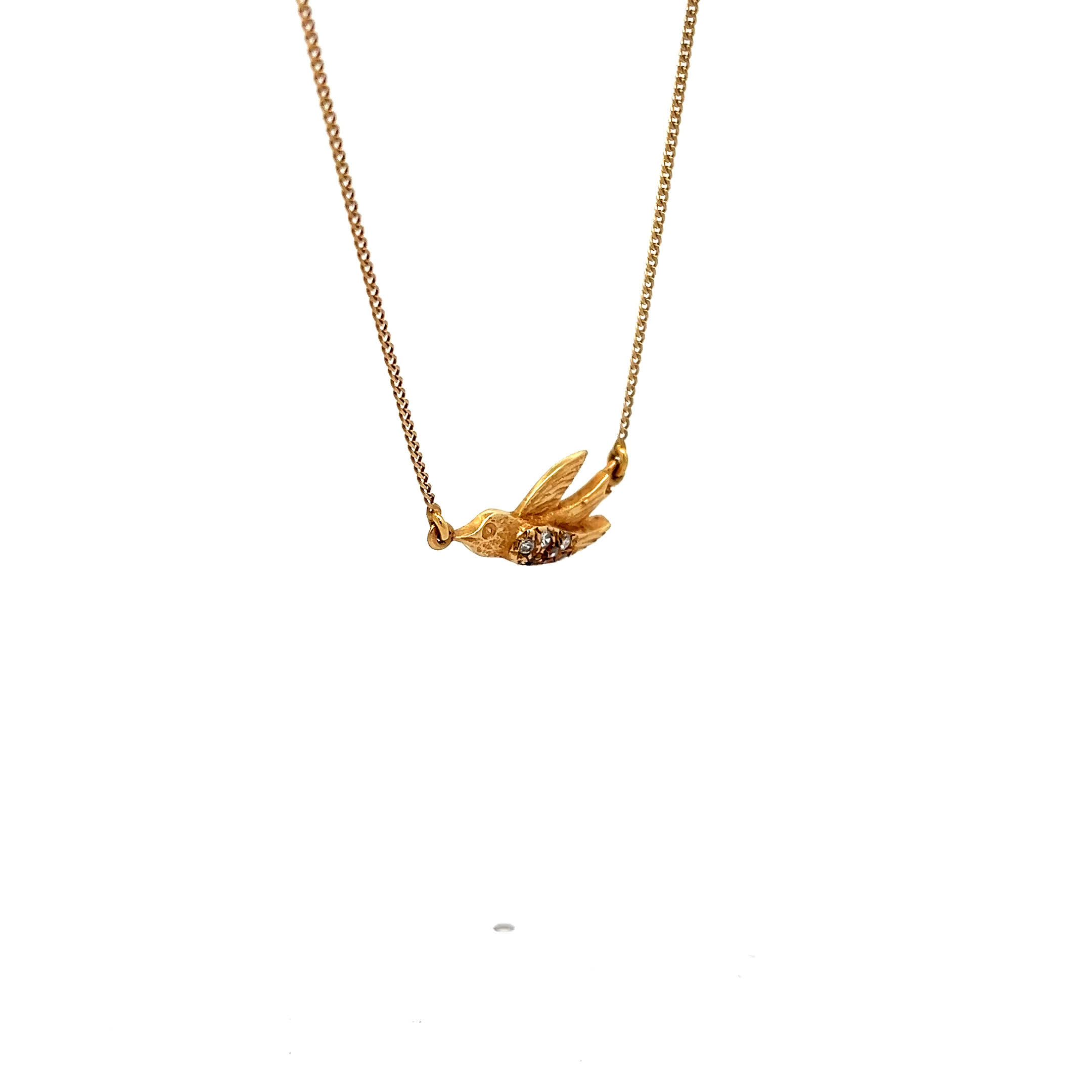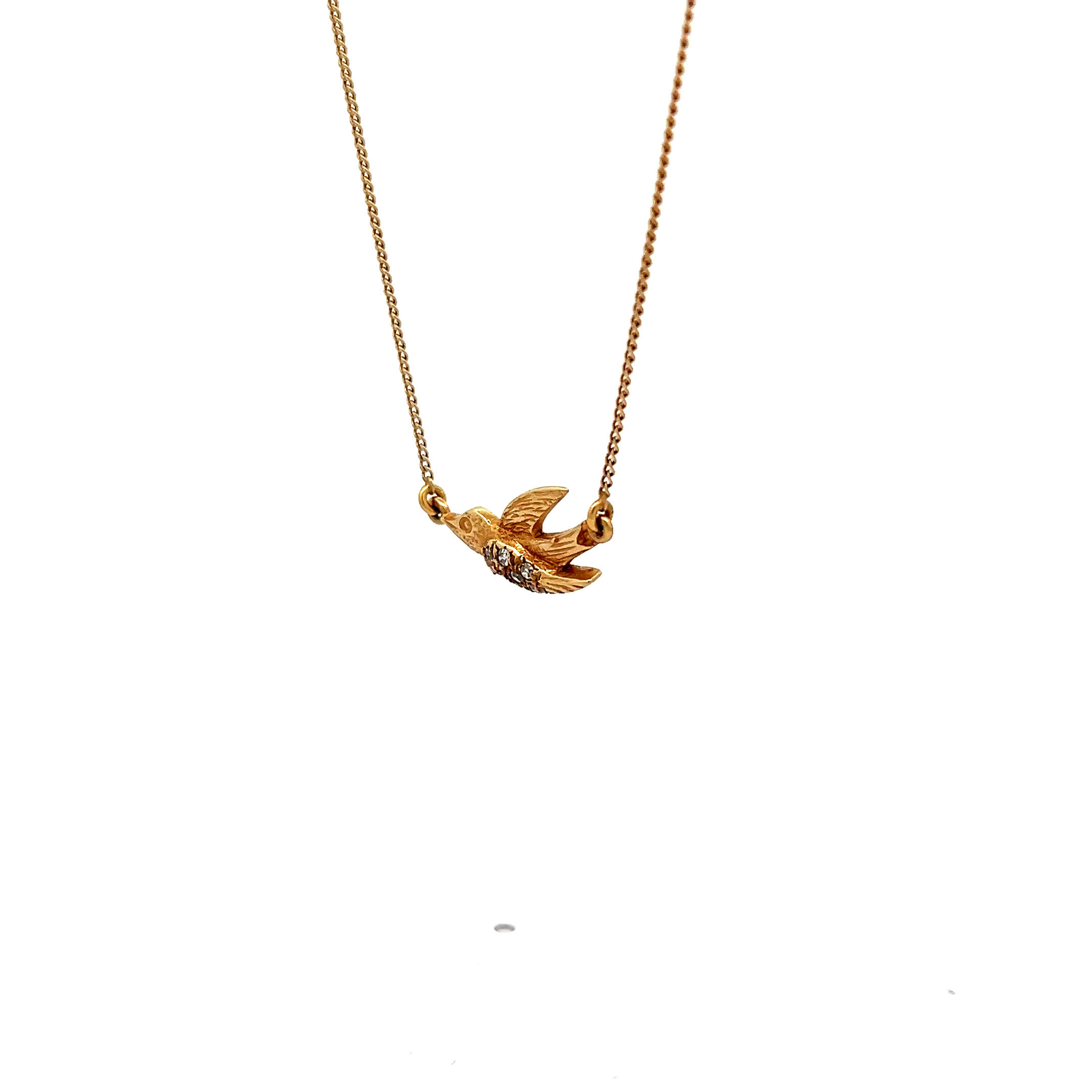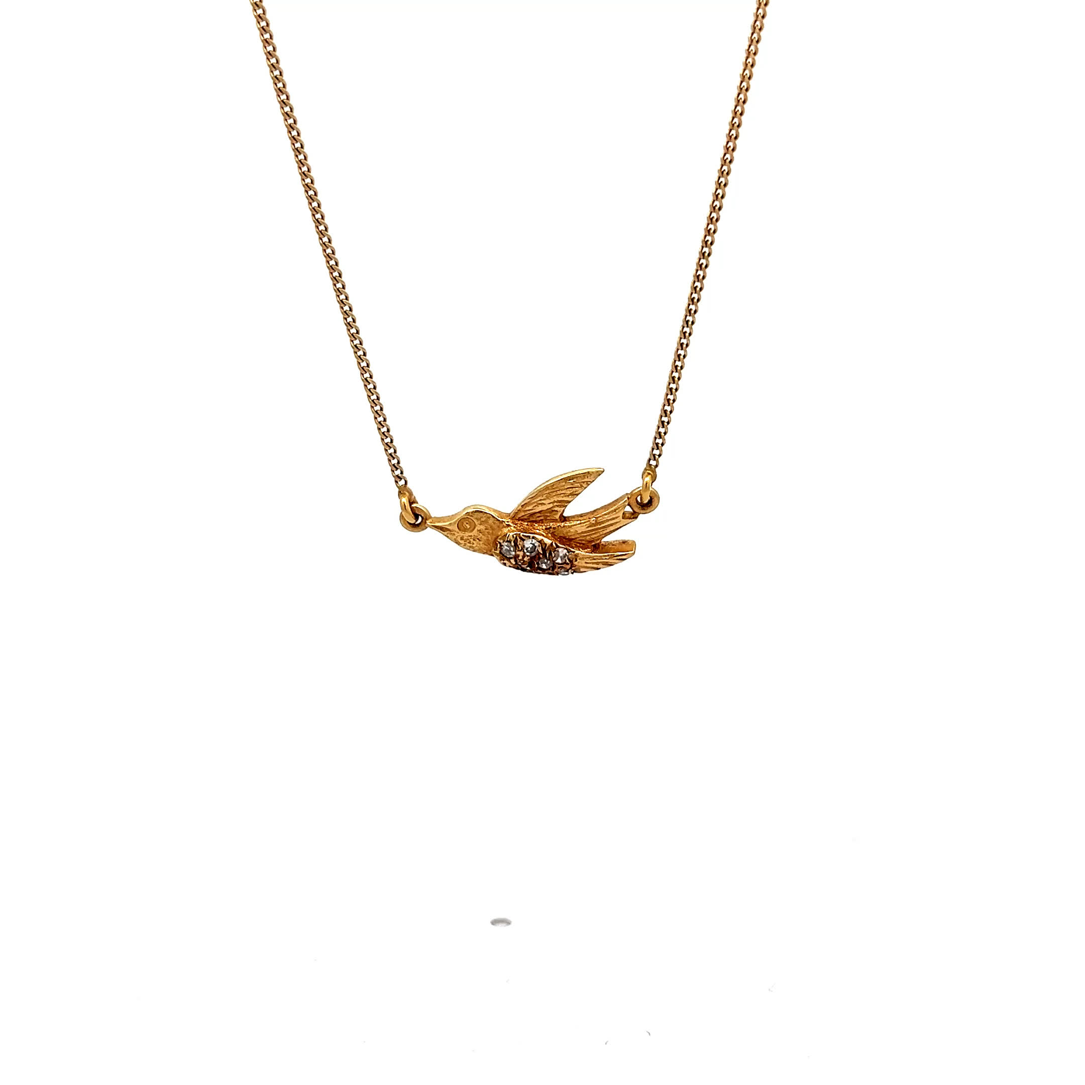 Wie ein Vogel im Flug trägt diese zauberhafte Vintage-Kette aus 585er Gelbgold Ihre Träume direkt an Ihr Herz – jeder der acht funkelnden Diamanten flüstert von der Leichtigkeit des Seins und der Schönheit unvergesslicher Augenblicke. Ein poetisches Schmuckstück, das mit jedem zarten Schimmer an warme Sommertage und die Sehnsucht nach grenzenloser Freiheit erinnert.
