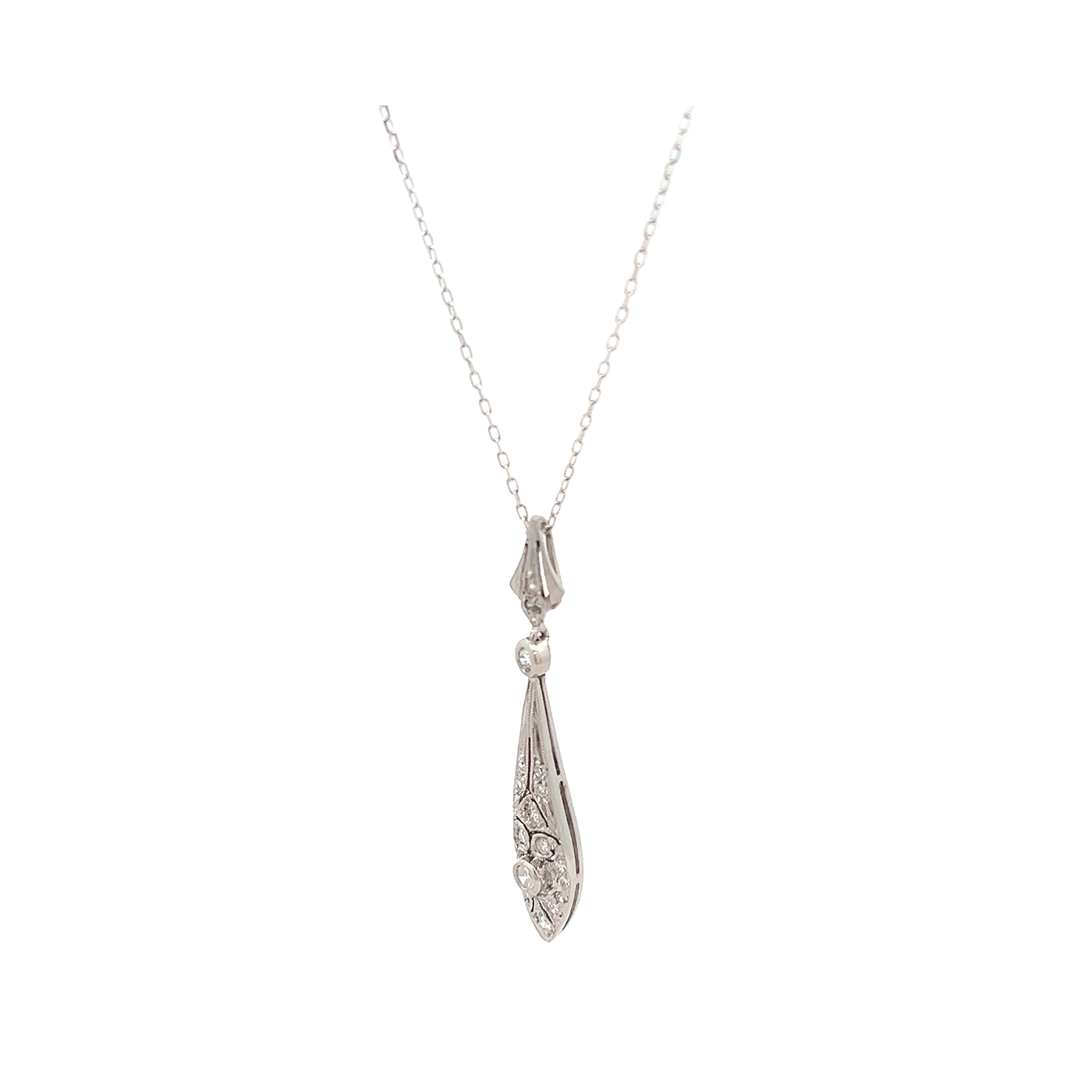 Ein zartes Zeugnis aus den goldenen 1940er Jahren – diese Weißgold-Kette trägt die Geheimnisse einer ganzen Epoche in sich und lässt acht funkelnde Diamanten wie Sterne vergangener Träume schimmern. Wenn sie sich sanft um Ihren Hals schmiegt, spüren Sie die warme Umarmung der Geschichte und werden selbst Teil einer zeitlosen Liebesgeschichte. Ein Schmuckstück, das nicht nur schmückt, sondern Seelen berührt und Herzen zum Leuchten bringt.
