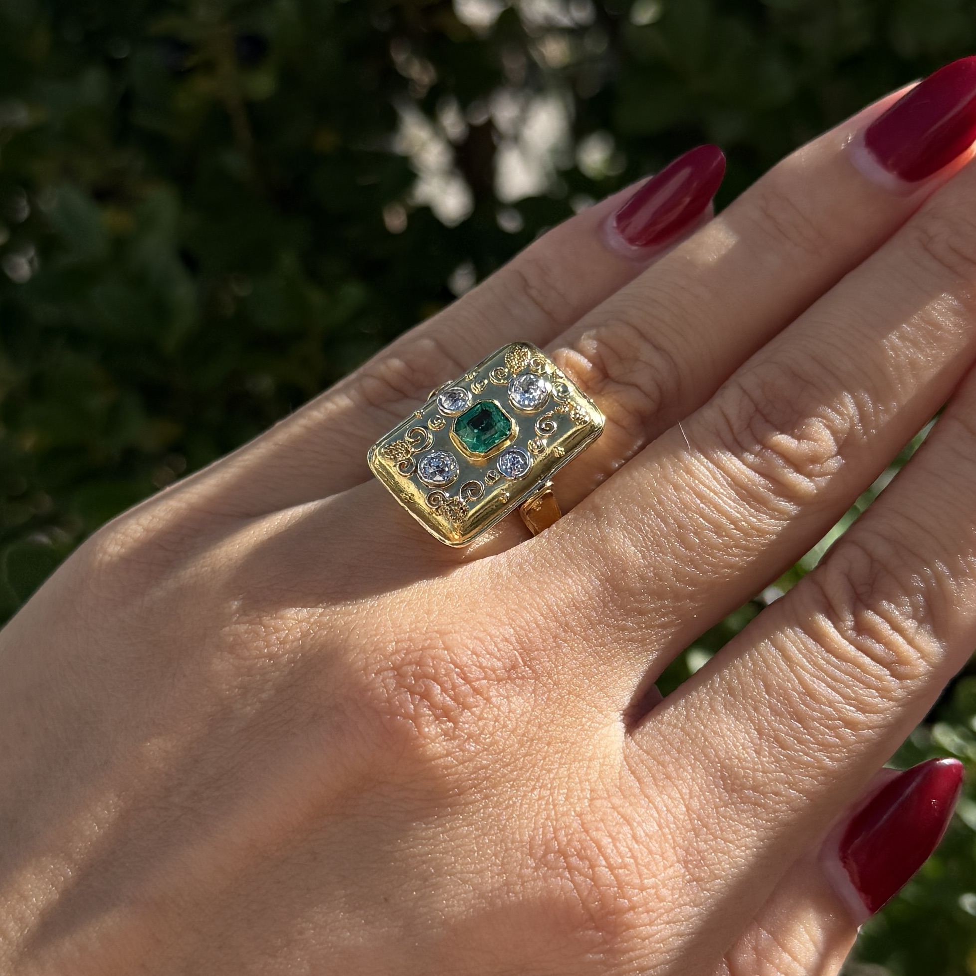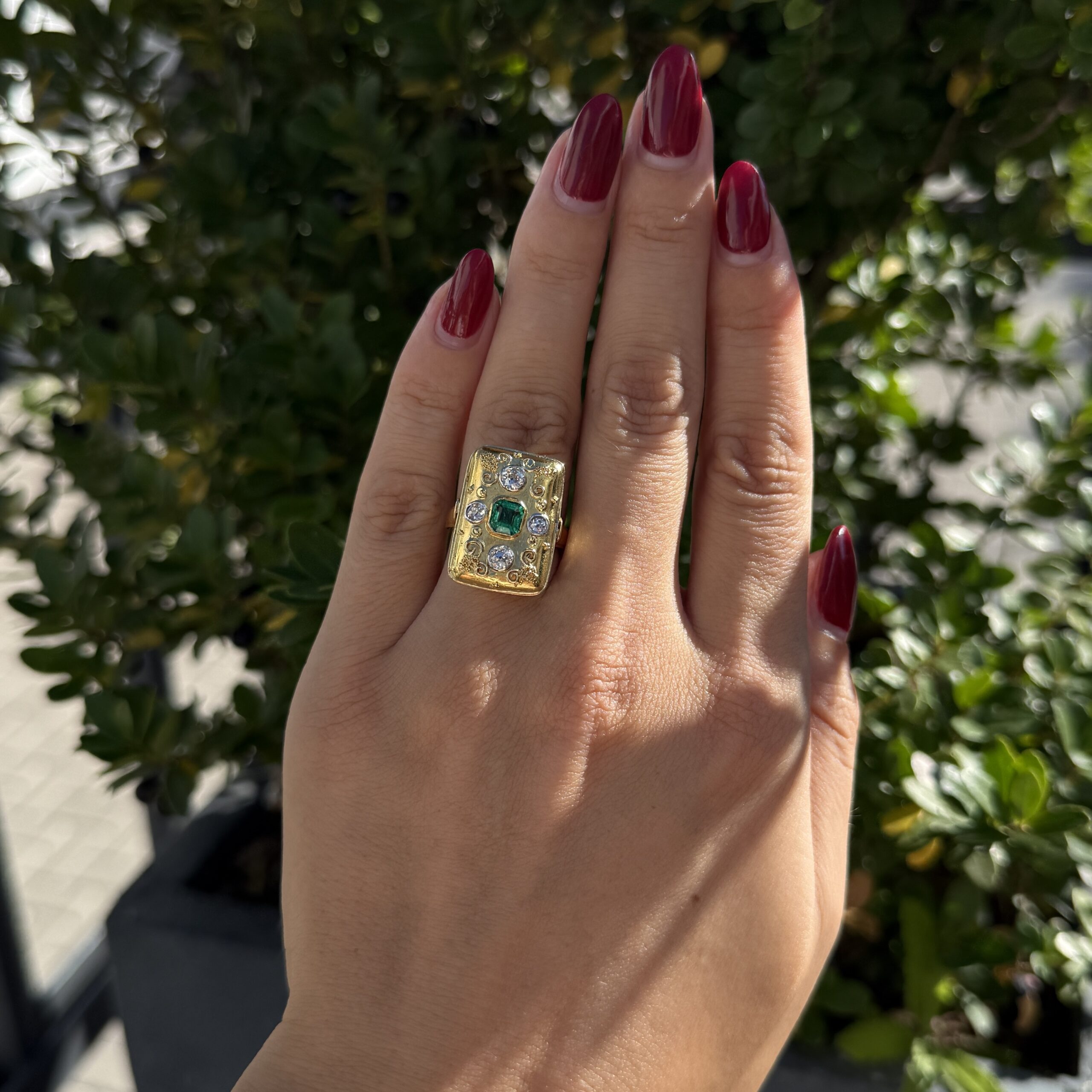 Ein Ring wie ein Versprechen aus längst vergangenen Zeiten – dieser antike Goldschatz mit funkelnden Diamanten und edlem Smaragd trägt die Geschichten von 1930 in sich und wartet darauf, neue Kapitel voller Leidenschaft zu schreiben. Spüren Sie, wie seine zeitlose Eleganz Ihre Hand schmückt und jeden Augenblick zu einem besonderen Moment werden lässt. Ein Schmuckstück, das nicht nur getragen wird, sondern das Herz berührt und Erinnerungen für die Ewigkeit schafft.