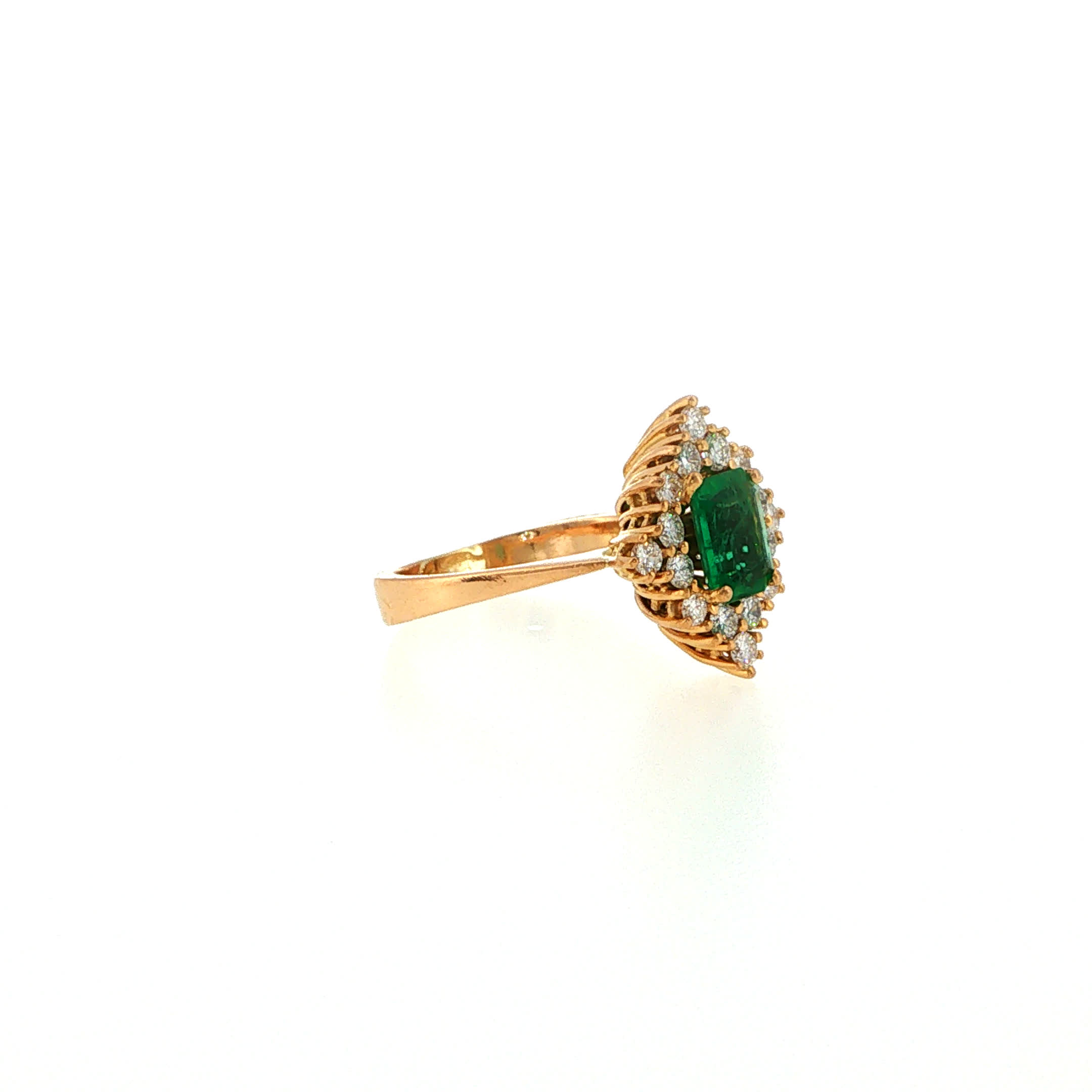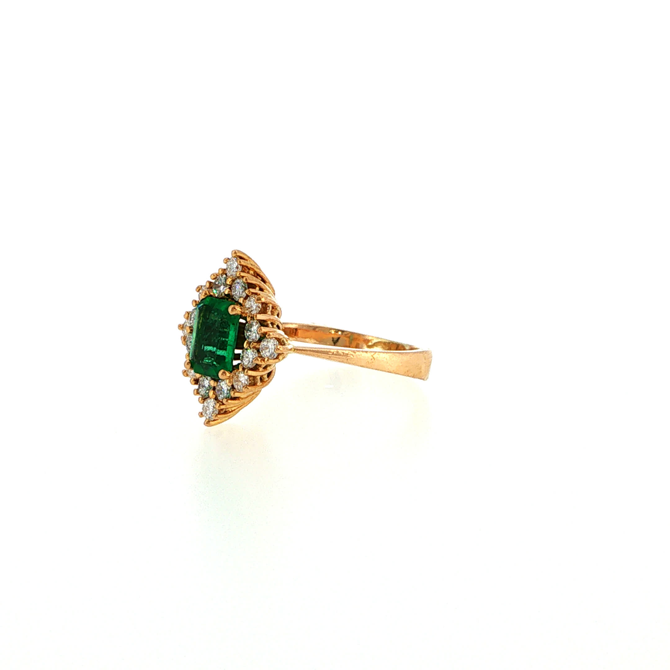 Ein Vintage-Schatz aus vergangenen Zeiten – dieser "Gold & green" Ring aus den 1970ern vereint die warme Eleganz von 18 Karat Gelbgold mit dem geheimnisvollen Leuchten eines Smaragds und funkelnden Brillanten. Spüren Sie, wie Geschichte und Leidenschaft an Ihrem Finger erwachen, während die zeitlose Schönheit dieses einzigartigen Schmuckstücks jeden Moment zu etwas Besonderem macht. Ein Ring, der nicht nur getragen wird, sondern Geschichten erzählt und neue Erinnerungen schafft.