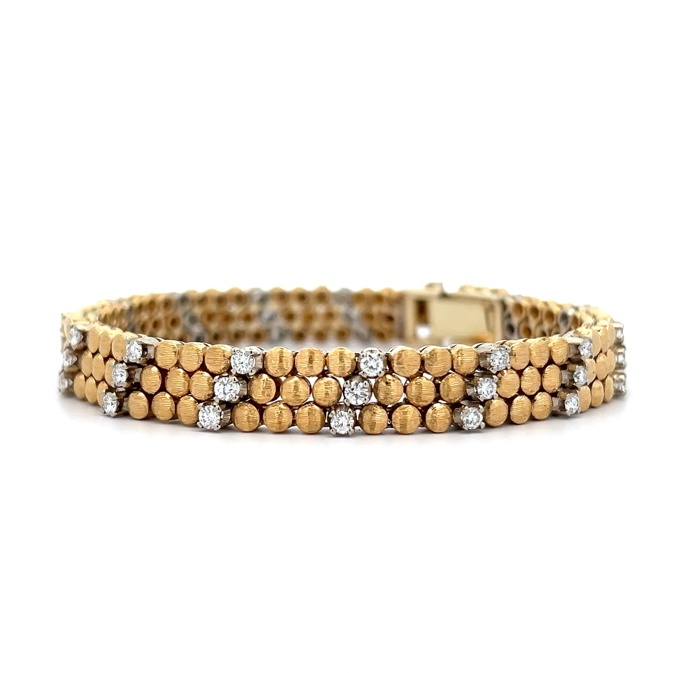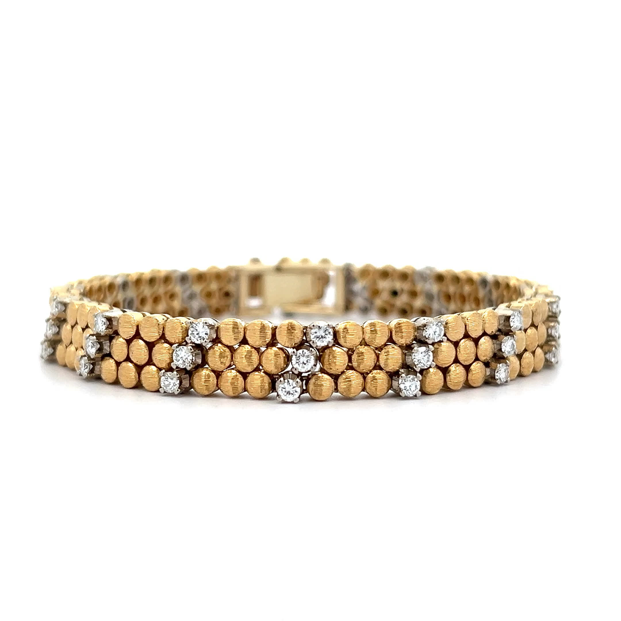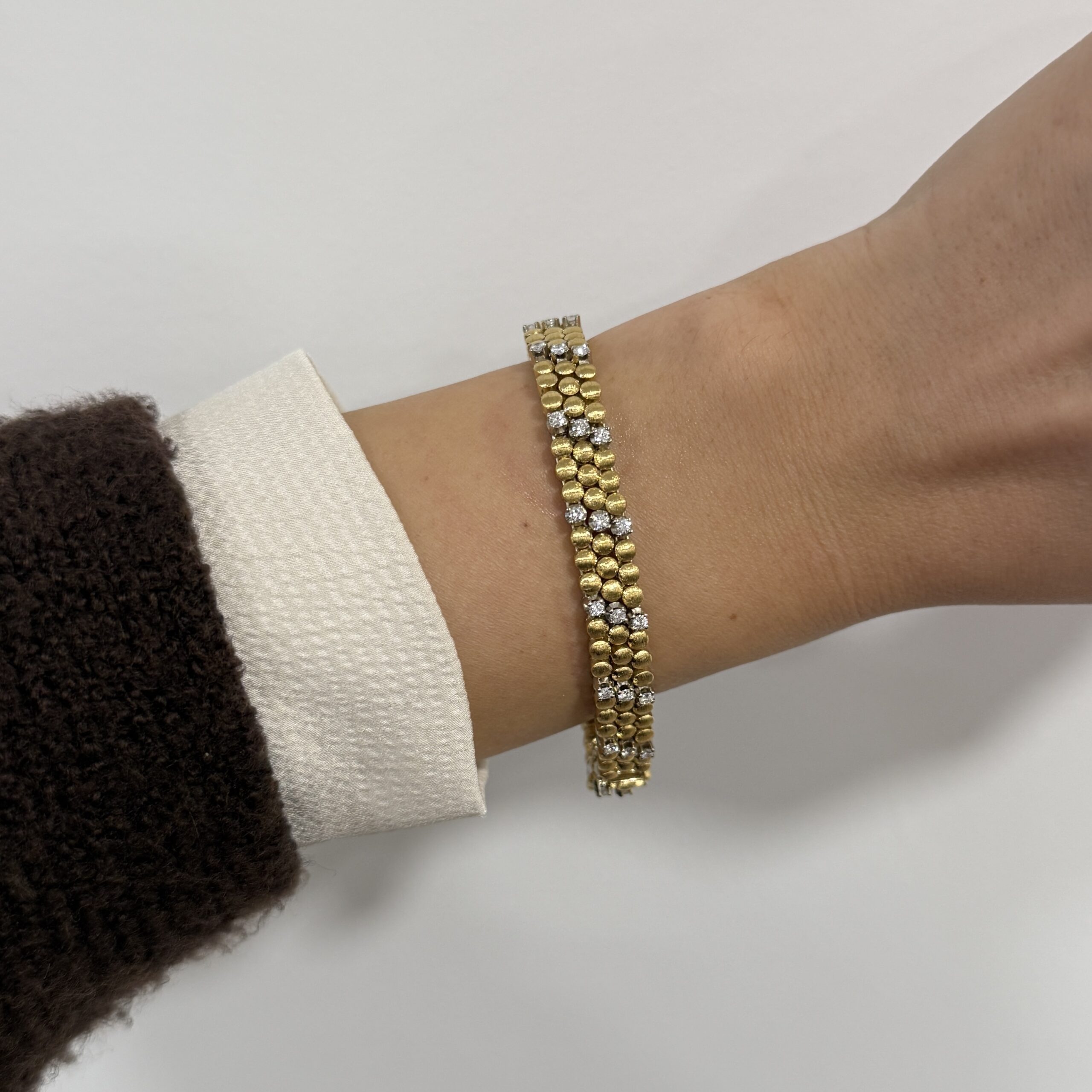 Wie ein goldener Traum umschmeichelt dieses einzigartige Armband Ihr Handgelenk – 45 funkelnde Brillanten tanzen im warmen Gelbgold und verwandeln jeden Moment in pure Magie. Das unendliche Symbol der Liebe wird hier zur kostbaren Realität, die seit den 1980er Jahren darauf wartet, Ihre ganz persönliche Geschichte zu erzählen. Ein Schmuckstück, das nicht nur getragen, sondern gefühlt wird – intensiv, zeitlos und voller Leidenschaft.
