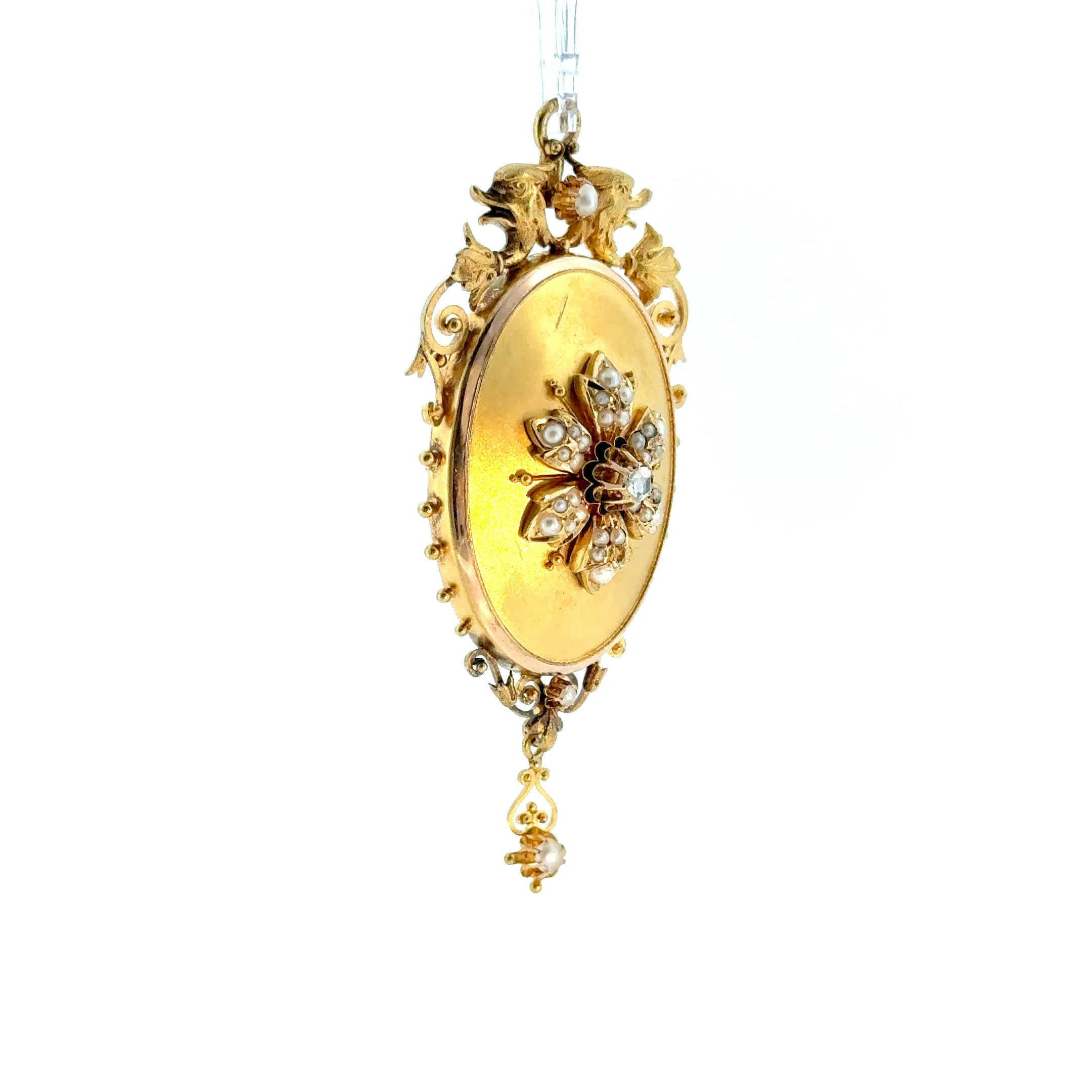 Dieses zauberhafte Medaillon aus der romantischen Zeit um 1890 bewahrt Ihre kostbarsten Erinnerungen wie einen wertvollen Schatz – hinter dem gläsernen Fenster auf der Rückseite ruhen Ihre intimsten Momente für die Ewigkeit. Die zarte Diamantrose und schimmernden Saatperlen in warmem 585er Gelbgold flüstern von vergangenen Liebesschwüren und unendlicher Verbundenheit. Ein Schmuckstück, das nicht nur getragen, sondern gelebt wird – voller Geheimnisse, Sehnsucht und der magischen Kraft, Zeit und Gefühle einzufangen.