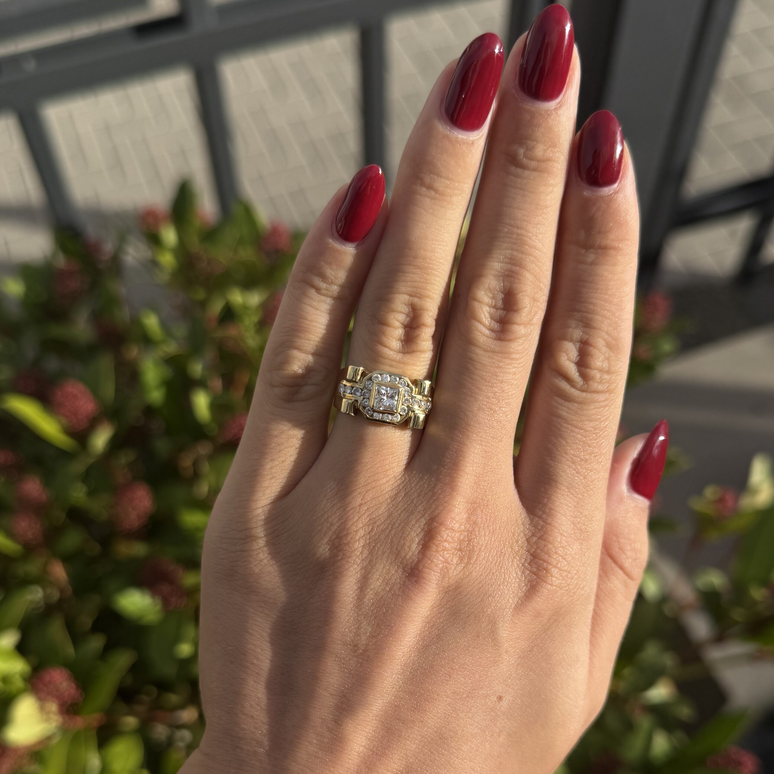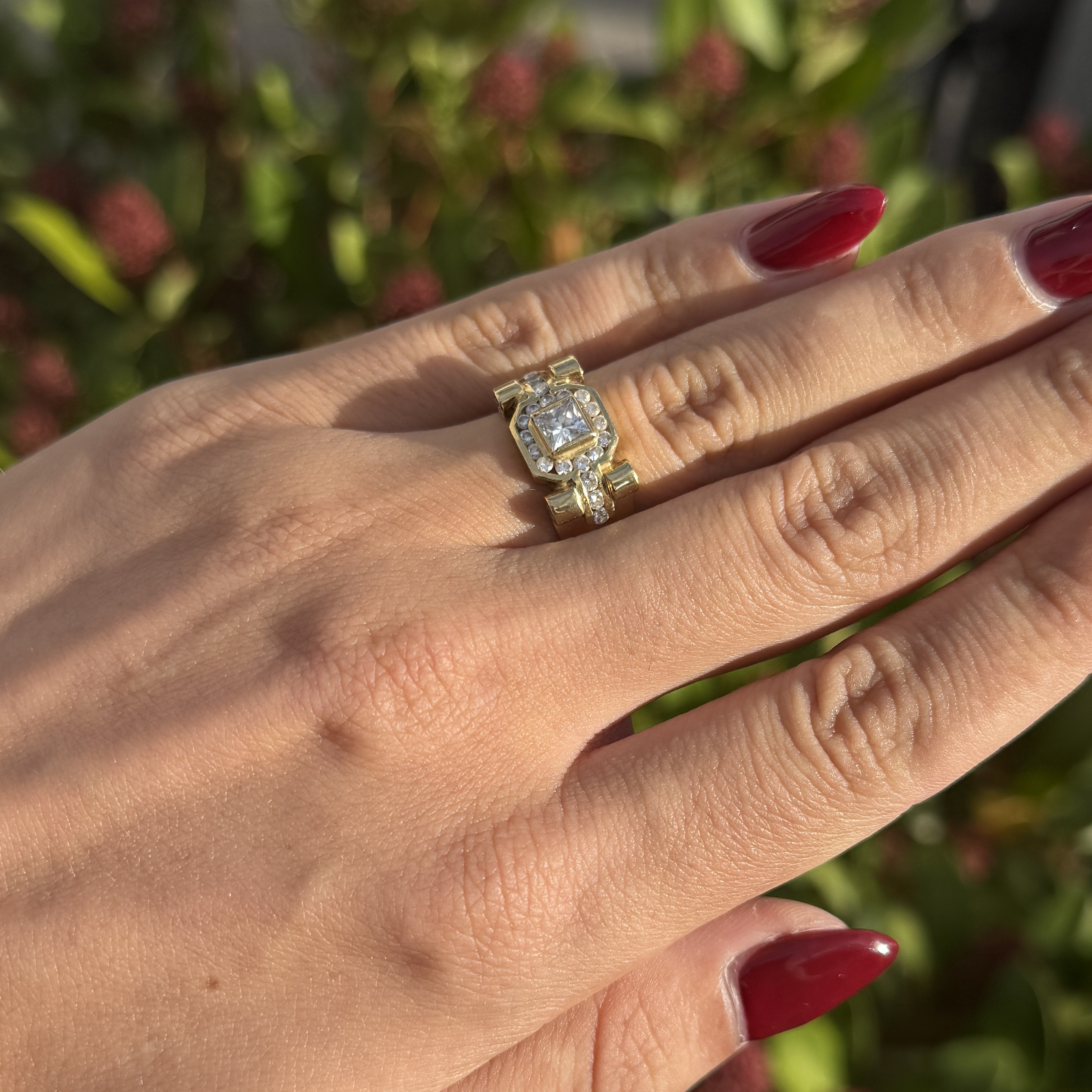 Der "Golden Shine" Vintage Ring ist wie ein goldener Traum, der Wirklichkeit wird – ein funkelndes Versprechen ewiger Verbundenheit. Seine 21 Diamanten tanzen im warmen Schimmer des 18-Karat Gelbgoldes und verwandeln jeden Augenblick in pure Magie. Ein Ring, der nicht nur getragen wird, sondern das Herz berührt und unvergessliche Momente für die Ewigkeit bewahrt.