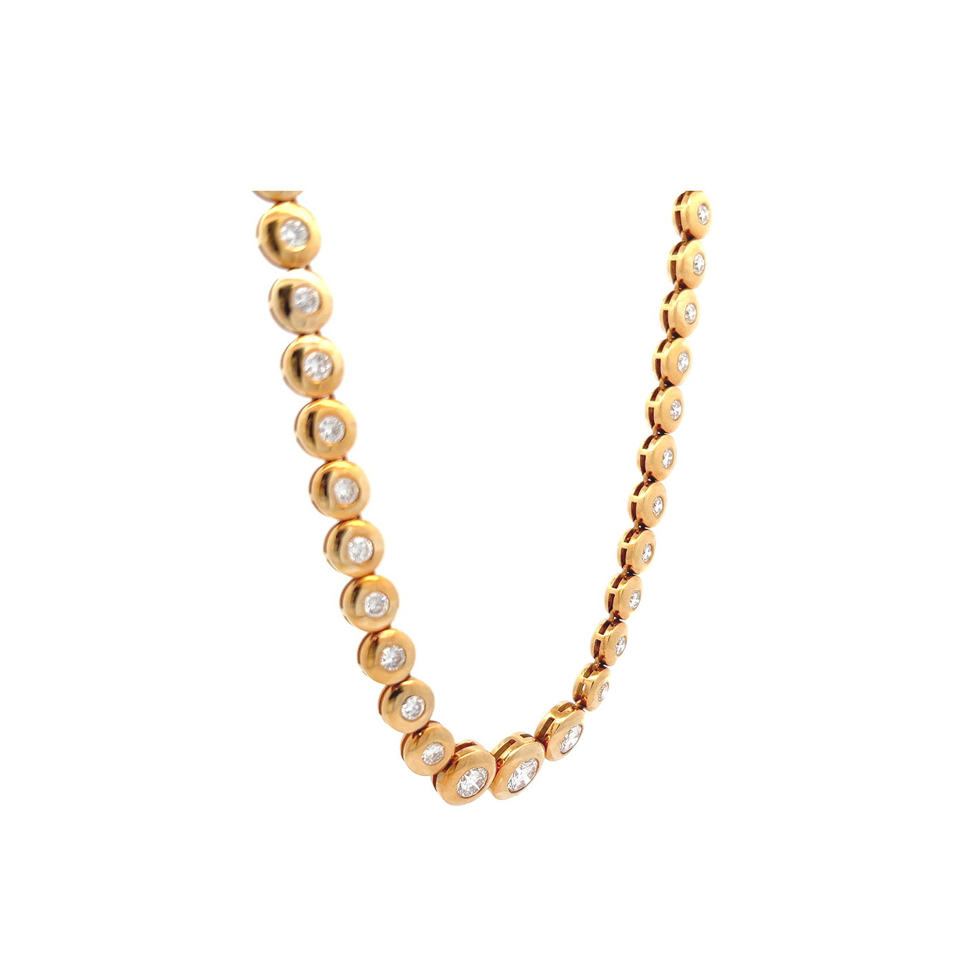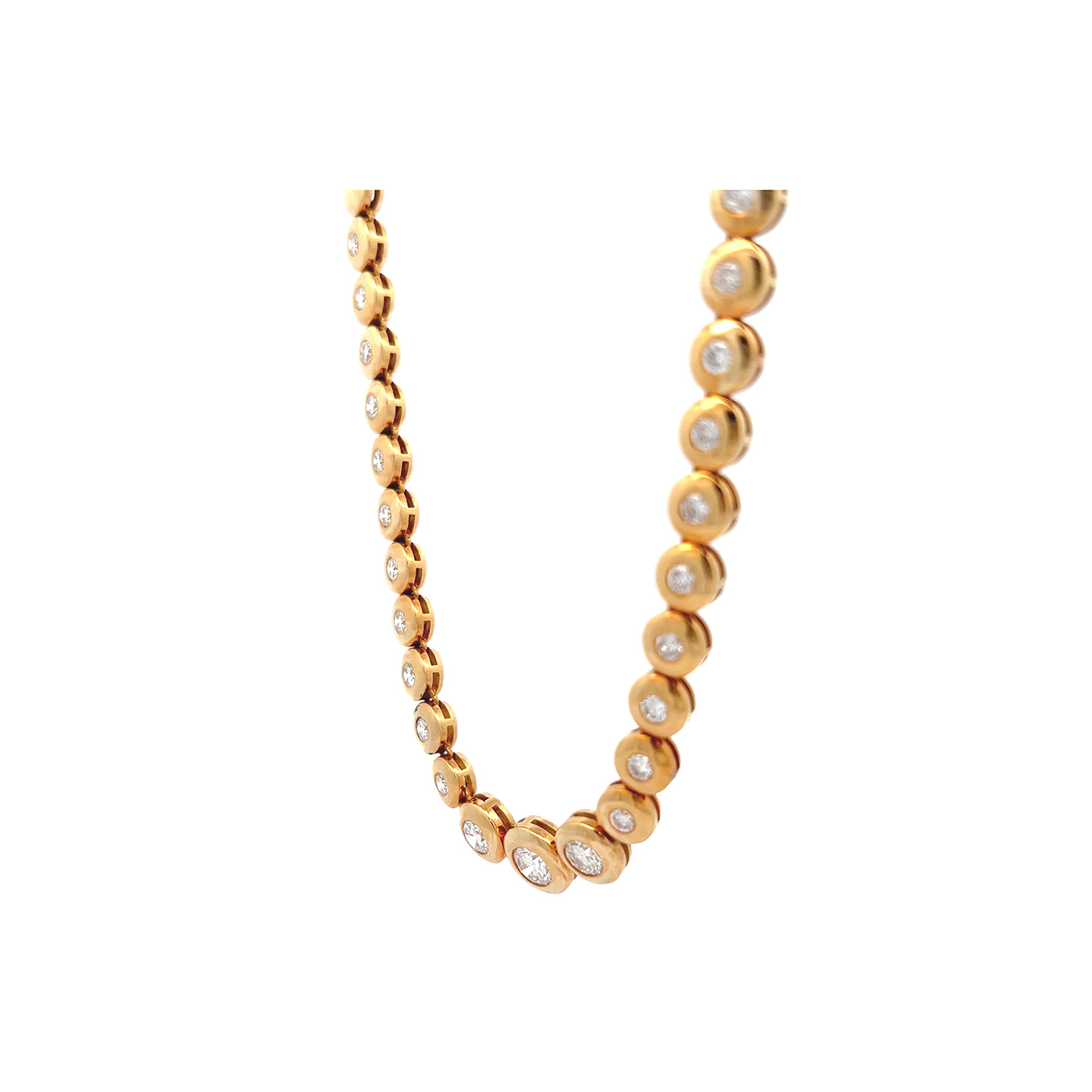 Ein warmer Goldglanz, der Ihre Haut zum Strahlen bringt und jeden Herzschlag mit funkelndem Licht begleitet – diese außergewöhnliche Kette verwandelt gewöhnliche Augenblicke in unvergessliche Erinnerungen. 25 Brillanten tanzen sanft um Ihren Hals und flüstern von Momenten voller Zärtlichkeit und stiller Größe. Ein Schmuckstück, das nicht nur getragen wird, sondern das Sie in seiner zeitlosen Eleganz umarmt.