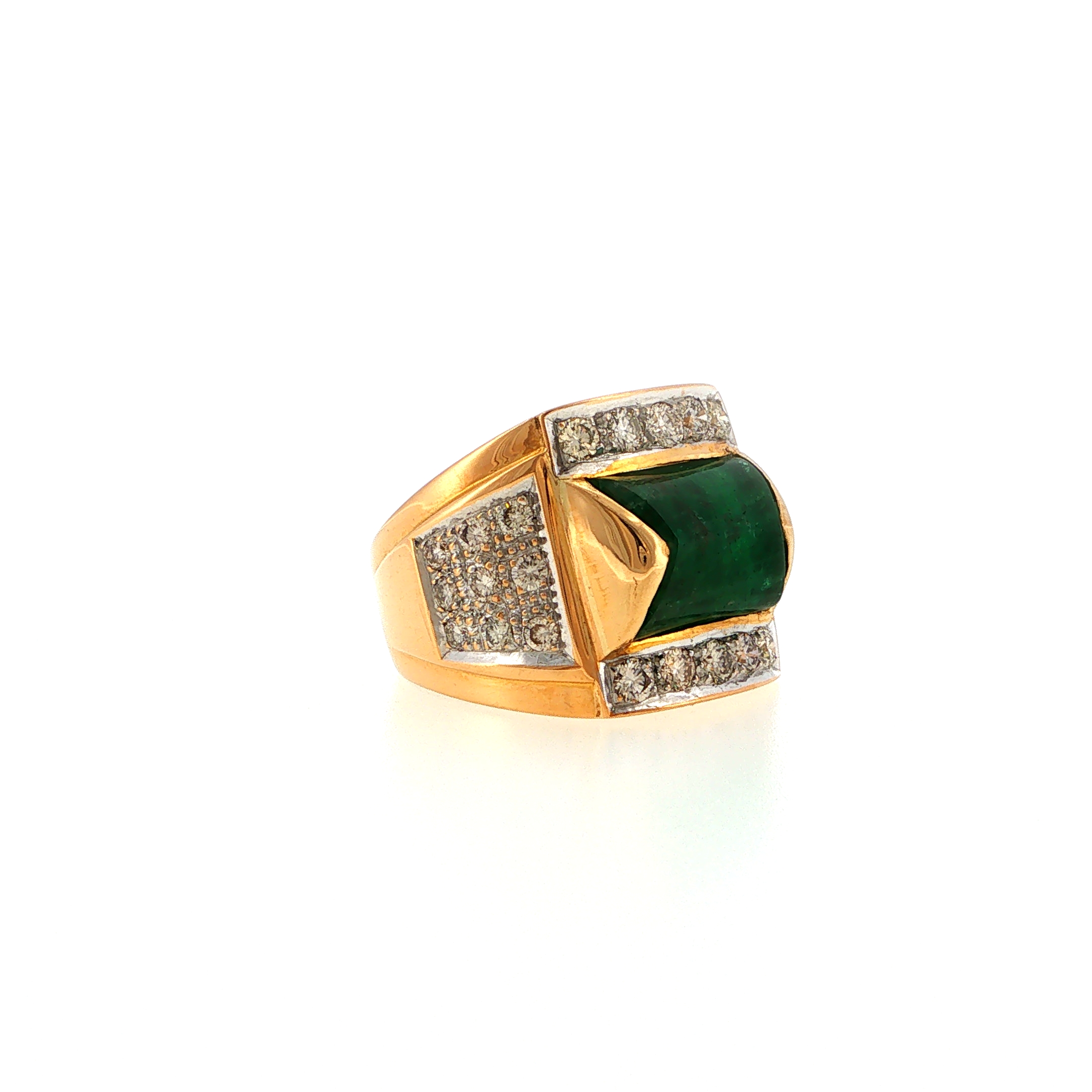 Dieser außergewöhnliche "Green Glow" - Vintage aus der exklusiven Kollektion von Juwelier Steiger ist ein Meisterwerk der Goldschmiedekunst. In kostbarem 750er Gelbgold gefasst, spiegelt er höchste Qualitätsansprüche wider. Gekrönt mit 28 Brillanten ca. 1.48 ct. G - M / VS - Si, erzählt er von besonderen Momenten und ewiger Verbindung. Ein Symbol für Perfektion und bleibende Werte.