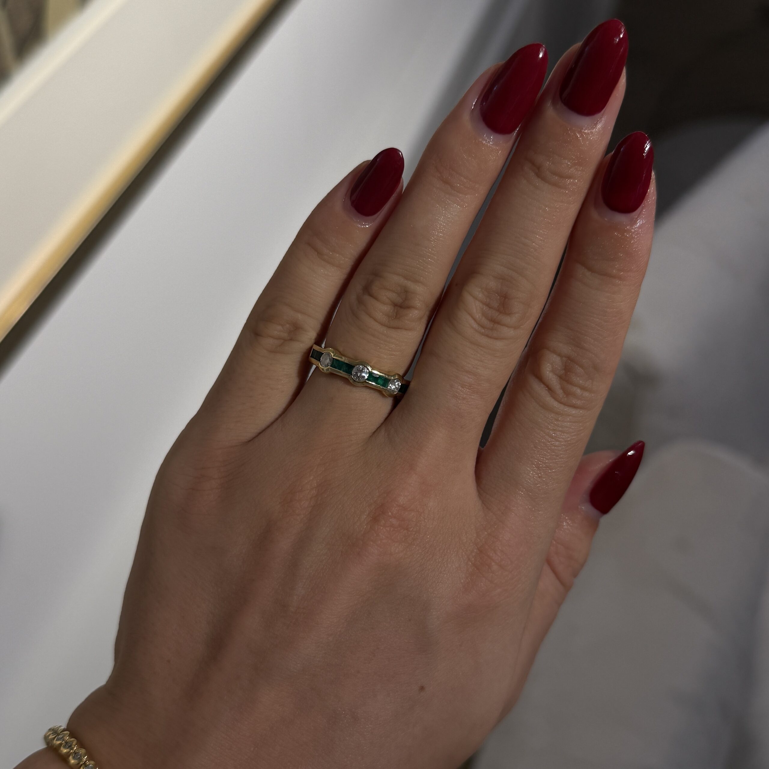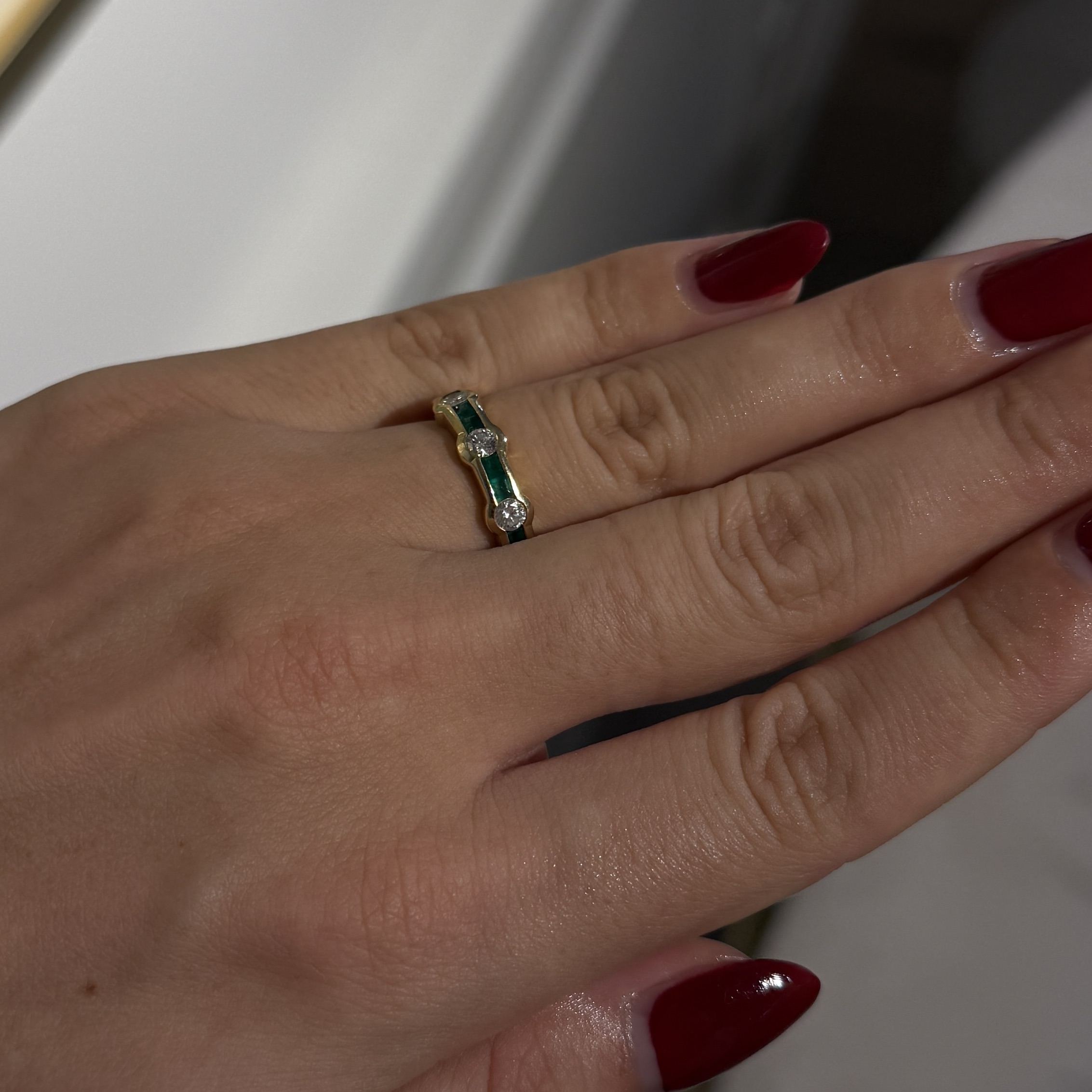 Wie smaragdgrüne Träume, die in warmem Gold gefasst wurden – dieser Vintage-Ring aus den 80ern flüstert Geschichten von unvergesslichen Momenten und lässt Ihr Herz mit jedem Brillantenfunkeln höher schlagen. Seine acht Smaragde im klassischen Emerald Cut und drei strahlende Brillanten verwandeln jeden Augenblick in pure Magie. Ein Schmuckstück, das nicht nur getragen wird, sondern das Sie in eine Welt voller Eleganz und zeitloser Schönheit entführt.