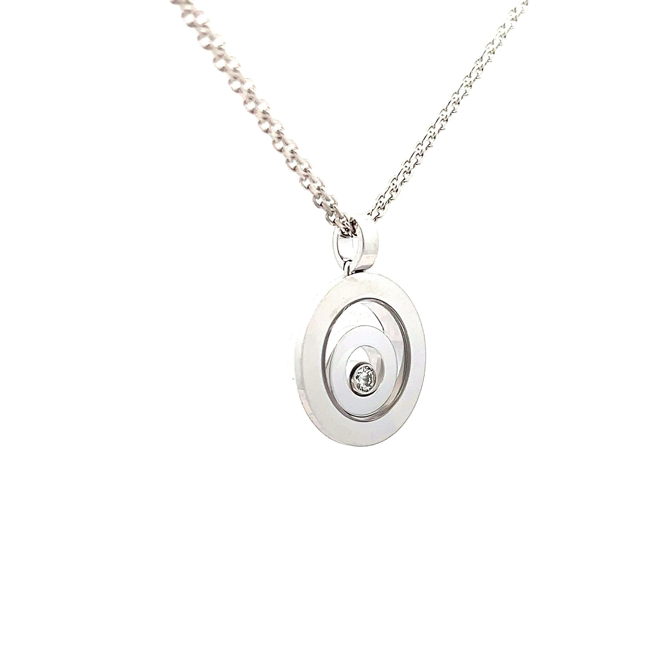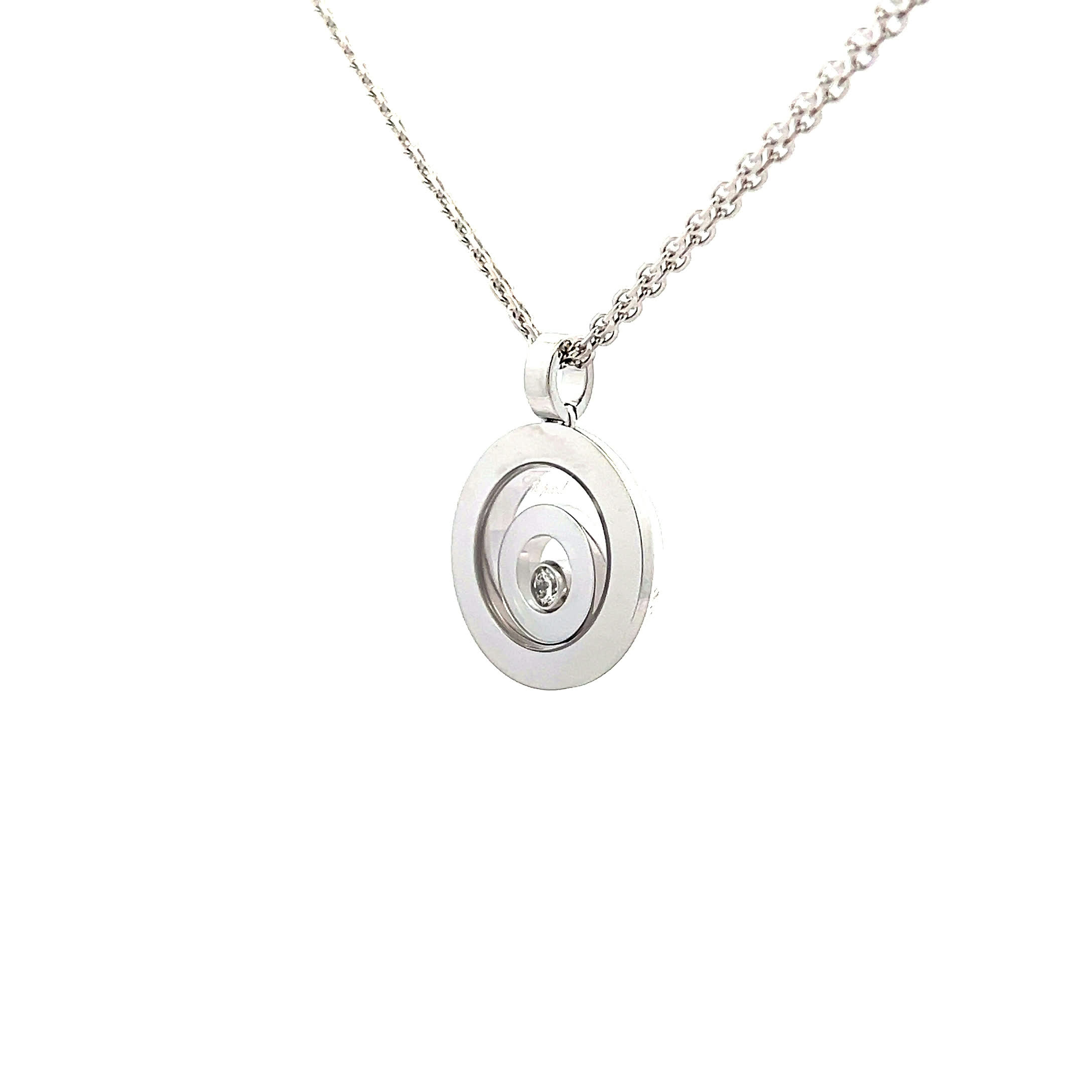 Der bewegliche Brillant tanzt sanft an Ihrem Hals und flüstert Geschichten von Lebensfreude und kostbaren Augenblicken – ein Vintage-Juwel von Chopard, das Ihr strahlendes Lächeln für die Ewigkeit einfängt. Spüren Sie, wie das zarte Weißgold Ihre Haut liebkost und jeder Ihrer Schritte von funkelnder Eleganz begleitet wird. Ein Schmuckstück, das nicht nur getragen wird, sondern das Leben selbst feiert.