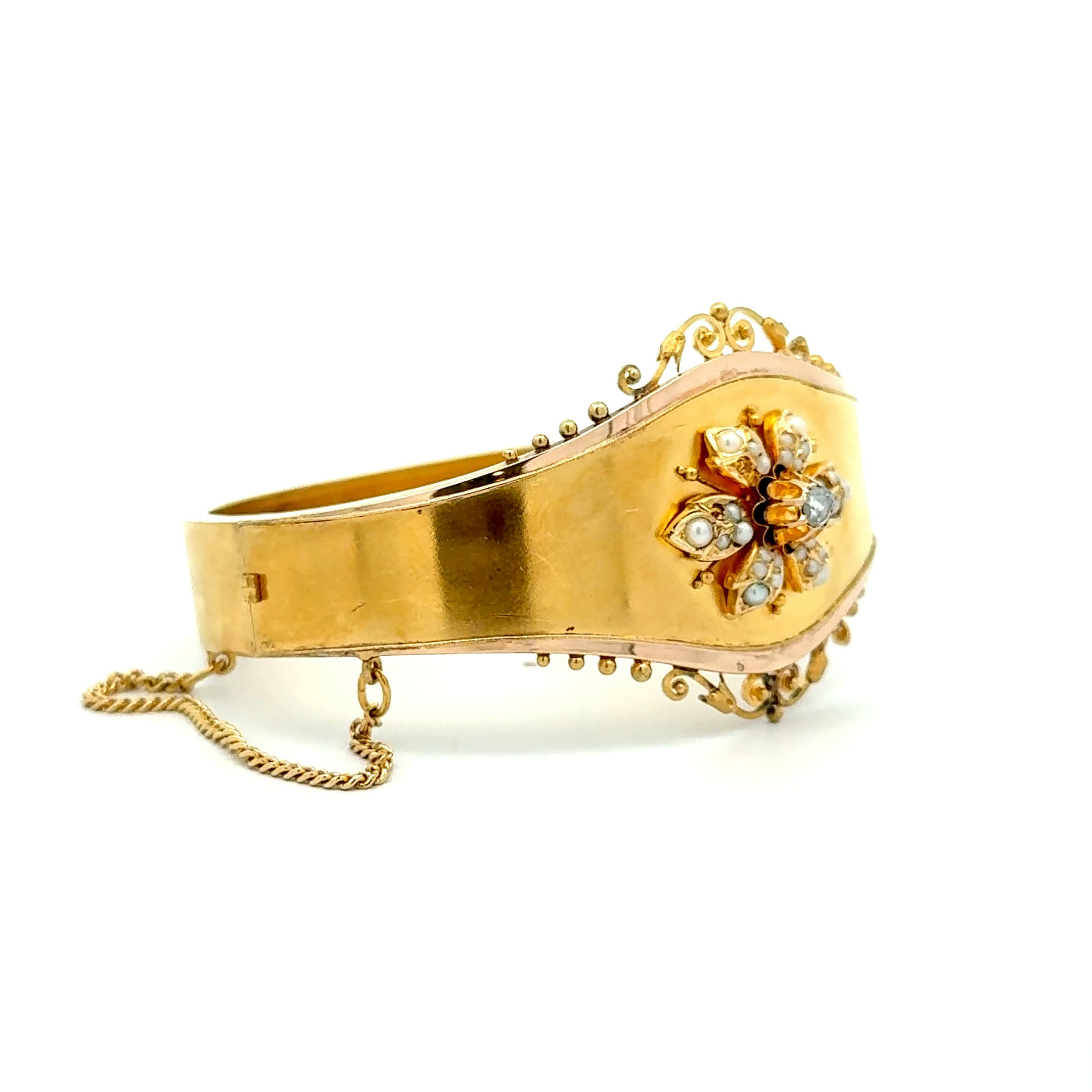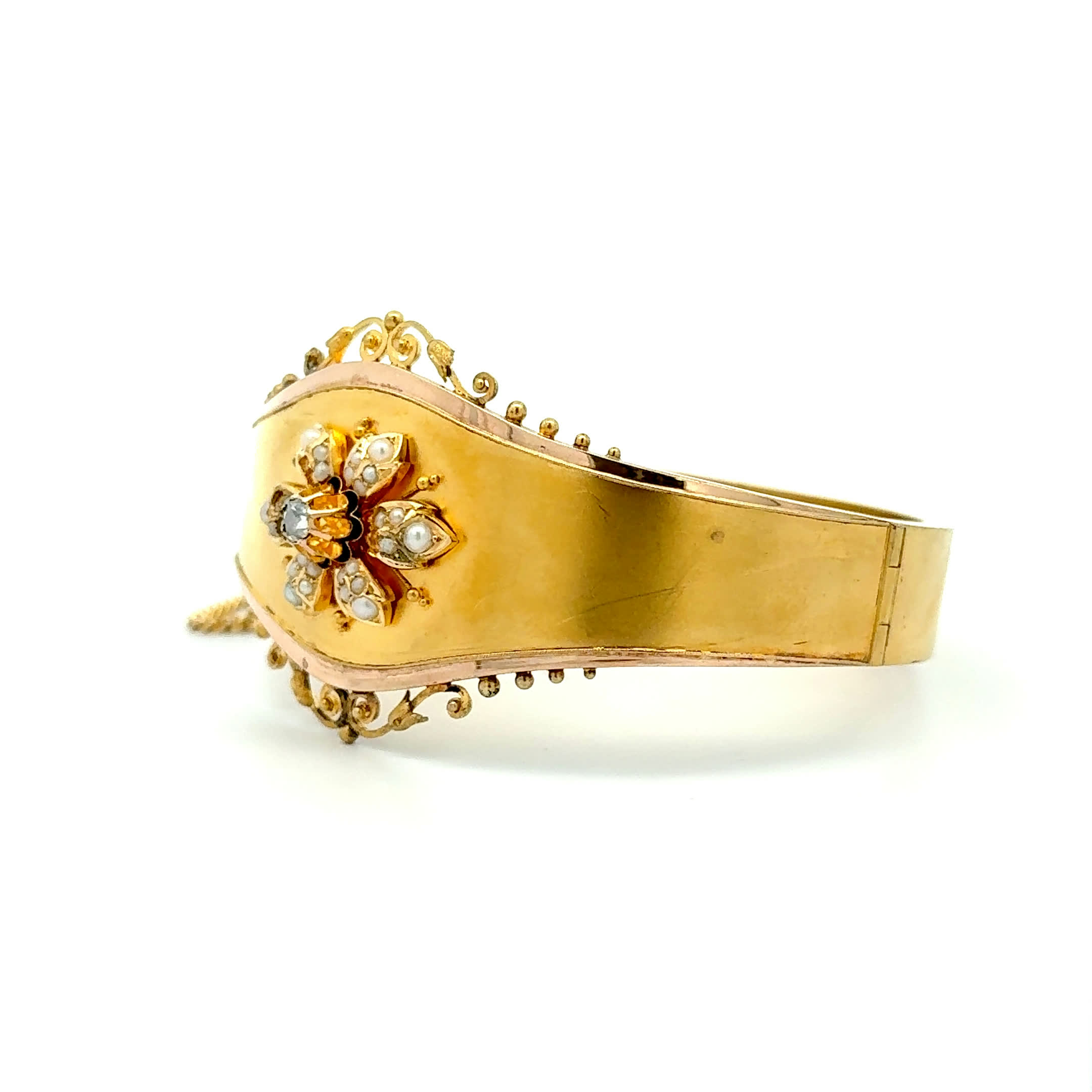 Ein Armreif aus vergangenen Zeiten, der seit 1860 darauf wartet, wieder geliebt zu werden – seine zarten Diamantrosen und Flussperlchen flüstern von romantischen Ballnächten und heimlichen Liebesschwüren. Wenn sich das warme Gelbgold um Ihr Handgelenk schmiegt, tragen Sie nicht nur Schmuck, sondern die Seele einer ganzen Epoche. Ein Erbstück für die Ewigkeit, das Ihre eigene Geschichte mit jener vergangener Generationen verwebt.