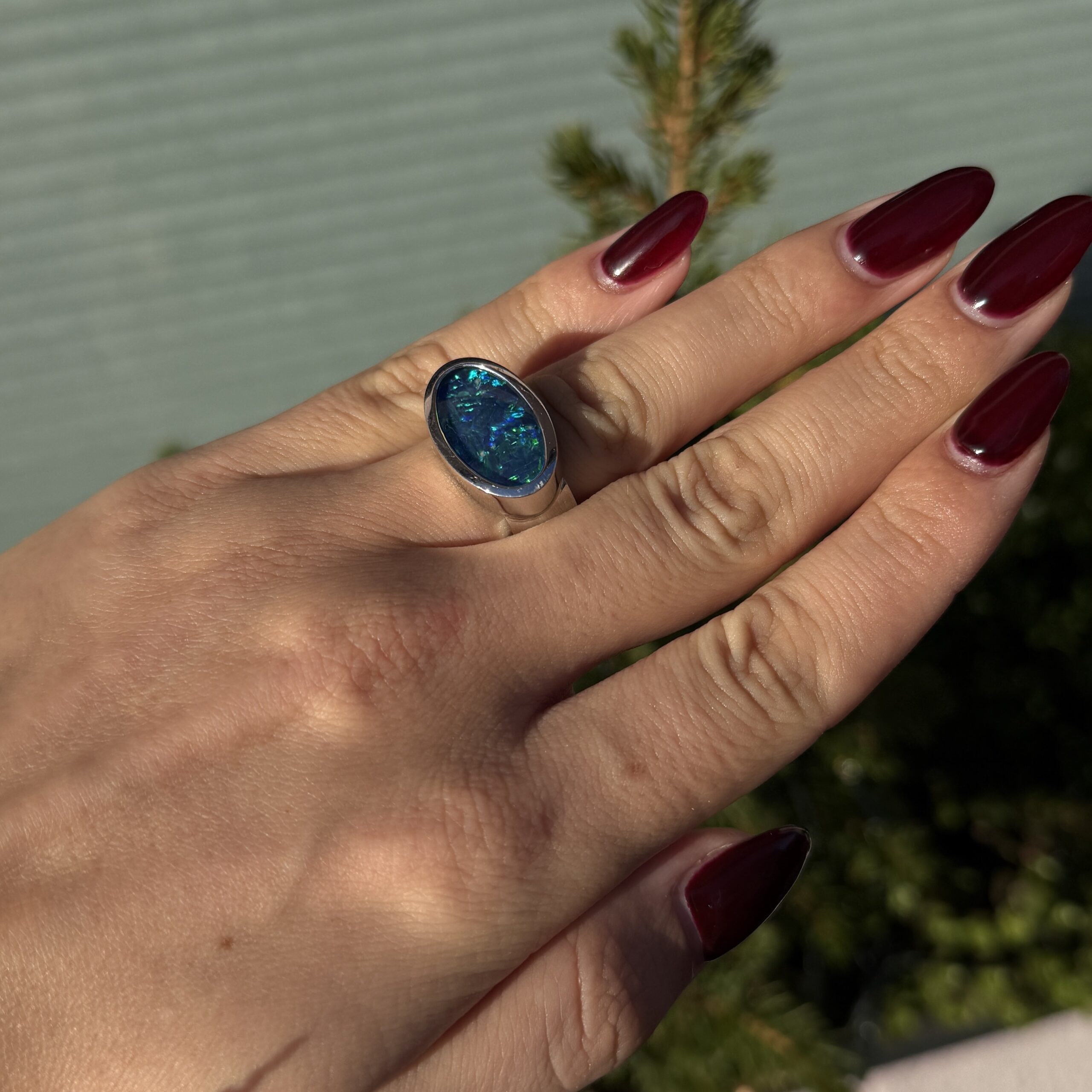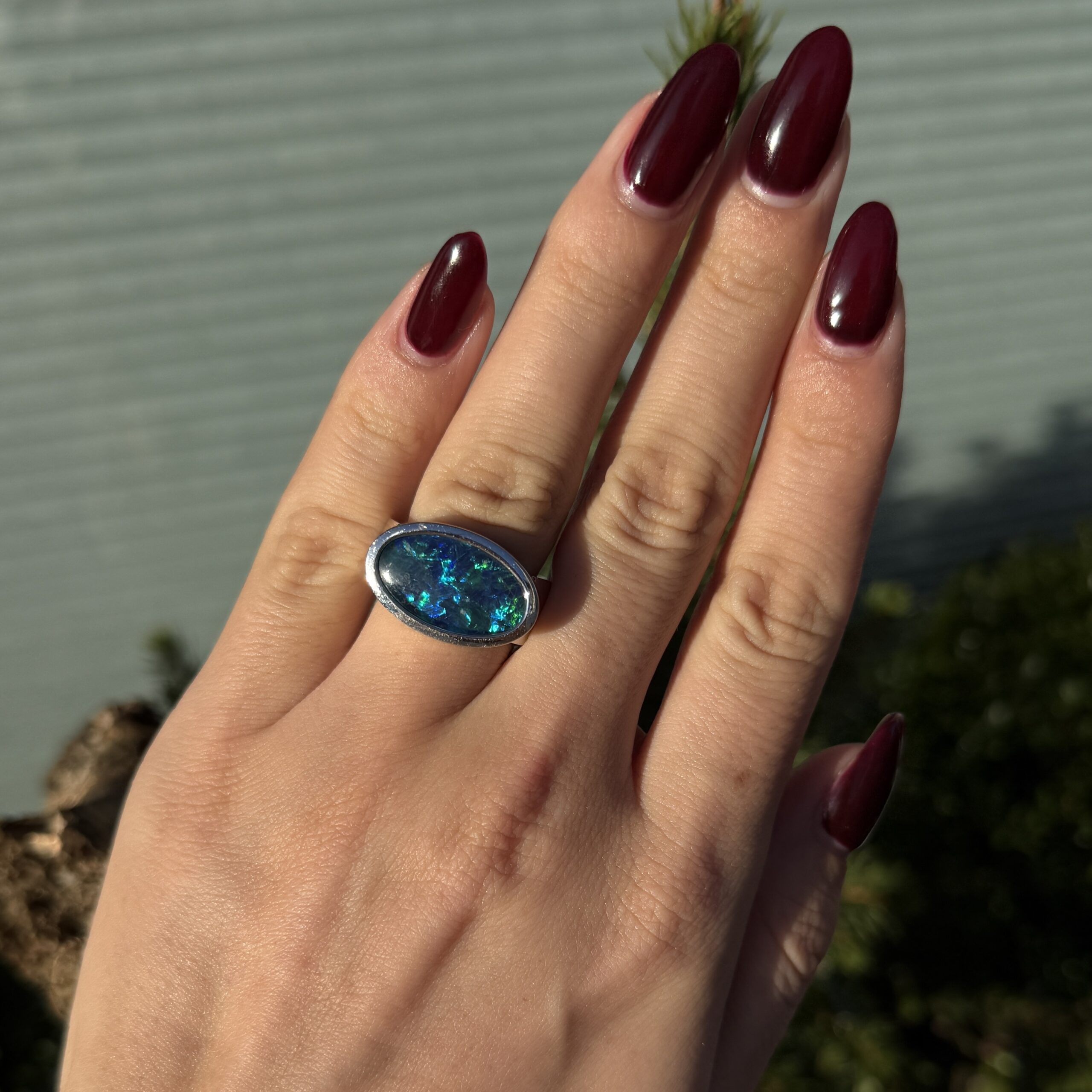 Wie ein Stück Himmel, das sich in Ihren Händen materialisiert – dieser zauberhafte Vintage-Ring trägt die mystische Schönheit eines blauen Opals, der in jedem Lichtstrahl neue Geheimnisse offenbart. In edlem 18 Karat Weißgold gefasst, wird er zum treuen Begleiter Ihrer kostbarsten Momente und lässt Träume von Unendlichkeit wahr werden. Ein Schmuckstück, das nicht nur getragen wird, sondern das Herz berührt und Erinnerungen für die Ewigkeit schafft.