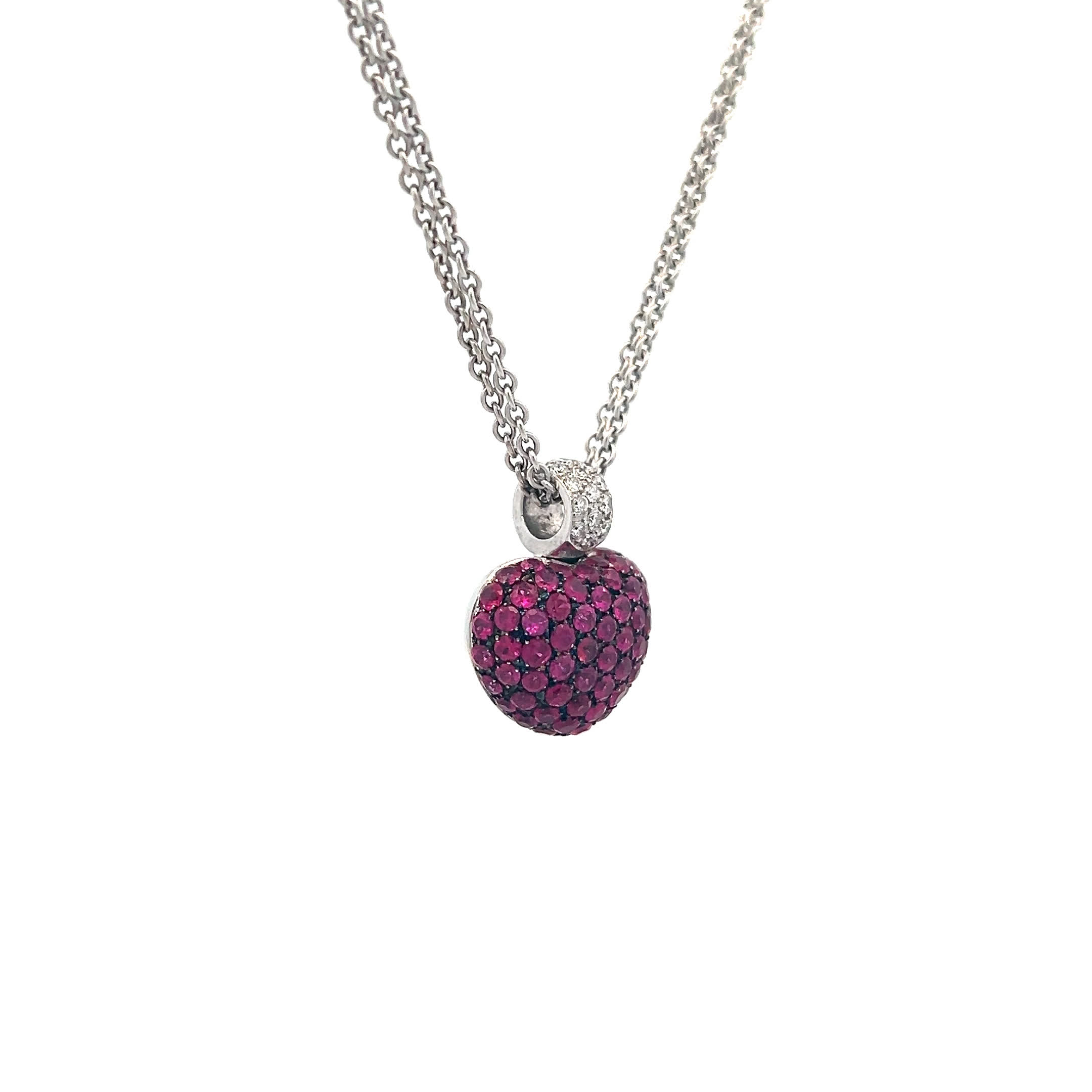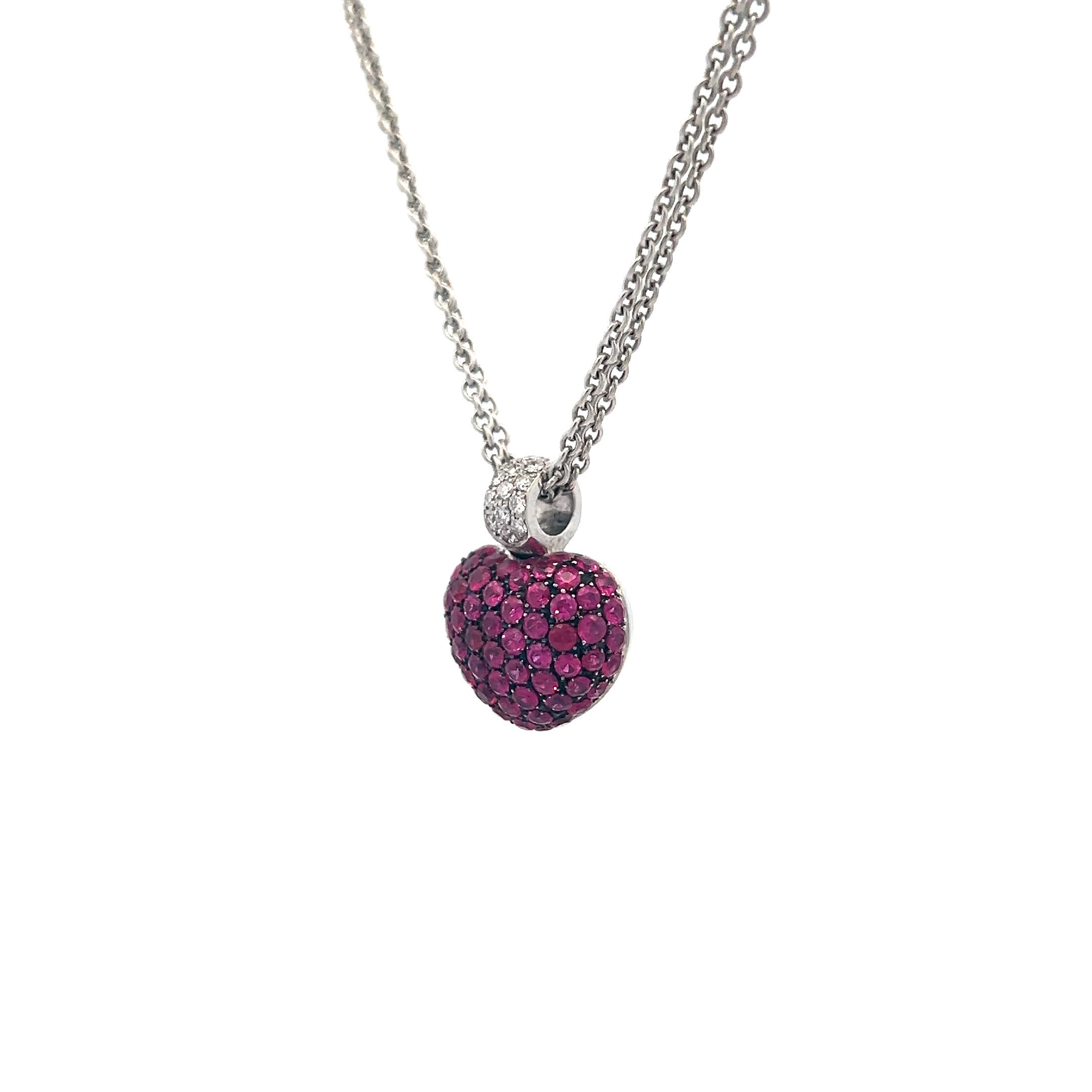 Das sanfte Funkeln der Brillanten verschmilzt mit den glühenden Rubinen zu einem Versprechen, das direkt ins Herz spricht – jeder Herzschlag wird zu einem kostbaren Moment der Verbundenheit. Diese außergewöhnliche Kreation aus 18 und 14 Karat Weißgold trägt die Wärme wahrer Gefühle und verwandelt jeden Augenblick in eine zärtliche Erinnerung. Ein Schmuckstück, das nicht nur getragen wird, sondern das Herz berührt und die schönsten Emotionen zum Leben erweckt.