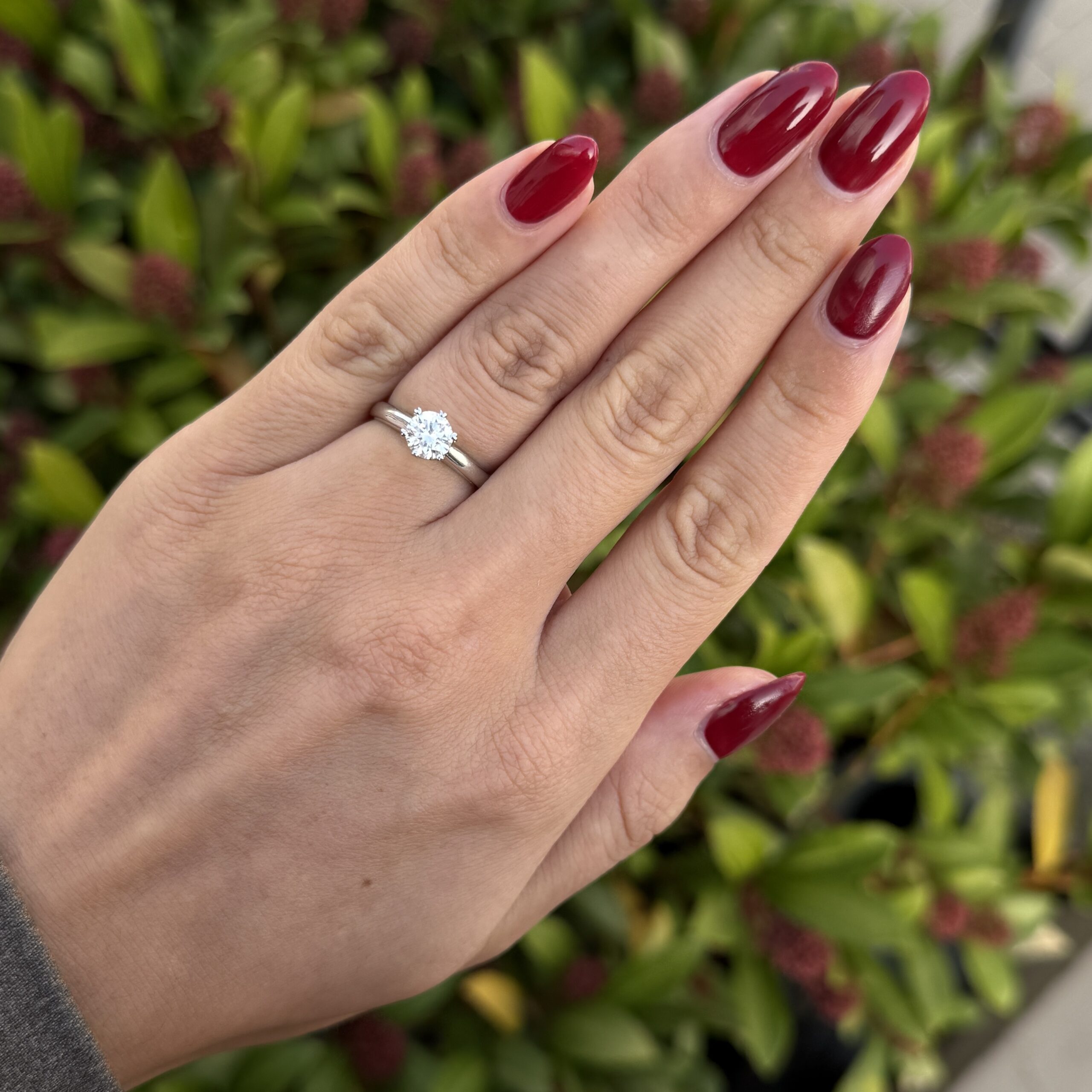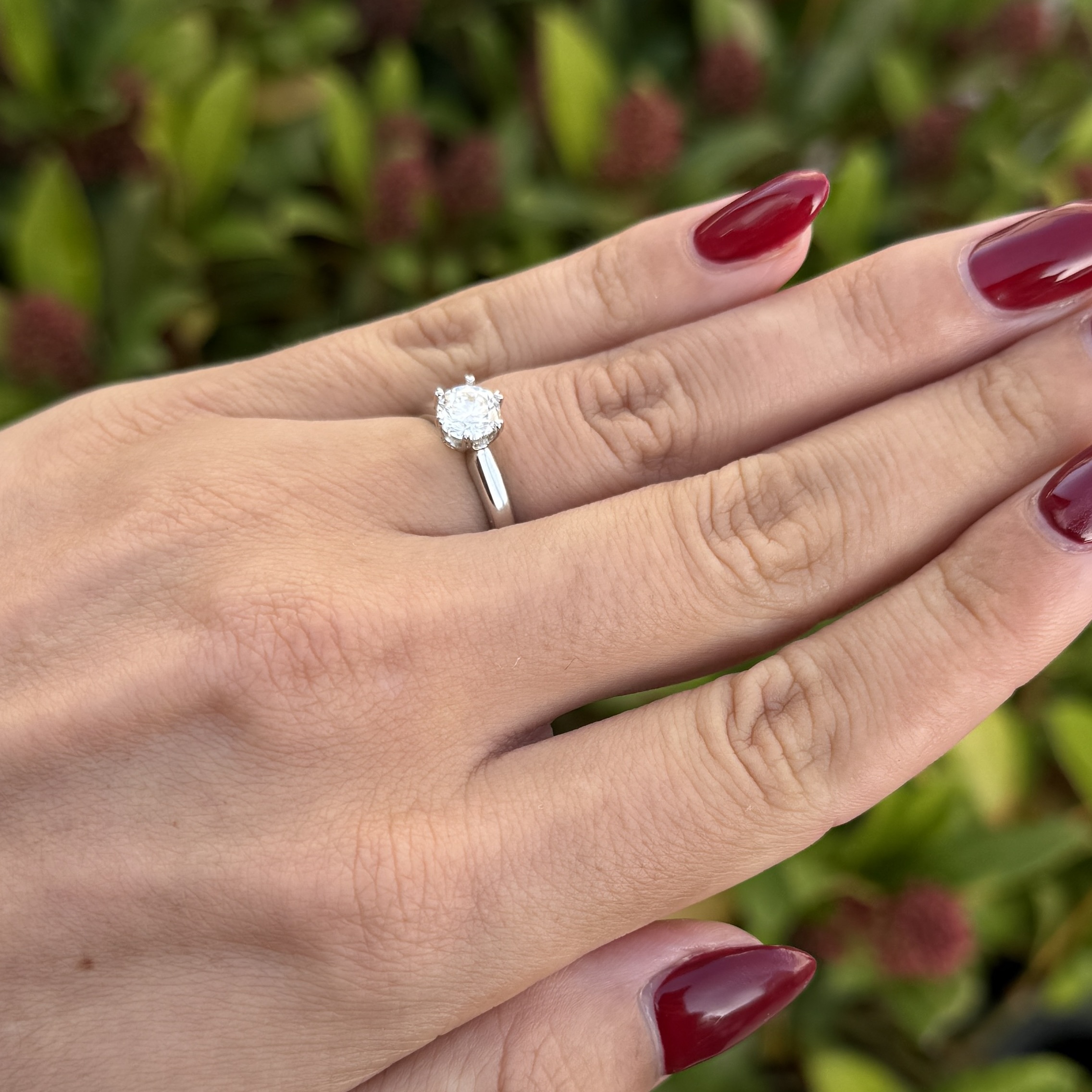 Ein Verlobungsring aus edlem Weißgold, gekrönt von einem strahlenden Brillanten mit 1.01 ct. – lupenrein und in hochfeinem Weiß+ (D). Ein Diamant von vollendeter Perfektion, der wie die Liebe selbst für Reinheit, Stärke und Ewigkeit steht.