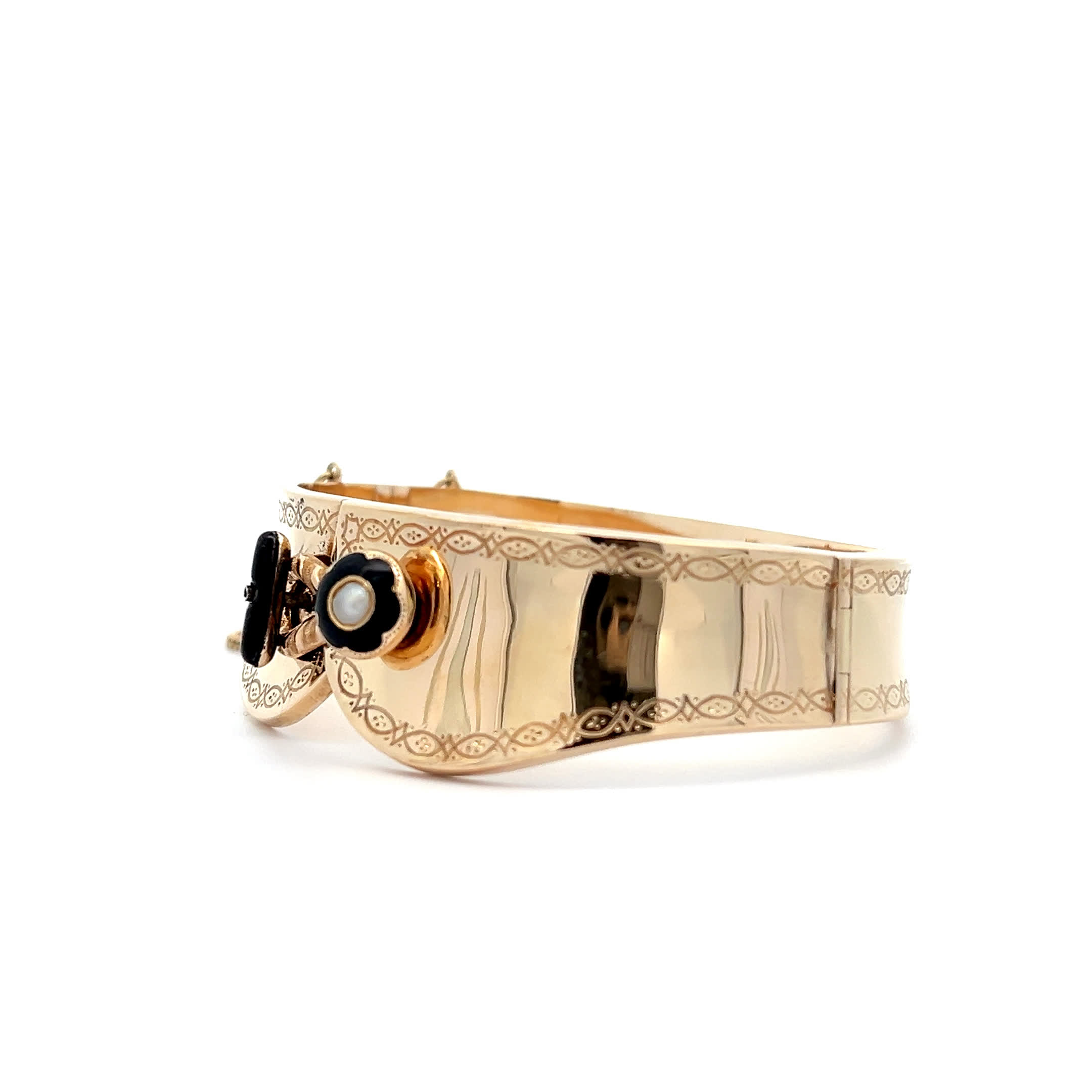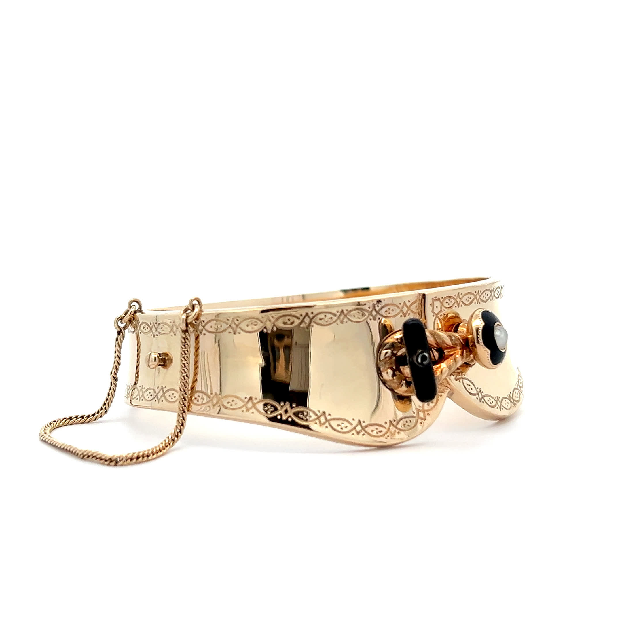 Ein Hauch von Jugendstil-Eleganz aus dem Jahr 1890 – dieser antike Armreif aus warmem 585er Gelbgold trägt die Seele vergangener Zeiten in sich und macht Sie zur Hüterin einer kostbaren Geschichte. Die zarte Perle und der geheimnisvolle Onyx flüstern von romantischen Ballnächten und stillen Momenten der Schönheit, während das Kastenschloss wie ein kleines Geheimnis Ihre Handgelenk umschließt. Ein Schmuckstück, das nicht nur getragen wird, sondern das Sie in eine Welt voller Poesie und zeitloser Anmut entführt.