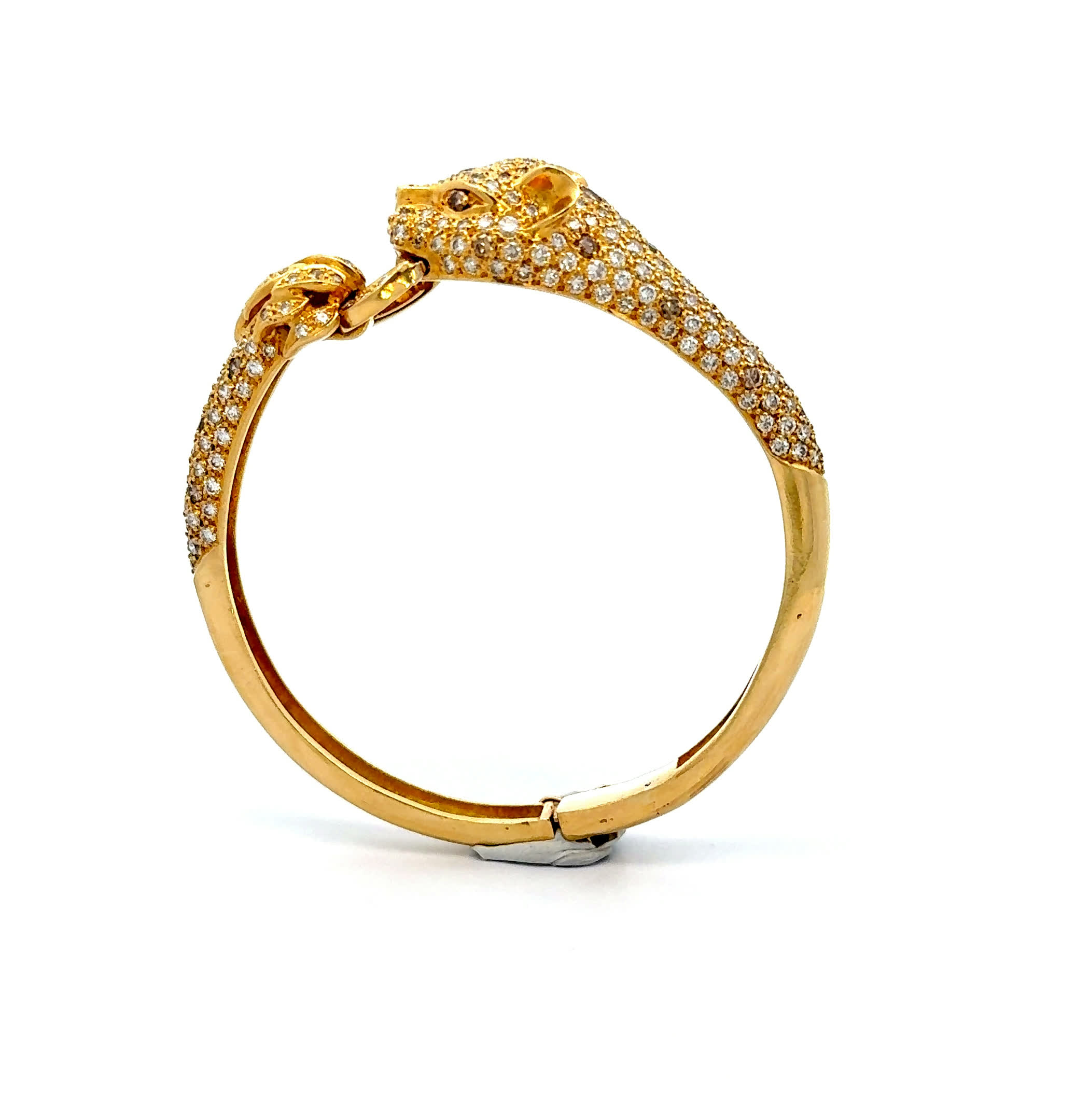 Ein "Panther" von seltener Eleganz – dieser vintage Gelbgold-Armreif mit seinen funkelnden Brillanten verkörpert die wilde Anmut und mystische Kraft seines Namensgebers. Seine warme Goldausstrahlung und das Spiel von 2,50 Karat Diamanten schaffen Momente unvergesslicher Sinnlichkeit, die Ihre natürliche Stärke und Weiblichkeit zum Strahlen bringen. Ein Schmuckstück, das nicht nur getragen wird, sondern Ihre Geschichte mit zeitloser Leidenschaft und unwiderstehlicher Ausstrahlung erzählt.