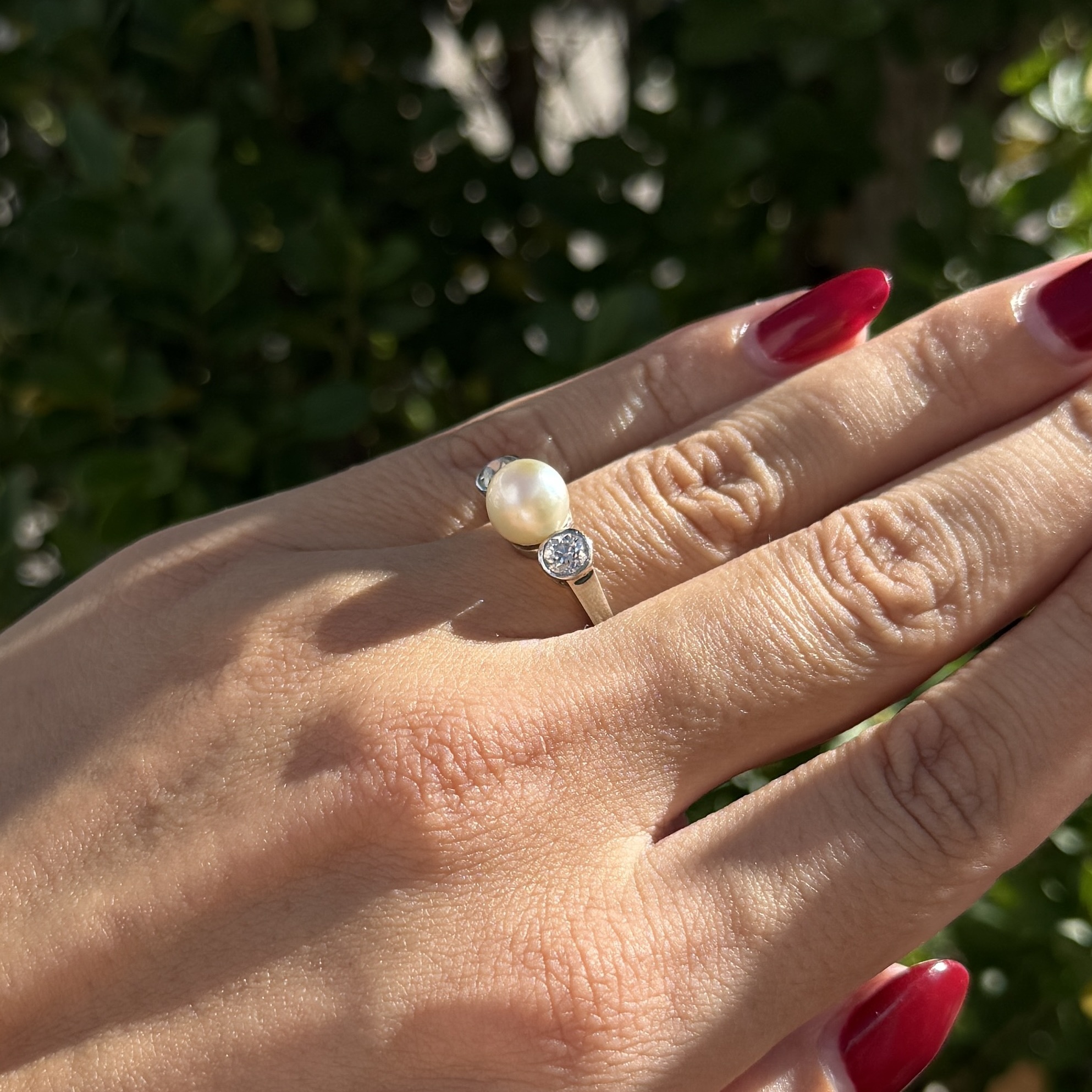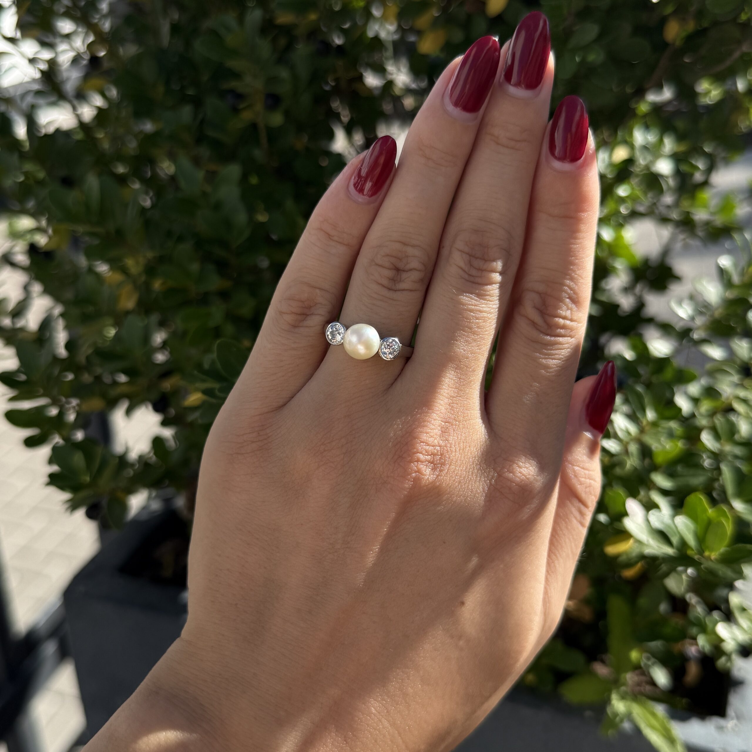 Dieser zauberhafte Art Déco Ring aus den 1950ern trägt die Eleganz vergangener Zeiten in sich – seine funkelnden Altschliff-Diamanten erzählen von großen Liebesgeschichten und unvergesslichen Momenten. In 585er Weißgold gefasst, wird "Perlenglanz" zum strahlenden Begleiter Ihrer schönsten Erinnerungen und lässt Ihr Herz bei jedem Blick höher schlagen. Ein Schmuckstück, das nicht nur Ihre Hand schmückt, sondern Ihre Seele berührt und von zeitloser Romantik flüstert.