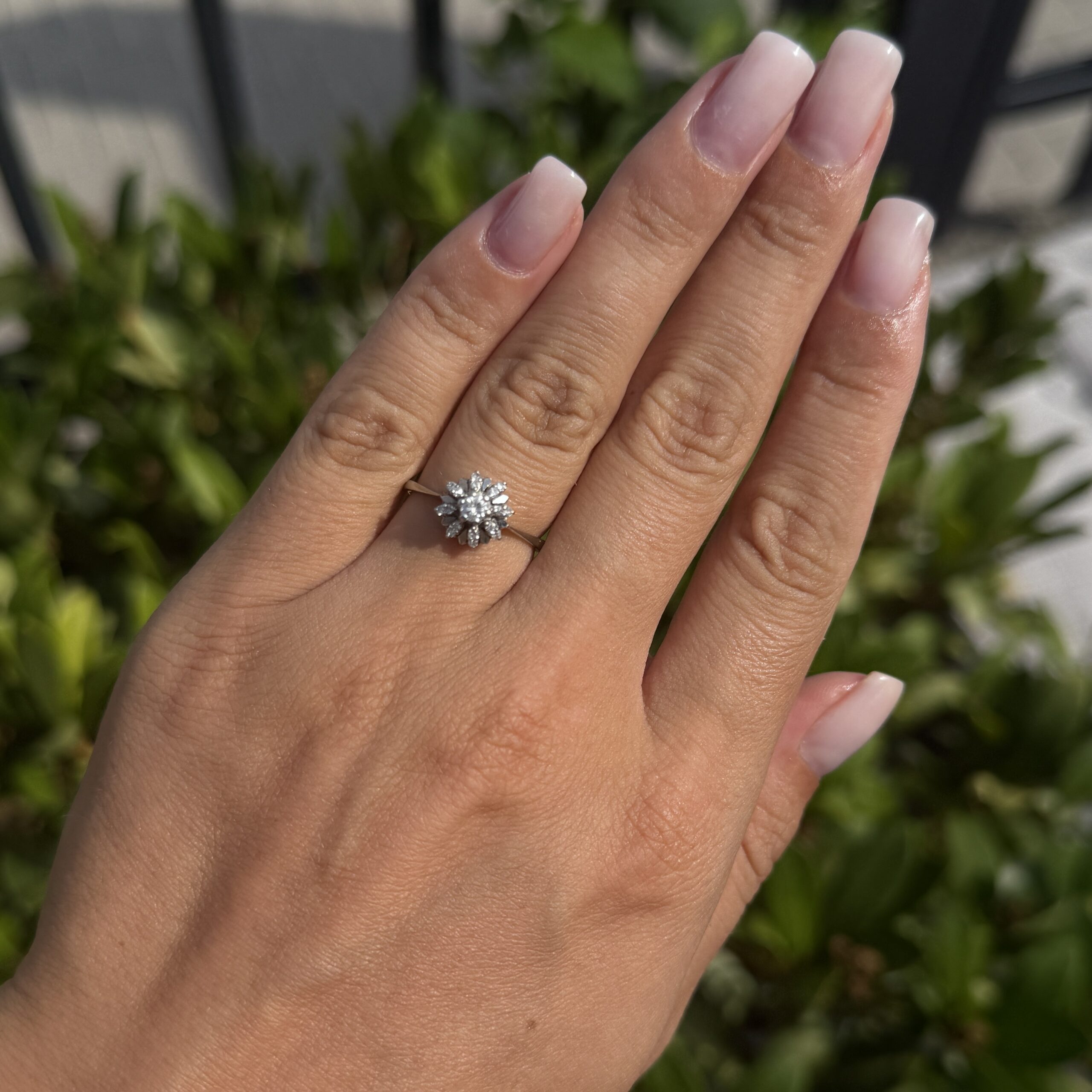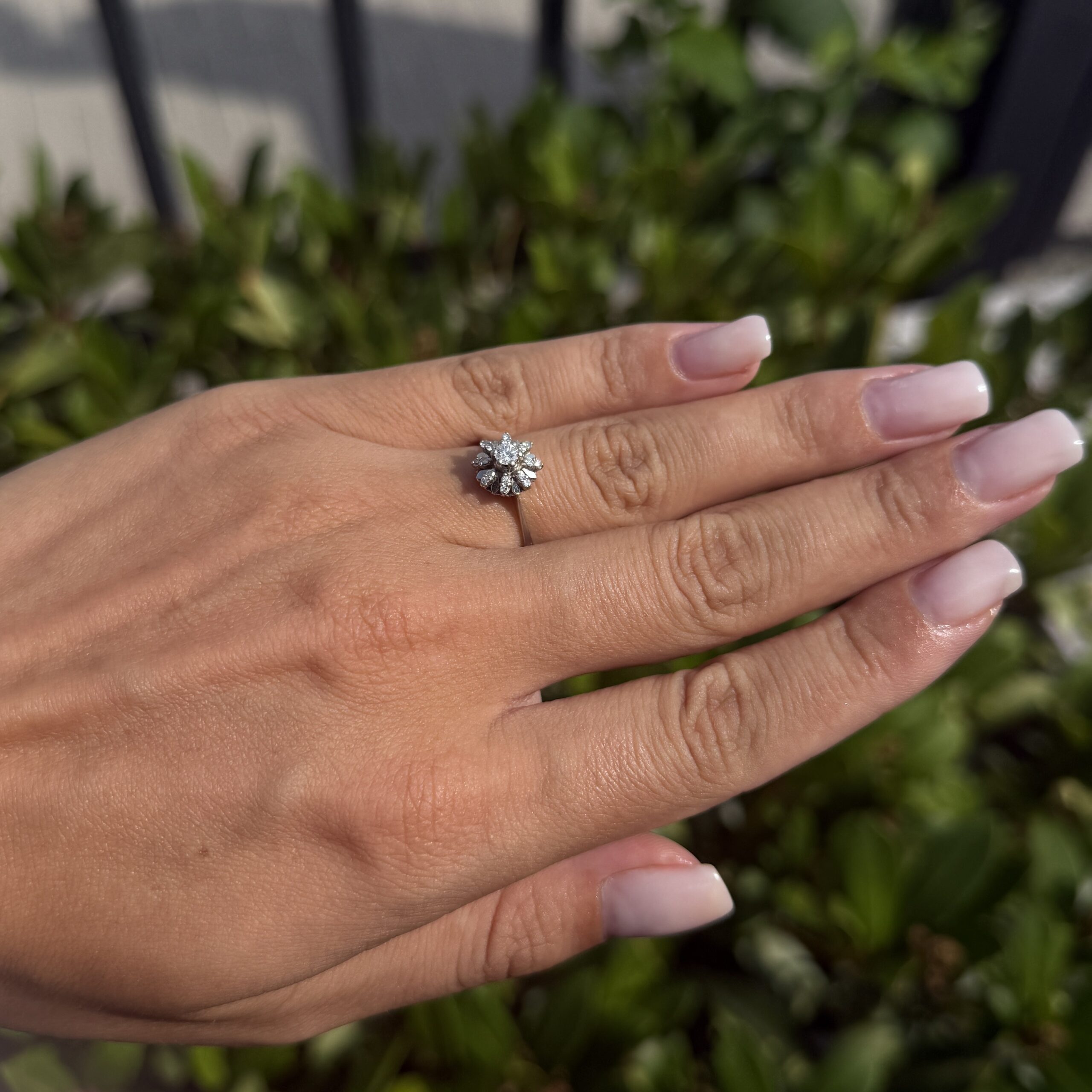 Wie ein zarter Frühlingsmorgen schmiegt sich "Petite Fleur" an Ihren Finger und lässt 17 funkelnde Brillanten zu einer poetischen Blüte aus 18 Karat Weißgold erblühen. Jeder Lichtstrahl, der auf die kostbaren Diamanten trifft, erzählt von besonderen Momenten und flüstert leise Geschichten von Liebe und Eleganz. Ein Ring, der nicht nur getragen wird – sondern der zu einem Teil Ihrer schönsten Erinnerungen wird.