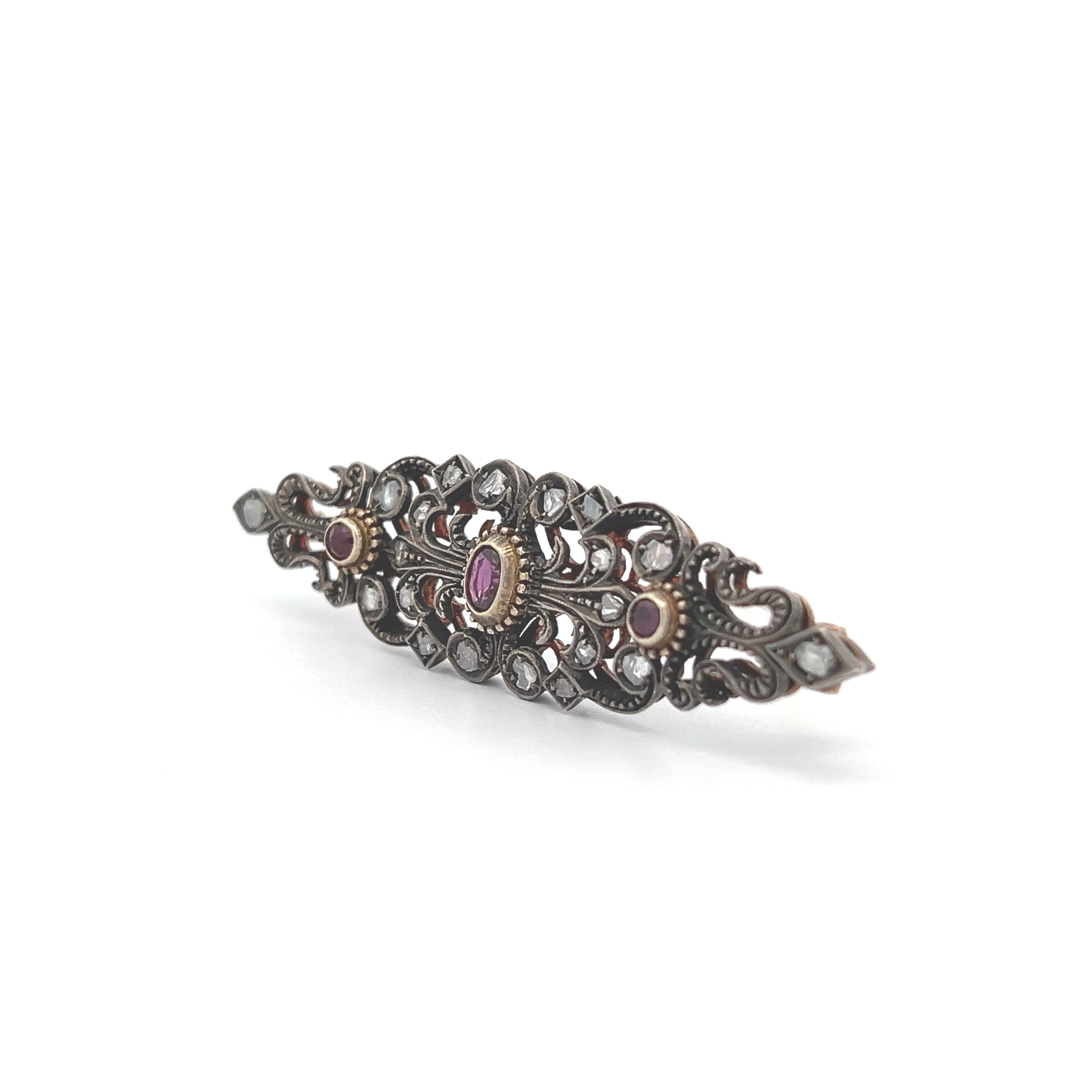 Ein funkelnder Traum aus vergangenen Zeiten – diese antike "Rosenfunkel" Brosche lässt Ihr Herz höherschlagen und verwandelt jeden Augenblick in einen besonderen Moment voller Eleganz. Wie zarte Rosenblüten im Morgentau schimmern die Diamanten im seltenen Rosenschliff, während der warme Rubin wie ein Liebesversprechen aus dem Jahr 1900 zu Ihnen flüstert. Tragen Sie ein Stück Geschichte, das Generationen von Frauen bezaubert hat und nun darauf wartet, Ihre ganz persönliche Liebesgeschichte zu erzählen.