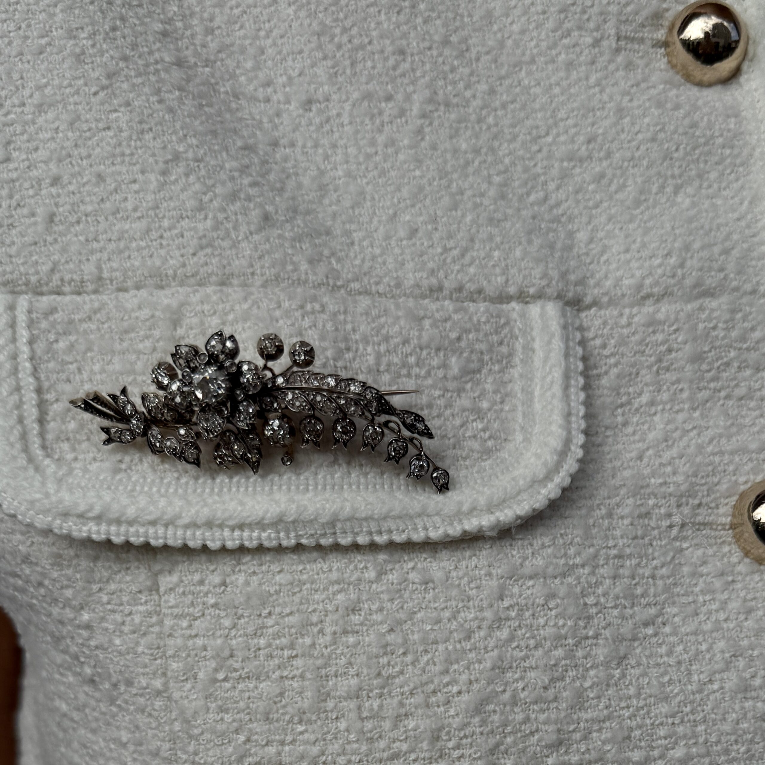 Ein Hauch von Ewigkeit ruht in den zarten Diamantrosen dieser antiken Brosche – wie ein liebevoller Gruß aus längst vergangenen Tagen, der auch heute noch Herzen zum Leuchten bringt. Jeder funkelnde Moment erzählt von romantischen Soireen und geflüsterten Liebesversprechen, während die kostbare Silber-Gold-Legierung sanft auf Ihrer Haut ruht. Lassen Sie sich von diesem außergewöhnlichen Schmuckstück aus dem Jahre 1850 in eine Welt voller Eleganz und zeitloser Schönheit entführen.