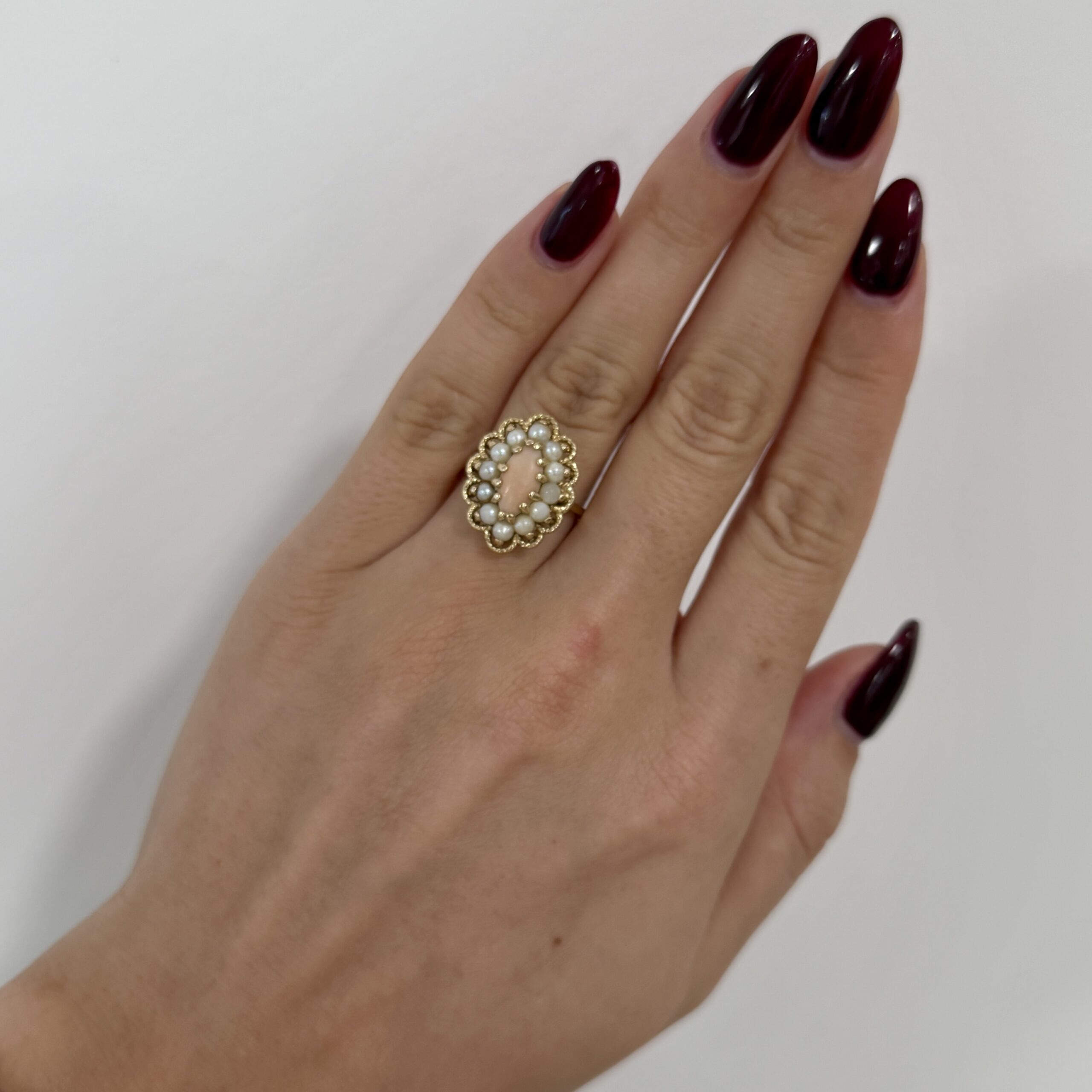 Wie sanftes Morgenlicht umschmeichelt dieser zauberhafte Vintage-Ring aus 14 Karat Gelbgold Ihre Finger – die zarte Engelshaut-Koralle und zwölf schimmernde Perlen verwandeln jeden Augenblick in pure Poesie. Spüren Sie, wie die warme Romantik vergangener Zeiten in Ihrem Herzen erwacht und sich wie ein kostbarer Schatz um Ihre Hand legt. Ein Ring, der nicht nur schmückt, sondern Ihre Seele berührt und jeden Blick in einen verliebten Moment verwandelt.