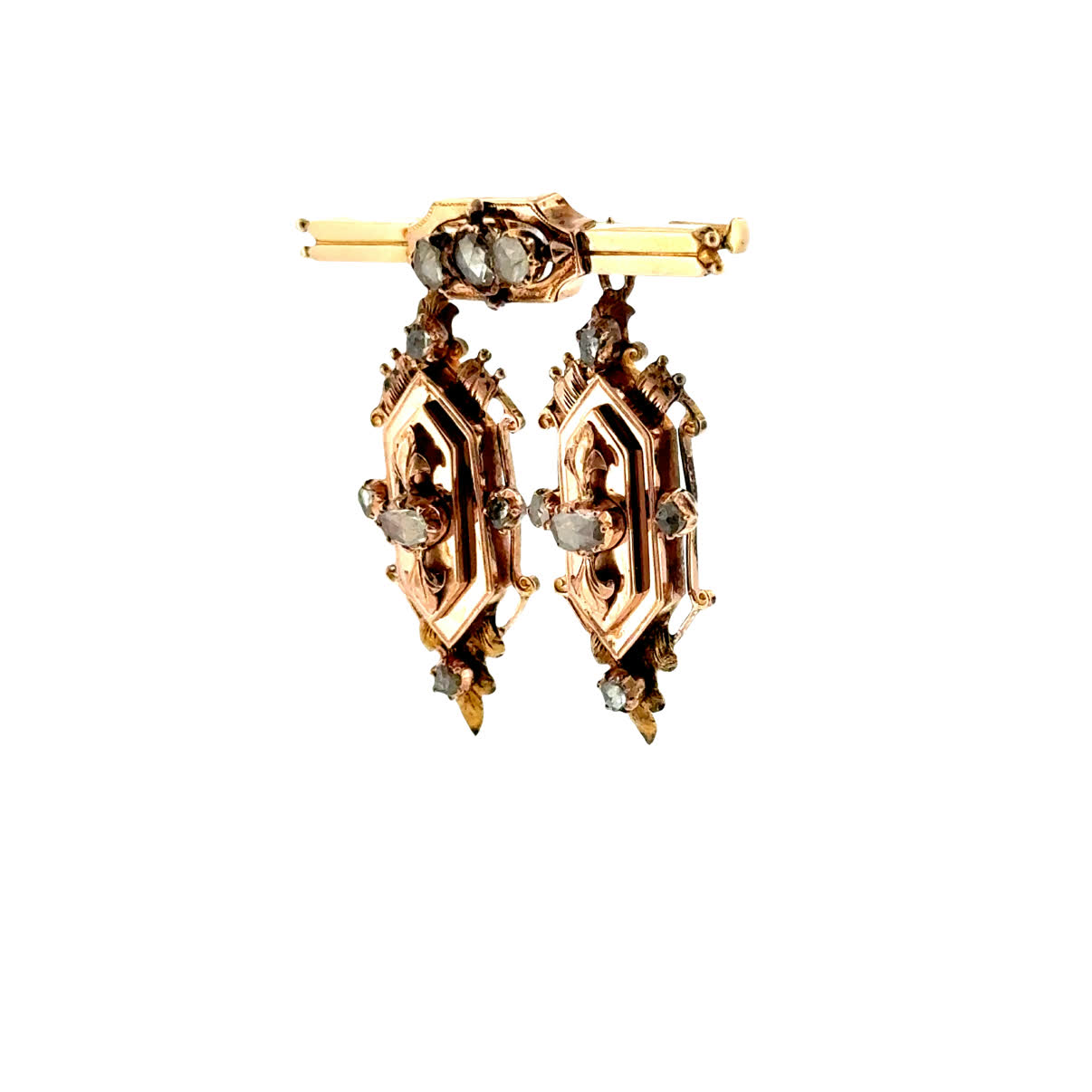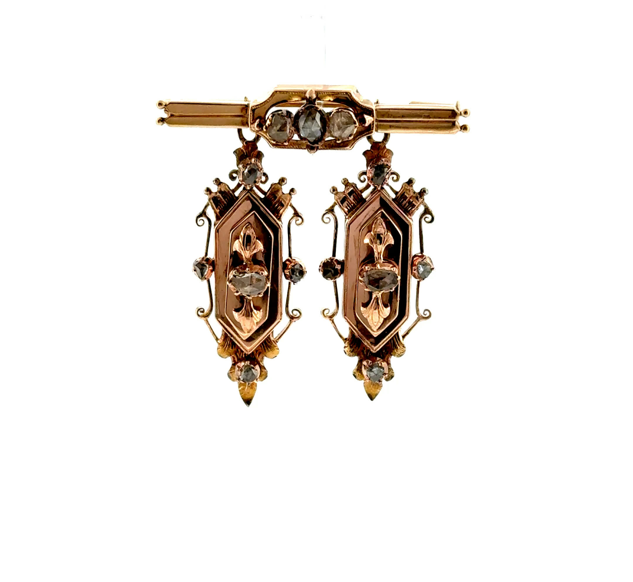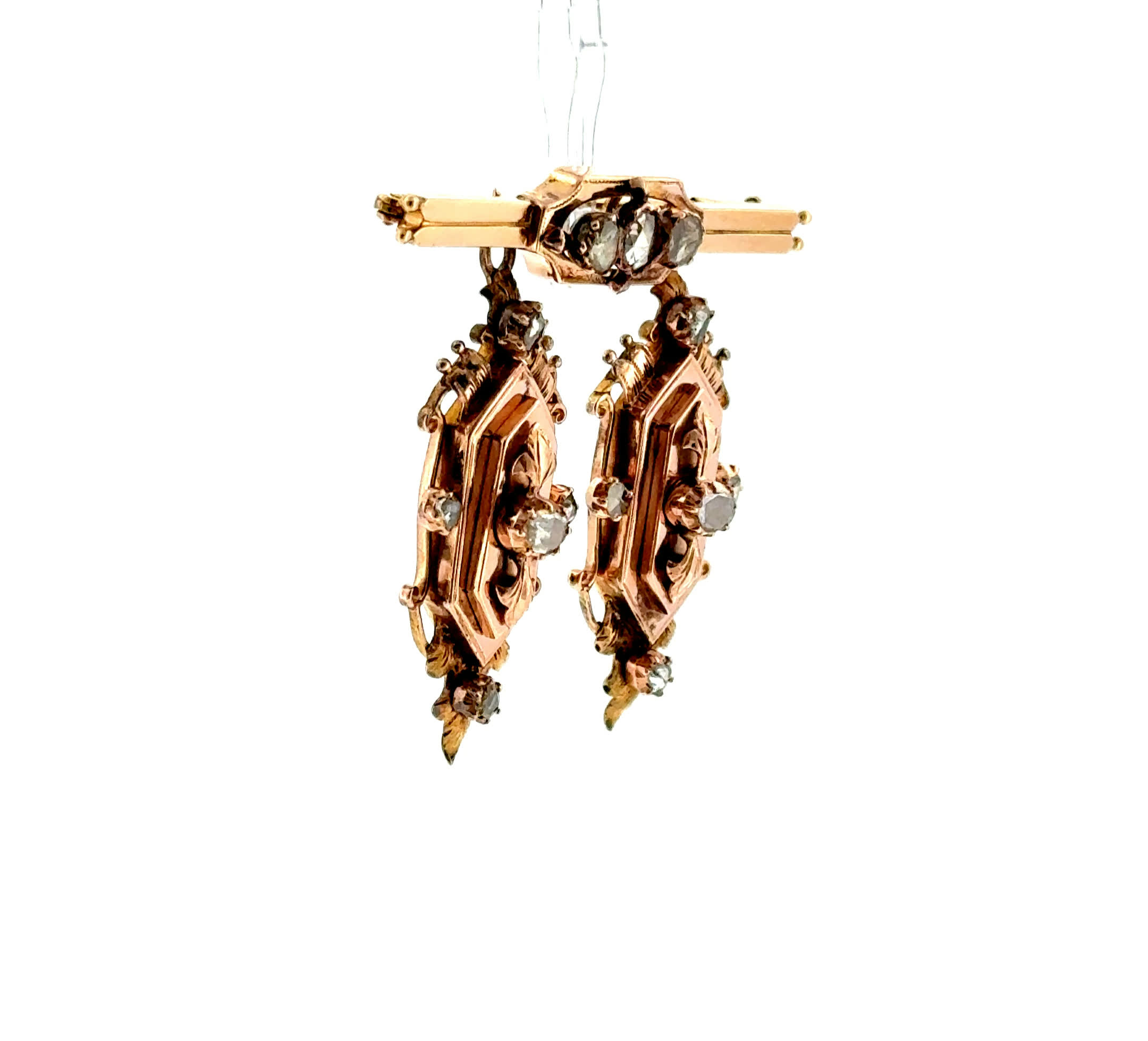 Wie ein zarter Hauch vergangener Zeiten schmiegt sich diese zauberhafte Roségold-Brosche aus dem Jahr 1890 an Ihr Dekolleté und lässt Diamantrosen in sanftem Glanz erstrahlen. Ihre beweglichen Pendel tanzen bei jeder Bewegung voller Anmut und erzählen Geschichten von eleganten Ballsälen und romantischen Momenten längst vergangener Epochen. Ein Schmuckstück, das nicht nur schmückt, sondern die Seele berührt und Sie zur strahlenden Protagonistin Ihrer eigenen Geschichte werden lässt.