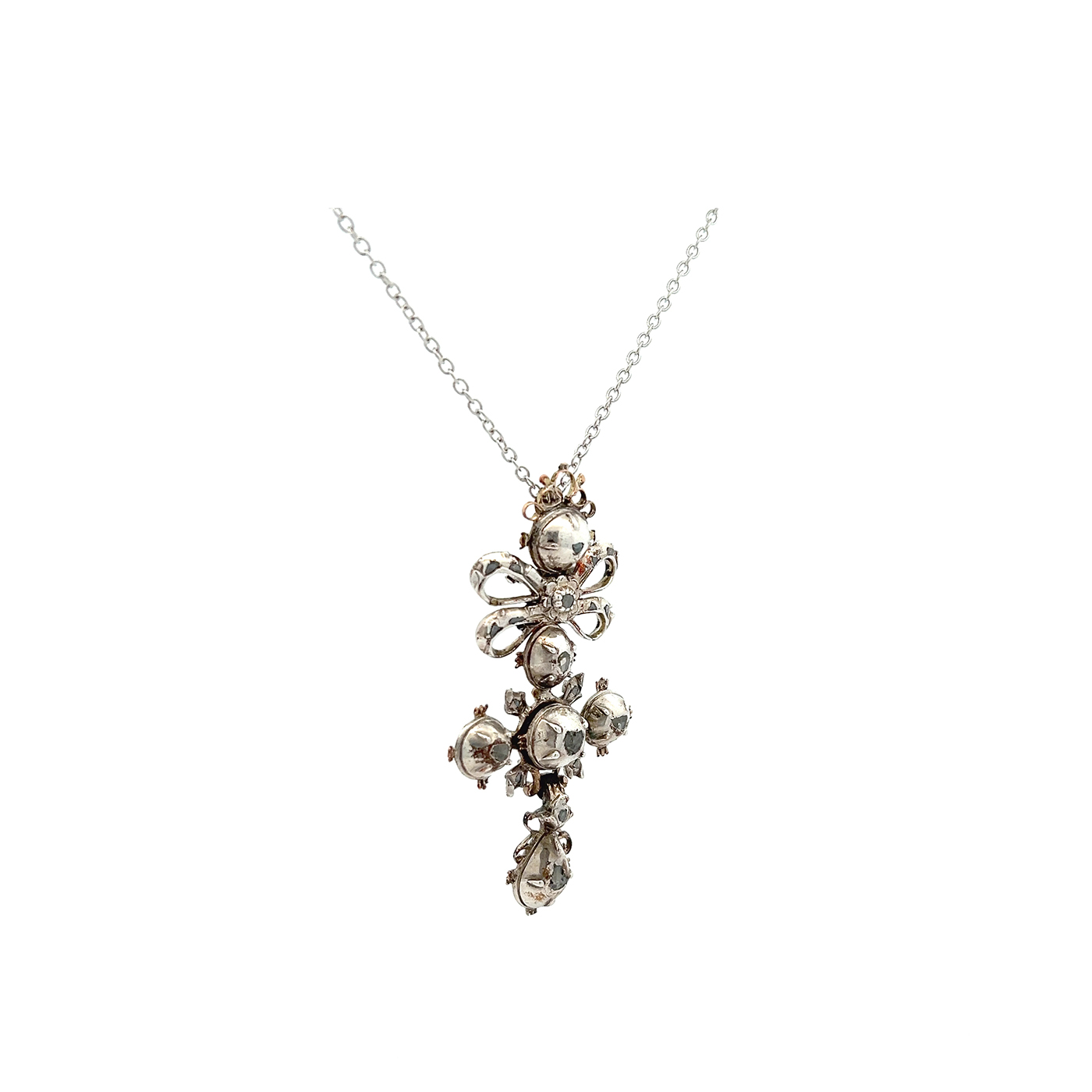 Diese Halskette aus edlem Silber trägt als Herzstück ein antikes Kreuz, verziert mit funkelnden Diamantrosen, die wie kleine Sterne aufleuchten. Jedes Detail erzählt von gelebter Geschichte und stiller Andacht – ein Schmuckstück, das Glauben, Schönheit und zeitlose Eleganz in sich vereint.