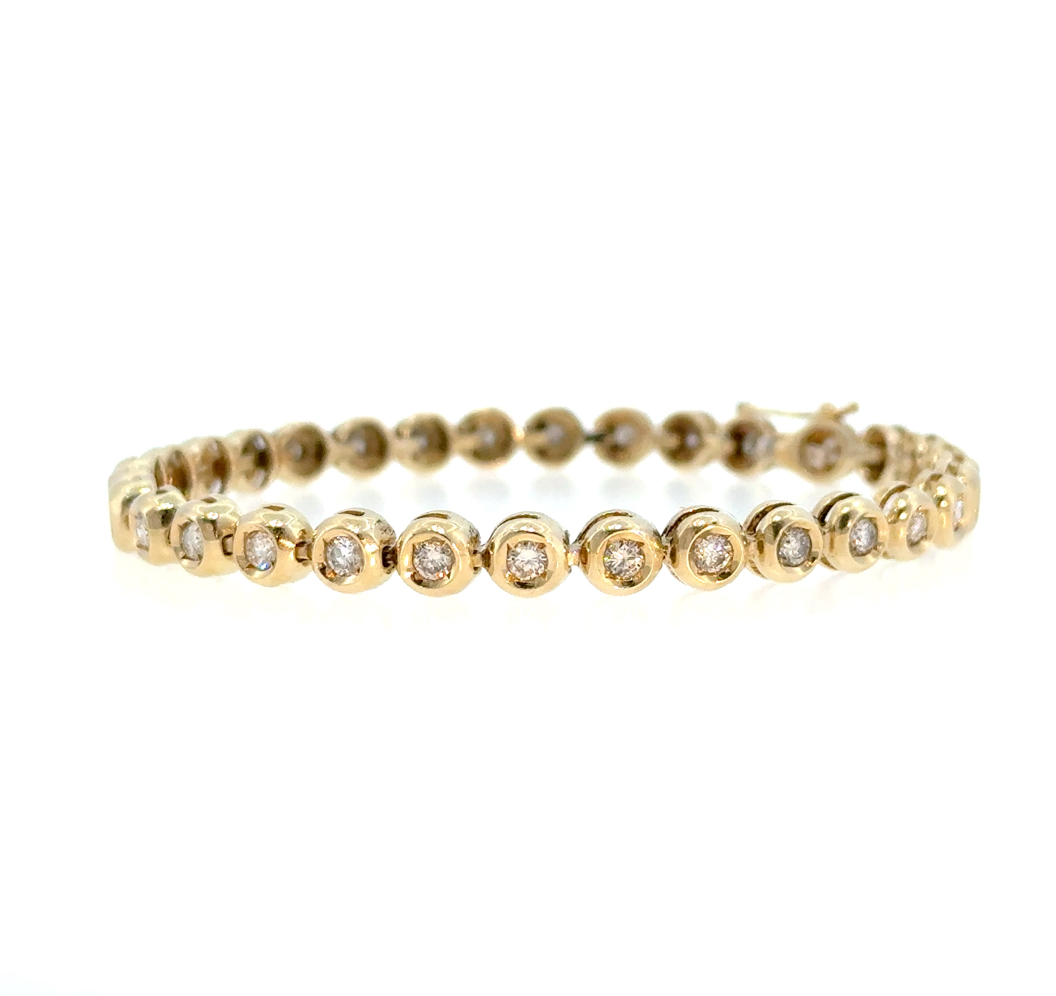 Ein Vintage-Tennisarmband aus warmem 585er Gelbgold – wie ein goldener Strom aus Licht, der sanft um Ihr Handgelenk fließt und mit jedem Brillanten eine Geschichte von Eleganz und Zeitlosigkeit erzählt. Die funkelnden Diamanten tanzen bei jeder Bewegung wie gefangene Sterne und verwandeln jeden Augenblick in einen besonderen Moment voller Anmut. Ein Schmuckstück, das nicht nur getragen, sondern gelebt wird – ein treuer Begleiter für alle kostbaren Erinnerungen, die noch kommen werden.