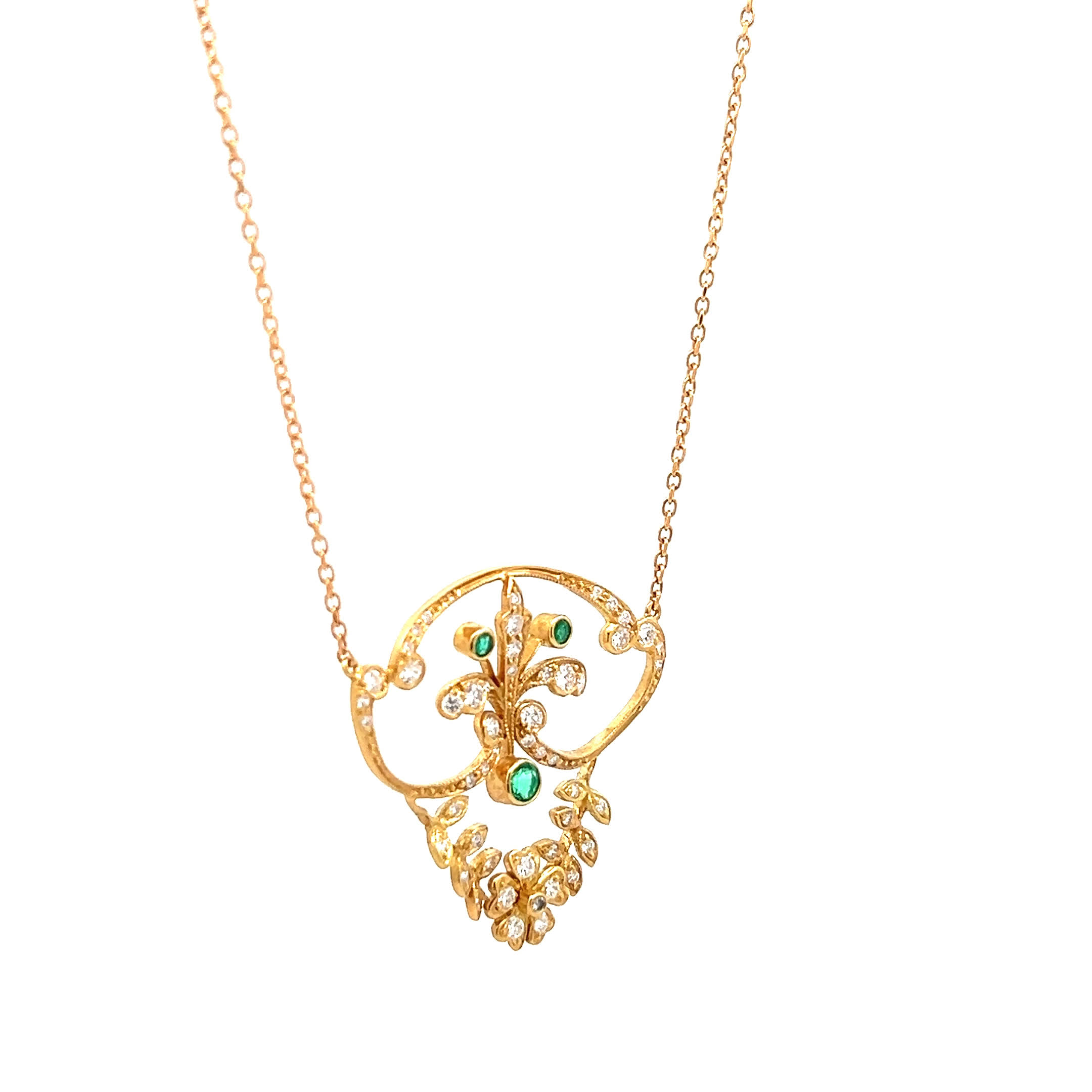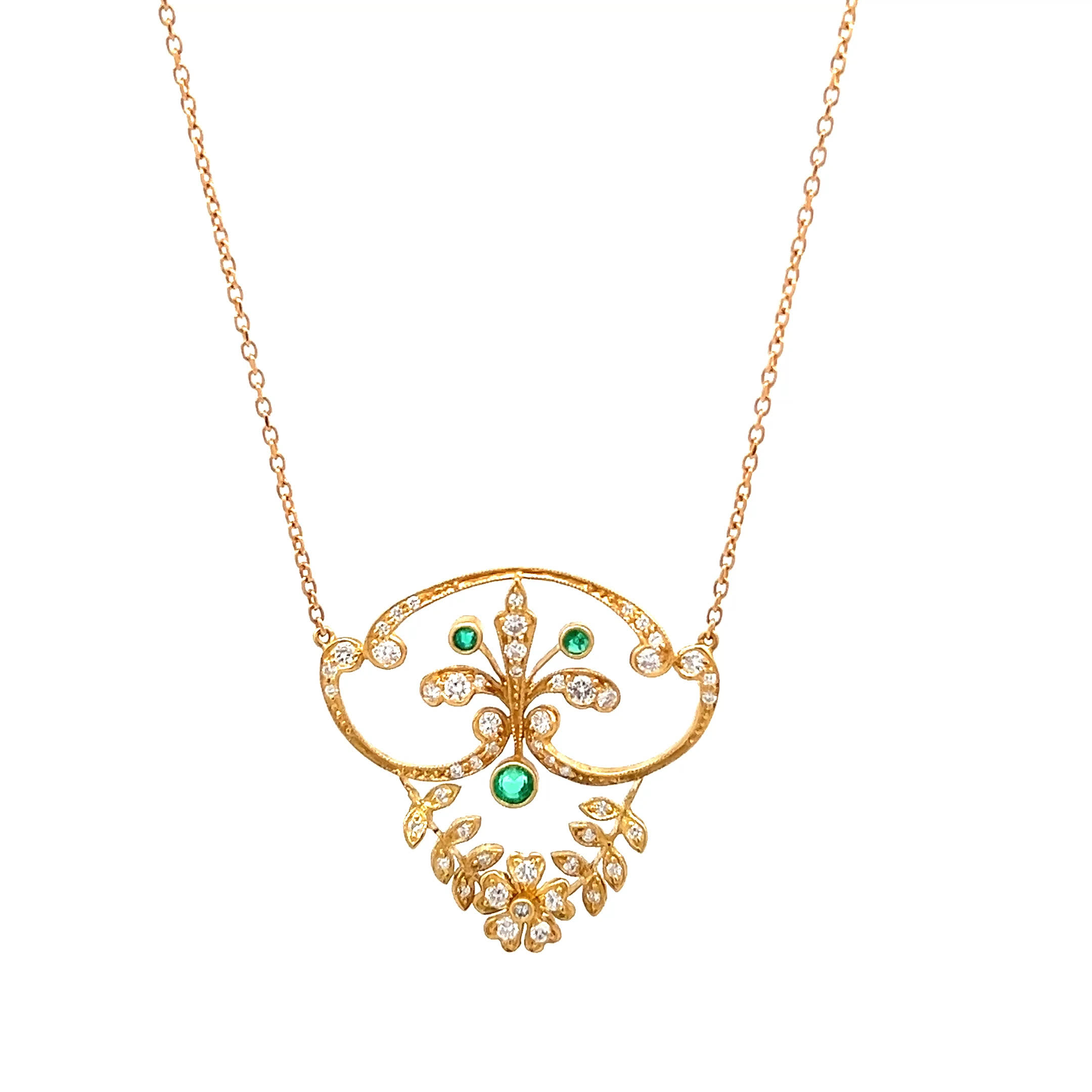 Das "Smaragdglanz" Vintage Collier verwandelt jeden Augenblick in pure Poesie – seine funkelnden Brillanten fangen das Licht ein wie eingefangene Sterne und lassen Ihr Dekolleté in märchenhaftem Glanz erstrahlen. Spüren Sie, wie dieses zeitlose Juwel aus 18 Karat Gelbgold Ihre natürliche Eleganz unterstreicht und Ihnen das Gefühl schenkt, die Hauptrolle in Ihrem eigenen glamourösen Leben zu spielen. Ein Schmuckstück, das nicht nur getragen, sondern gelebt wird – für Momente, die in Erinnerung bleiben.