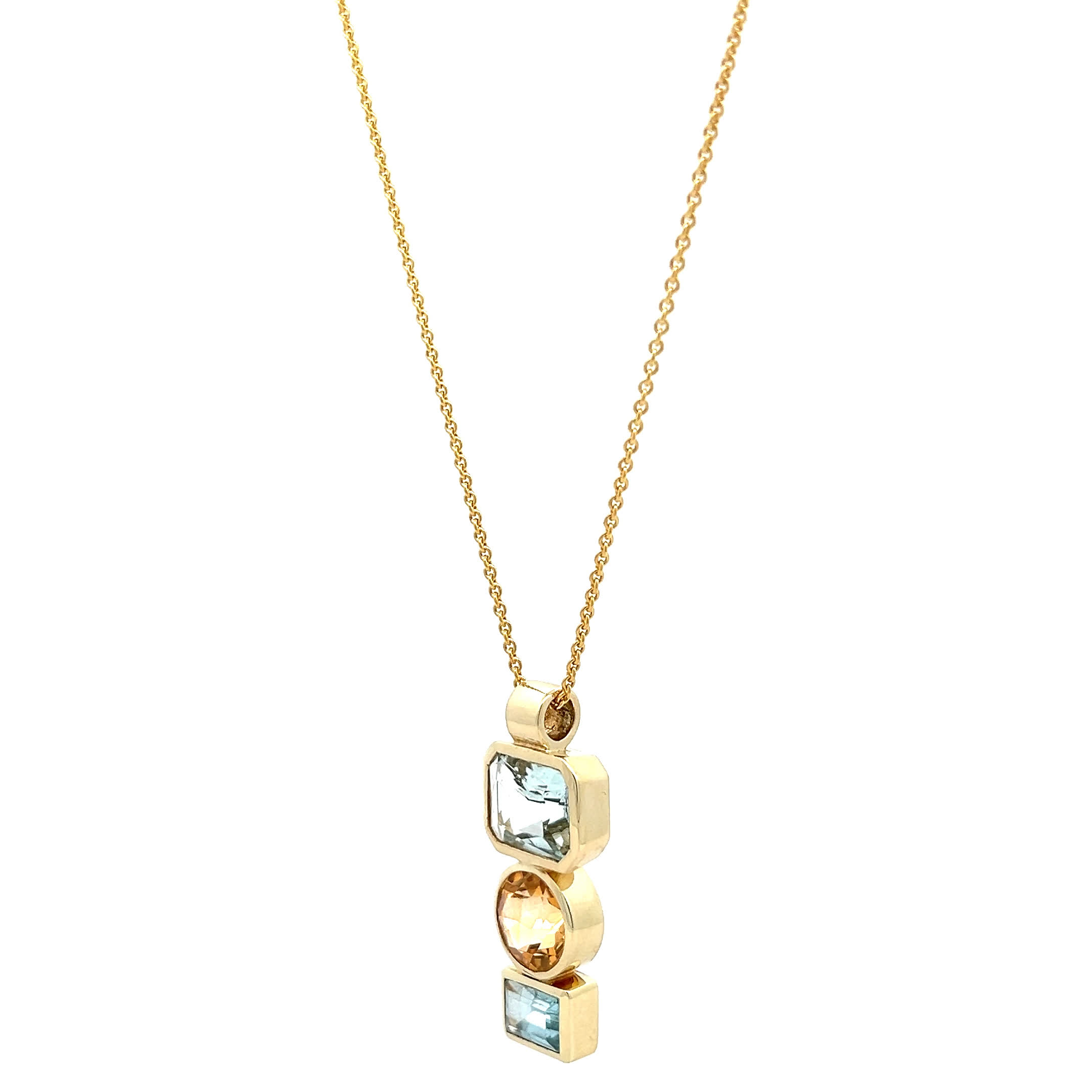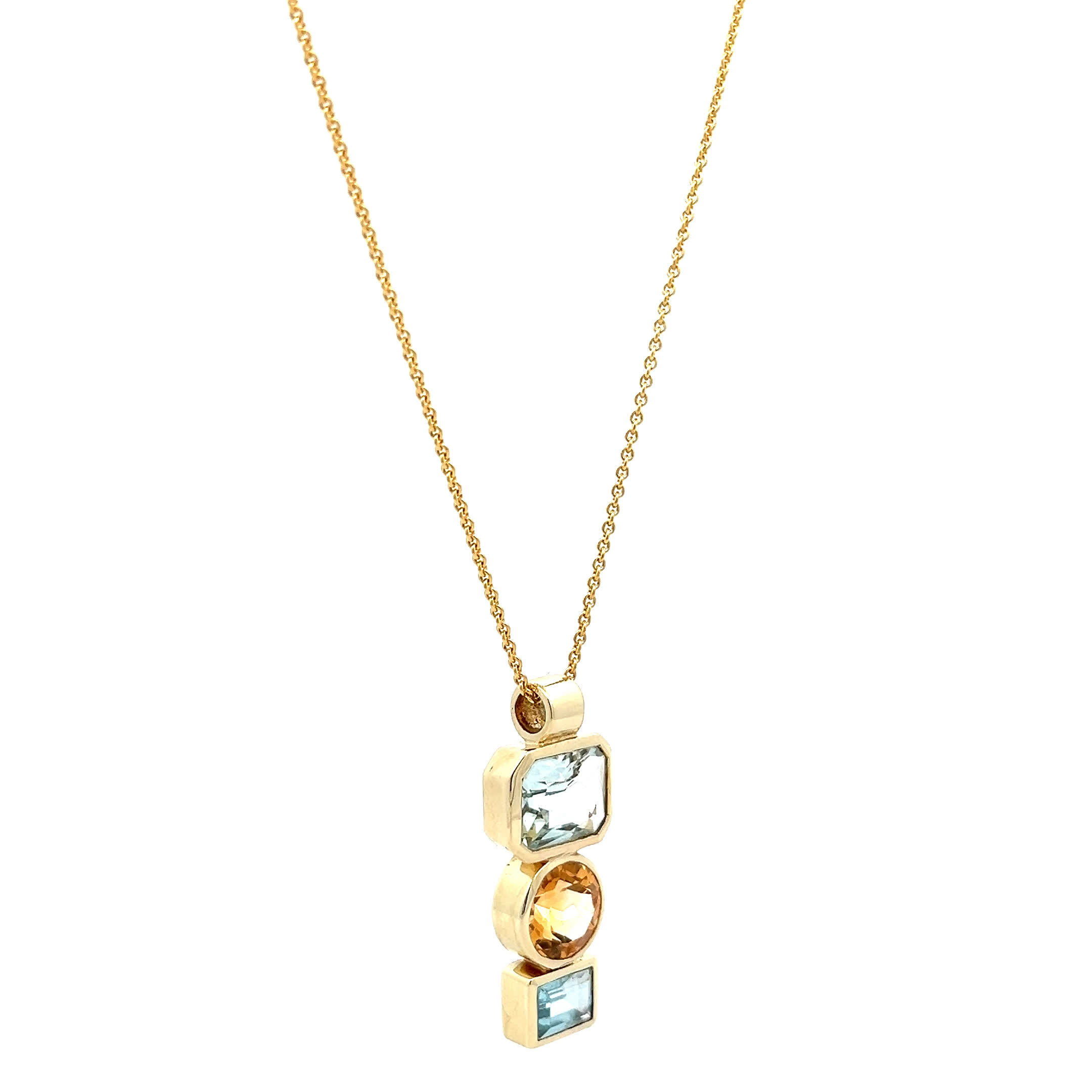 „Sonnenhimmel" – ein Name, der Versprechen trägt und Träume wahr werden lässt. Wie ein warmer Sommermorgen umschmeichelt diese Vintage-Kette aus 14kt Gelbgold Ihre Haut, während Aquamarin, Citrin und Blautopas wie eingefangene Himmelsmomente um Ihr Dekolleté tanzen. Ein Schmuckstück, das nicht nur getragen wird, sondern das Sie in jeden besonderen Augenblick hineinträgt – voller Licht, voller Leben, voller unvergesslicher Erinnerungen.