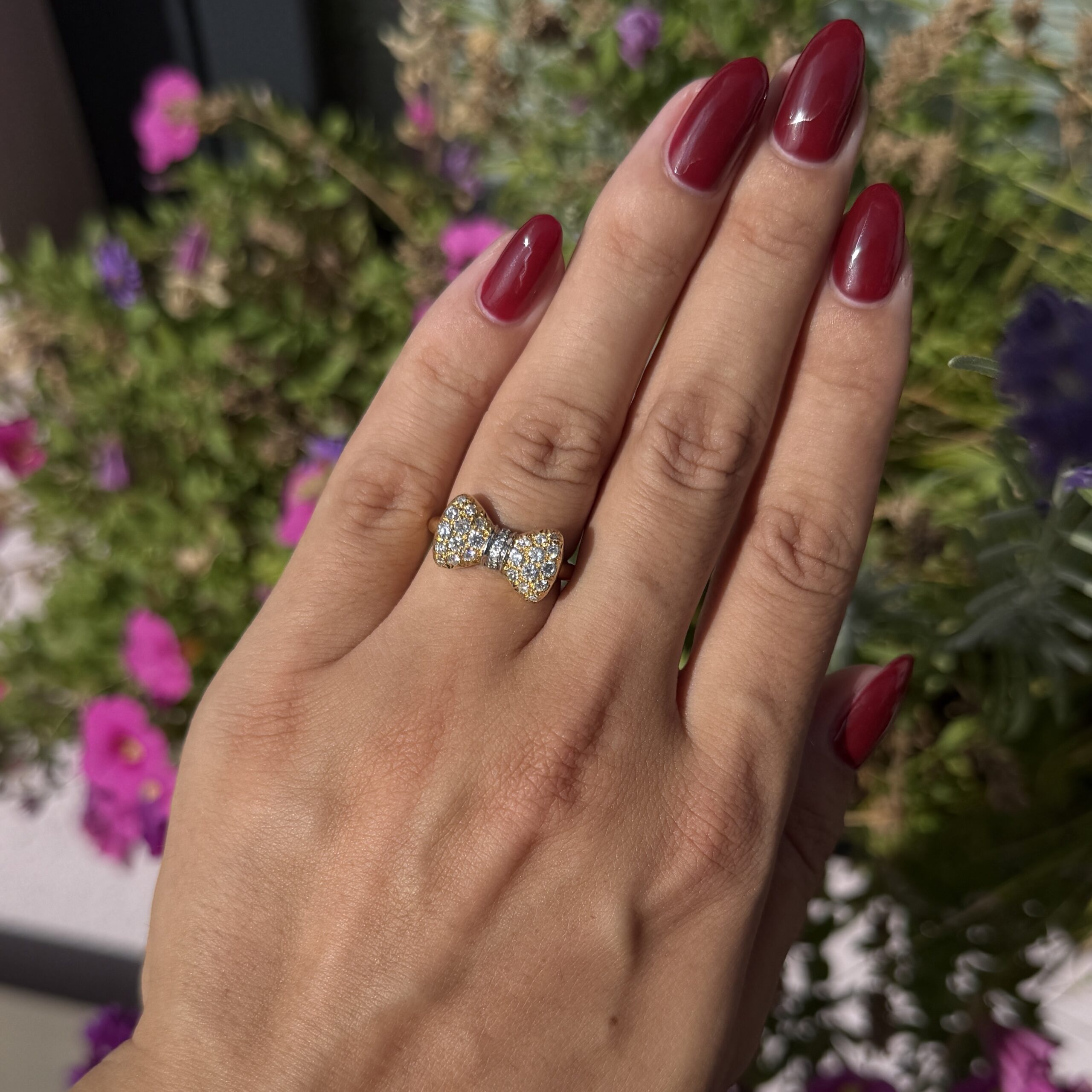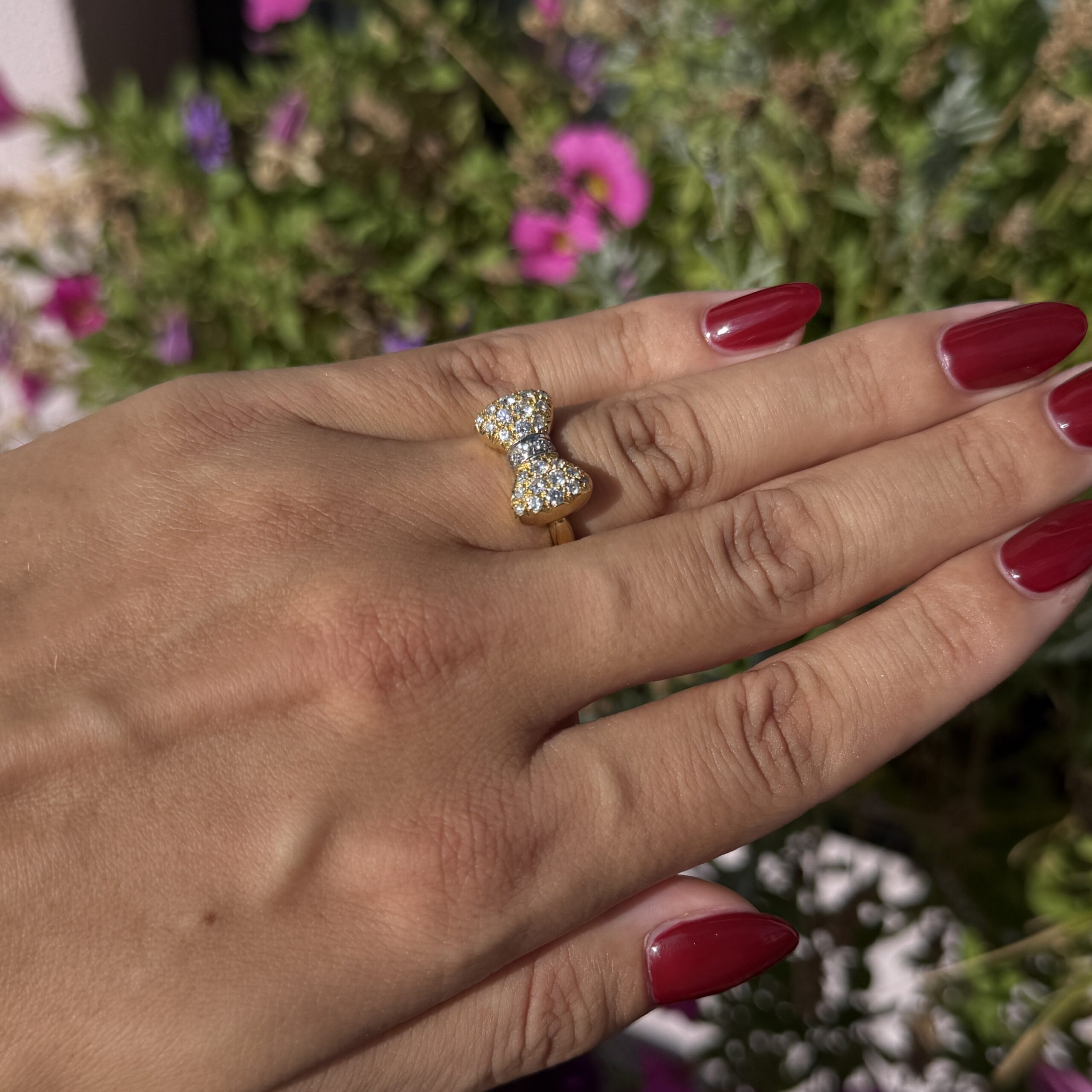Ein zarter Schwung aus 750er Gold formt eine elegante Schleife, in deren Linien funkelnde Brillanten erstrahlen.
