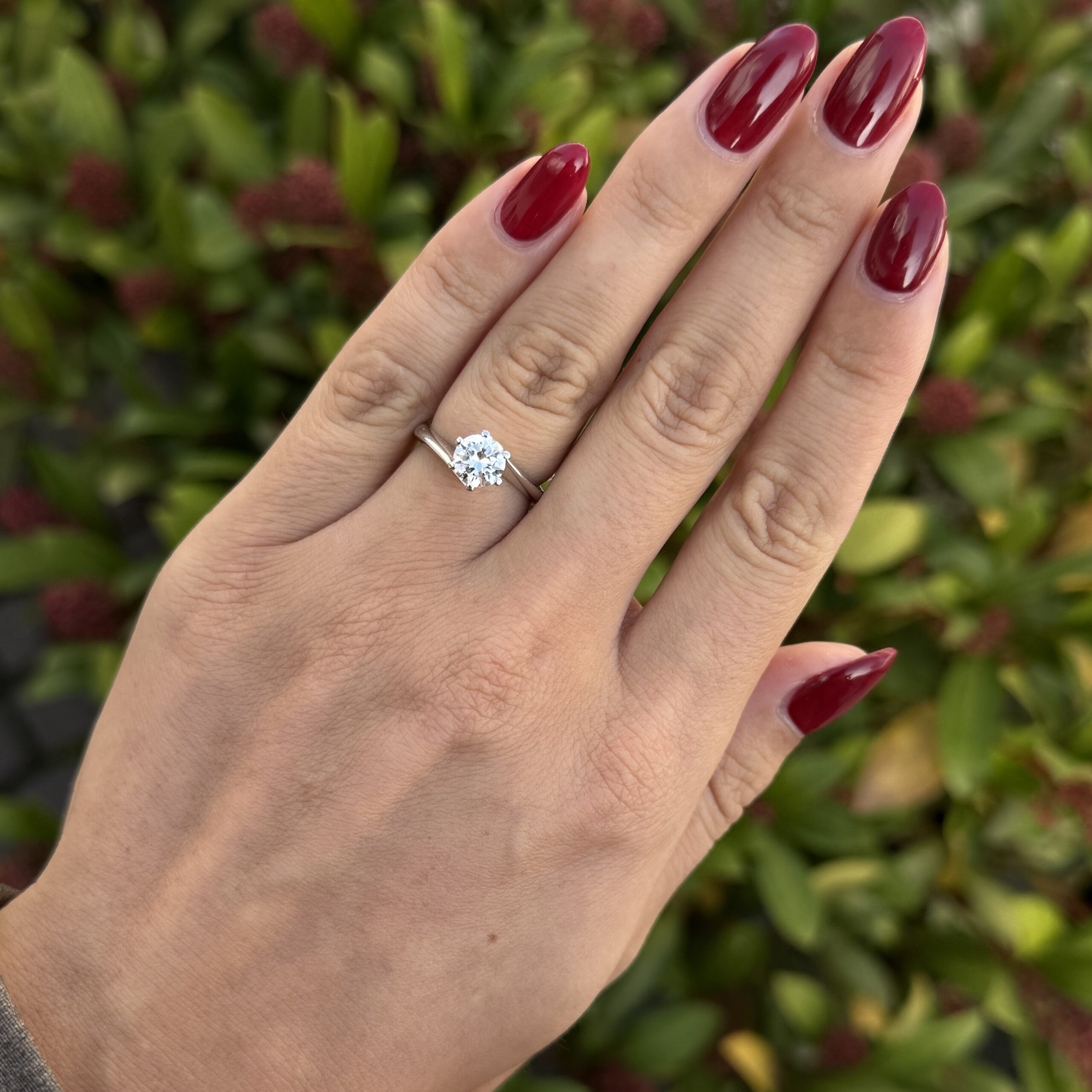 Ein Verlobungsring aus edlem Weißgold, gekrönt von einem Brillanten von 1,10 ct. (VVS2, E). Strahlend rein und von vollendeter Eleganz – ein Symbol für Liebe, die klar, stark und unvergänglich ist.