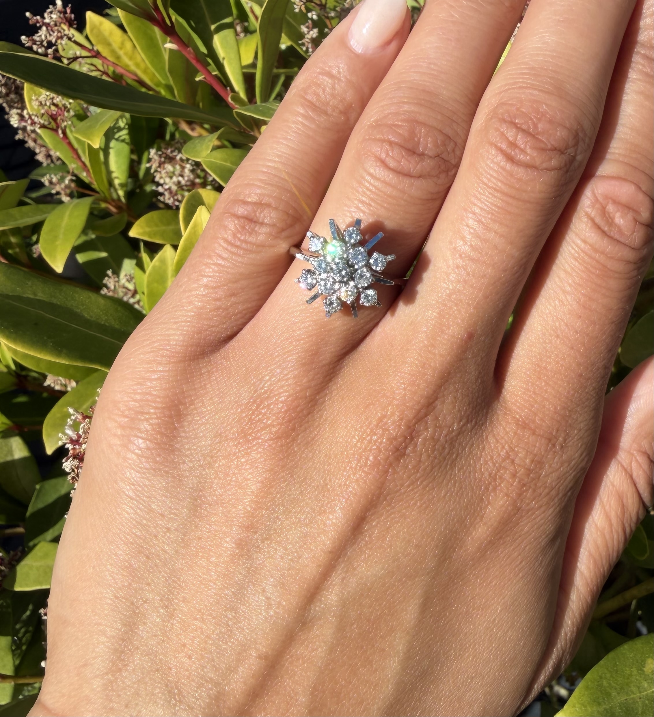 Wie ein Nachthimmel voller Sterne funkelt "Sternenfeuer" an Ihrem Finger – dreizehn kostbare Brillanten, die jeden Ihrer Momente in magisches Licht tauchen. Dieser Vintage-Ring aus edlem Weißgold flüstert Geschichten von ewiger Eleganz und trägt die Verheißung unvergesslicher Augenblicke in sich. Ein Schmuckstück, das nicht nur getragen, sondern gelebt wird – für die Frau, die weiß, dass wahre Schönheit zeitlos ist.
