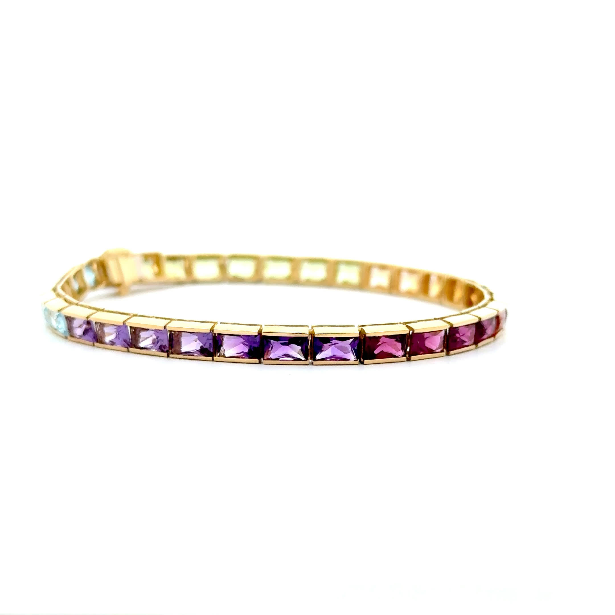 Wie ein eingefangener Sommertraum schmiegt sich "Summertime" sanft um Ihr Handgelenk – ein Kaleidoskop aus leuchtenden Edelsteinen, das jeden Moment in warmes Gold taucht. Die tanzenden Farben von Topas, Amethyst, Citrin und Peridot flüstern von endlosen Sommertagen und der unbändigen Freude, die nur kostbare Augenblicke schenken können. Ein Vintage-Schatz, der nicht nur Ihr Herz berührt, sondern auch die Seelen derer, die das Glück haben, sein sanftes Funkeln zu erblicken.