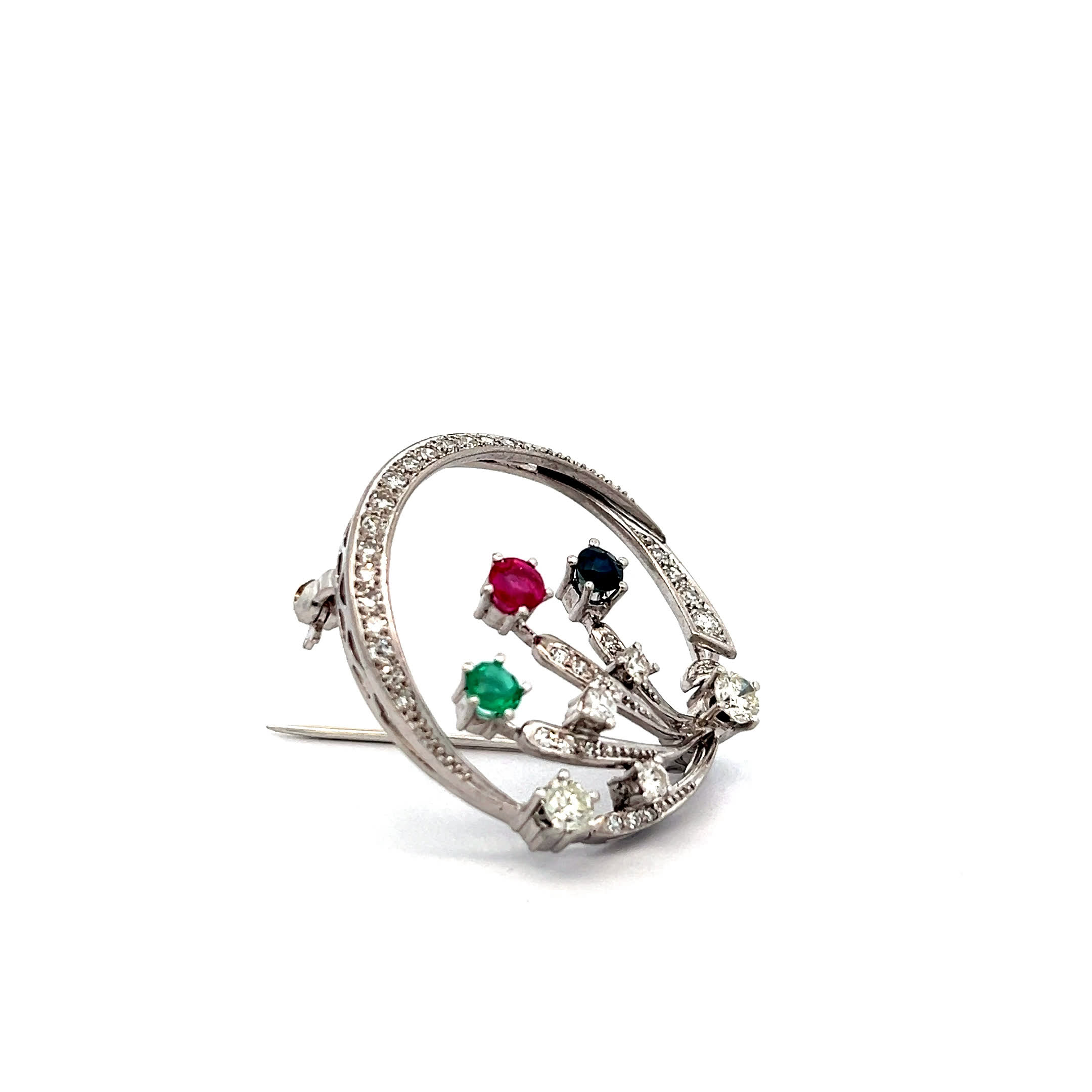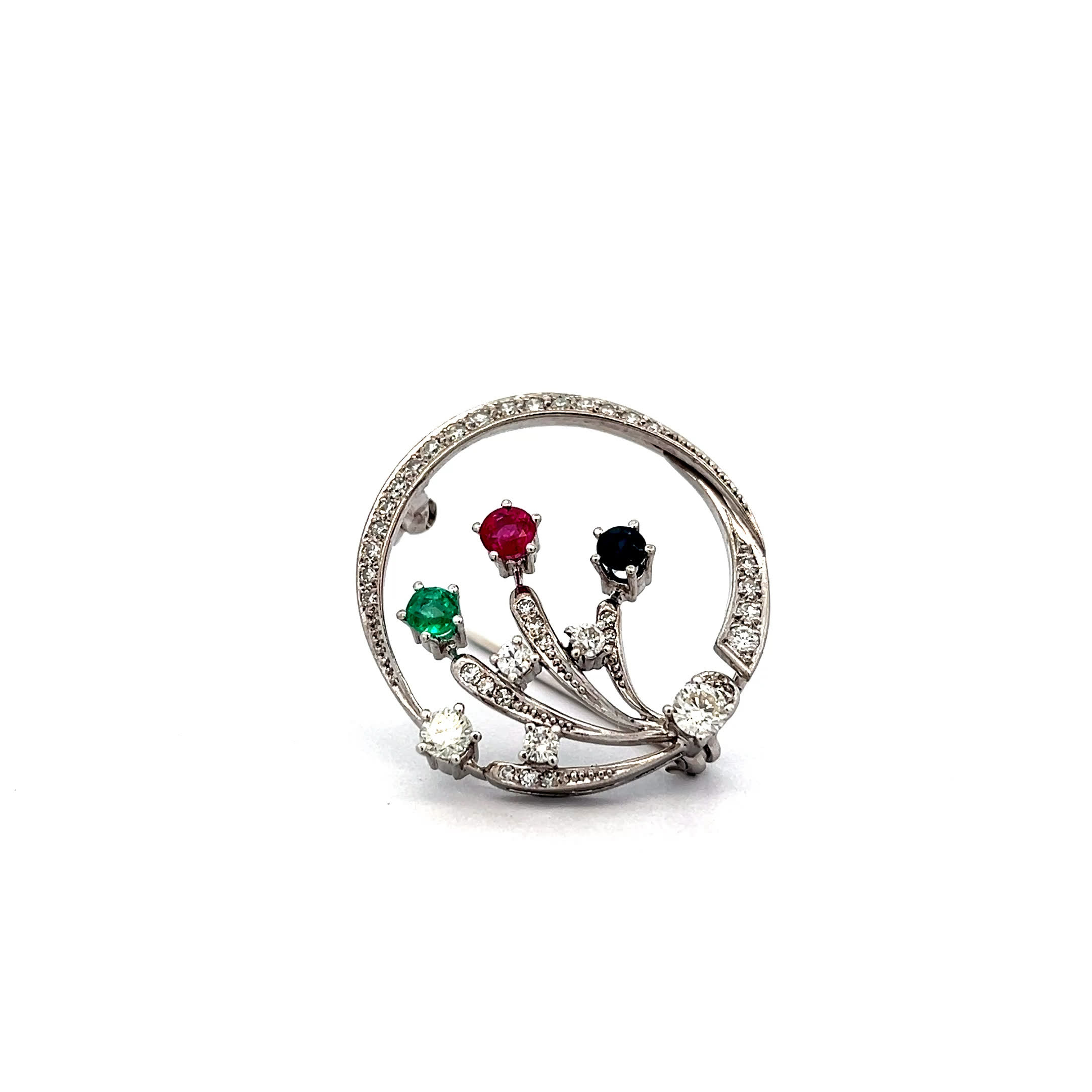 Ein funkelndes Trio aus Rubin, Saphir und Smaragd – diese Vintage-Brosche aus den 60ern ist wie ein kostbarer Schatz vergangener Zeiten, der Ihre Eleganz zum Strahlen bringt. Umrahmt von glitzernden Diamanten wird sie zum strahlenden Mittelpunkt jeder Begegnung und lässt Sie die zeitlose Magie echter Edelsteine spüren. Ein Schmuckstück, das nicht nur Blicke auf sich zieht, sondern Herzen berührt und unvergessliche Momente für die Ewigkeit bewahrt.