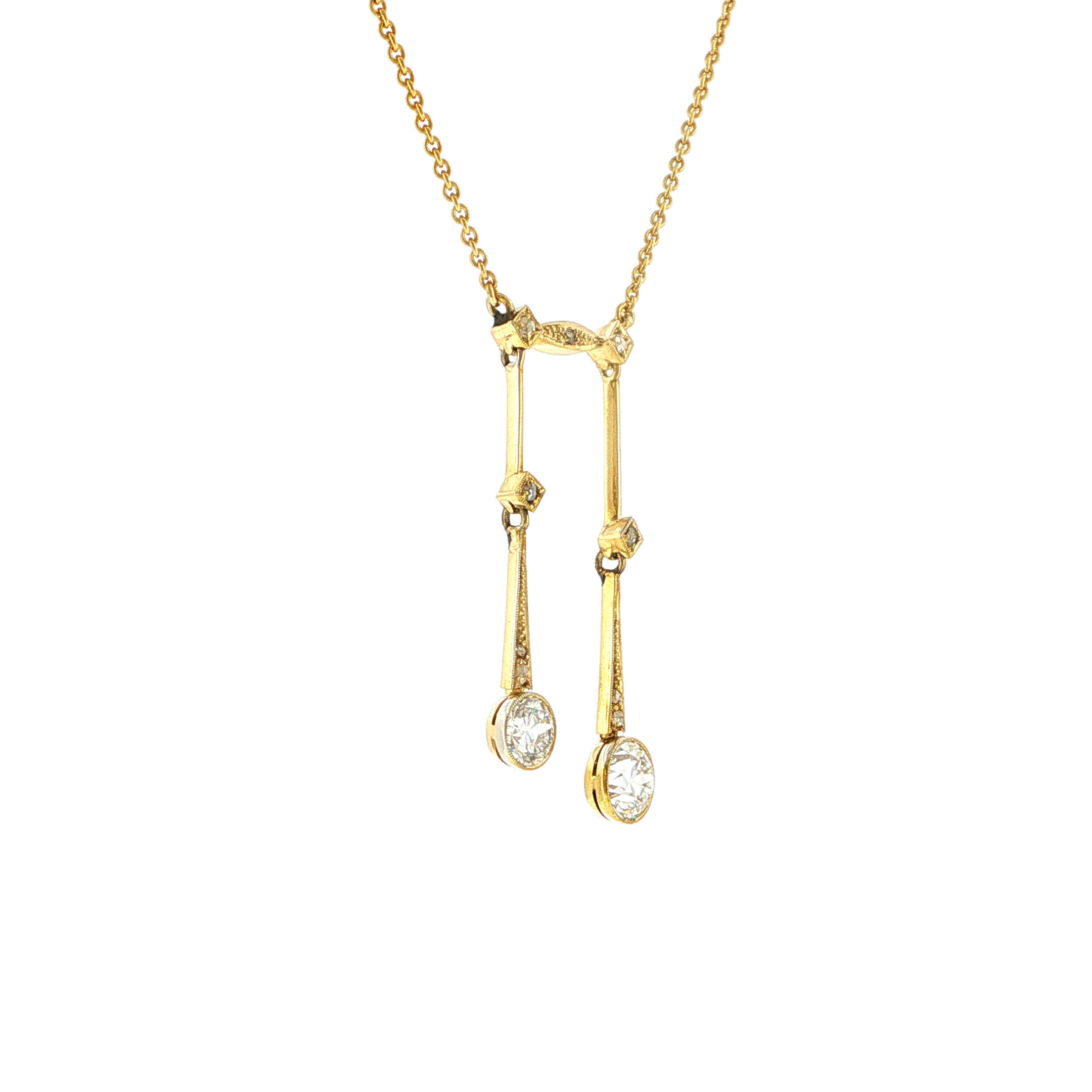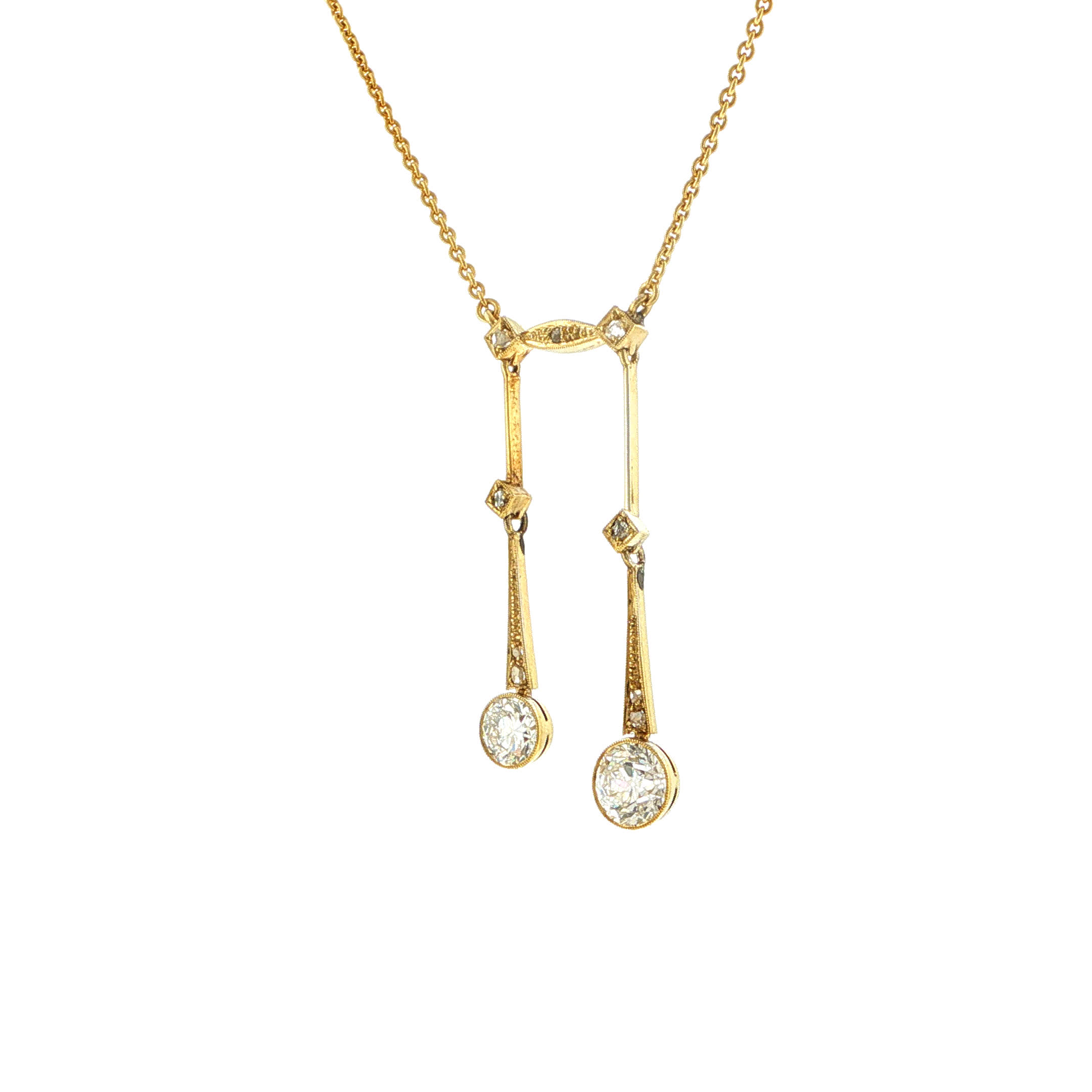 Zwei leuchtende Diamanten tanzen wie Sterne am Nachthimmel – das "Twin Lights" Collier ist pure Poesie aus warmem Gelbgold, die Ihre schönsten Momente in ewiges Licht hüllt. Spüren Sie, wie diese vintage Schönheit Ihre Haut berührt und dabei Geschichten von Eleganz und zeitloser Liebe erzählt. Ein Schmuckstück, das nicht nur getragen wird, sondern das Herz berührt und unvergessliche Erinnerungen schafft.