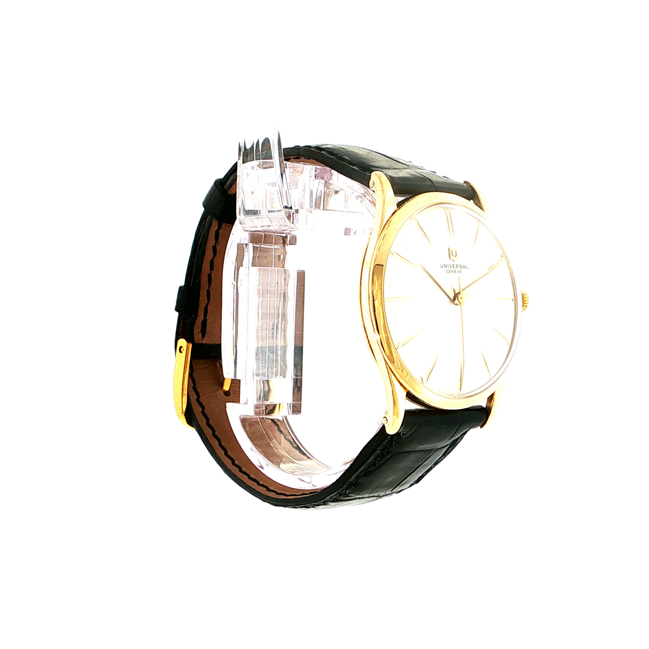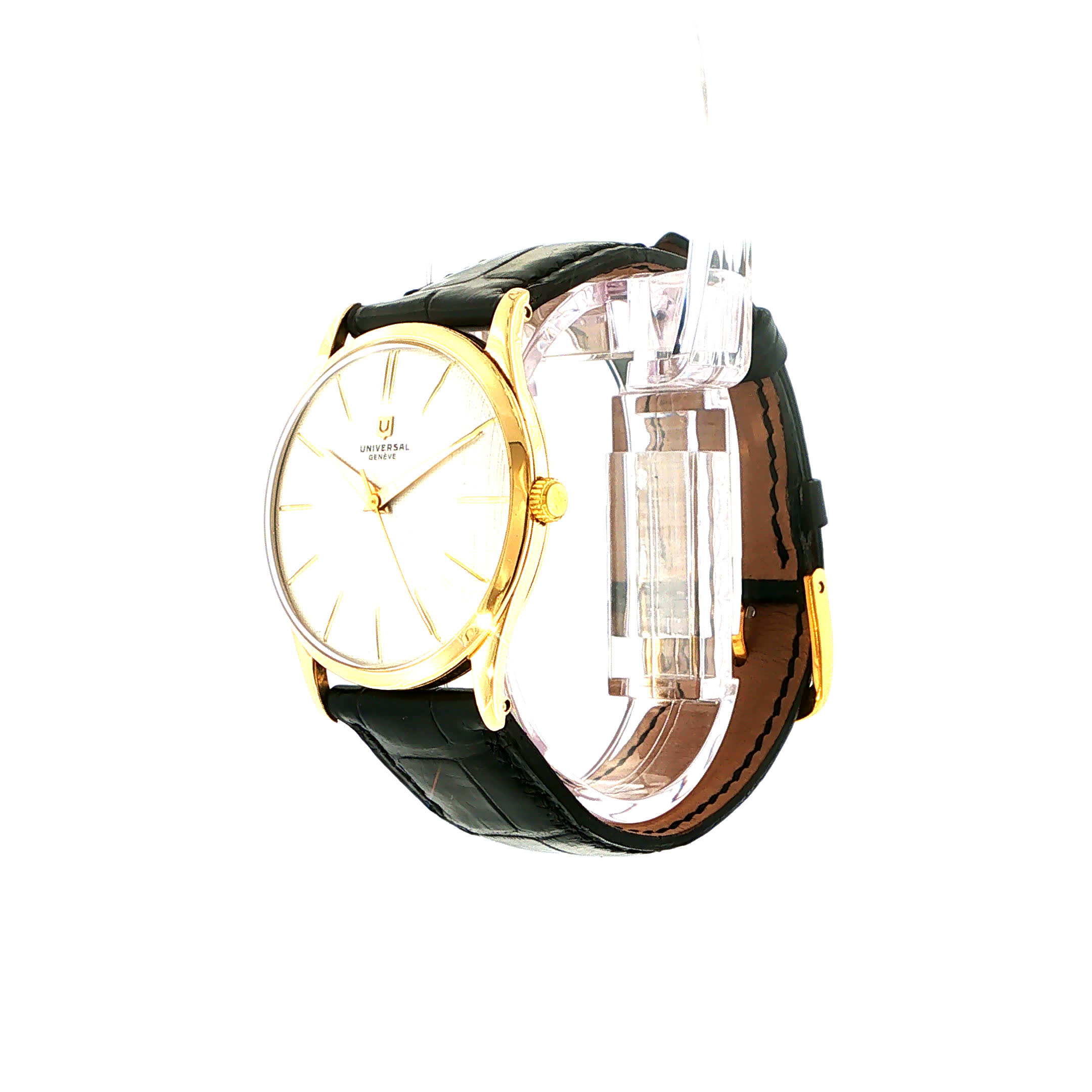 Eine Universal Genève aus den goldenen 50er Jahren – ein Zeitzeuge eleganter Momente, der seit über 60 Jahren Herzschläge und kostbare Augenblicke begleitet. Ihr warmes Gelbgold und das noble Krokodilleder flüstern Geschichten von Rendezvous bei Kerzenschein und bedeutsamen Händedrücken. Tragen Sie nicht nur eine Uhr, sondern ein Stück gelebter Träume am Handgelenk.