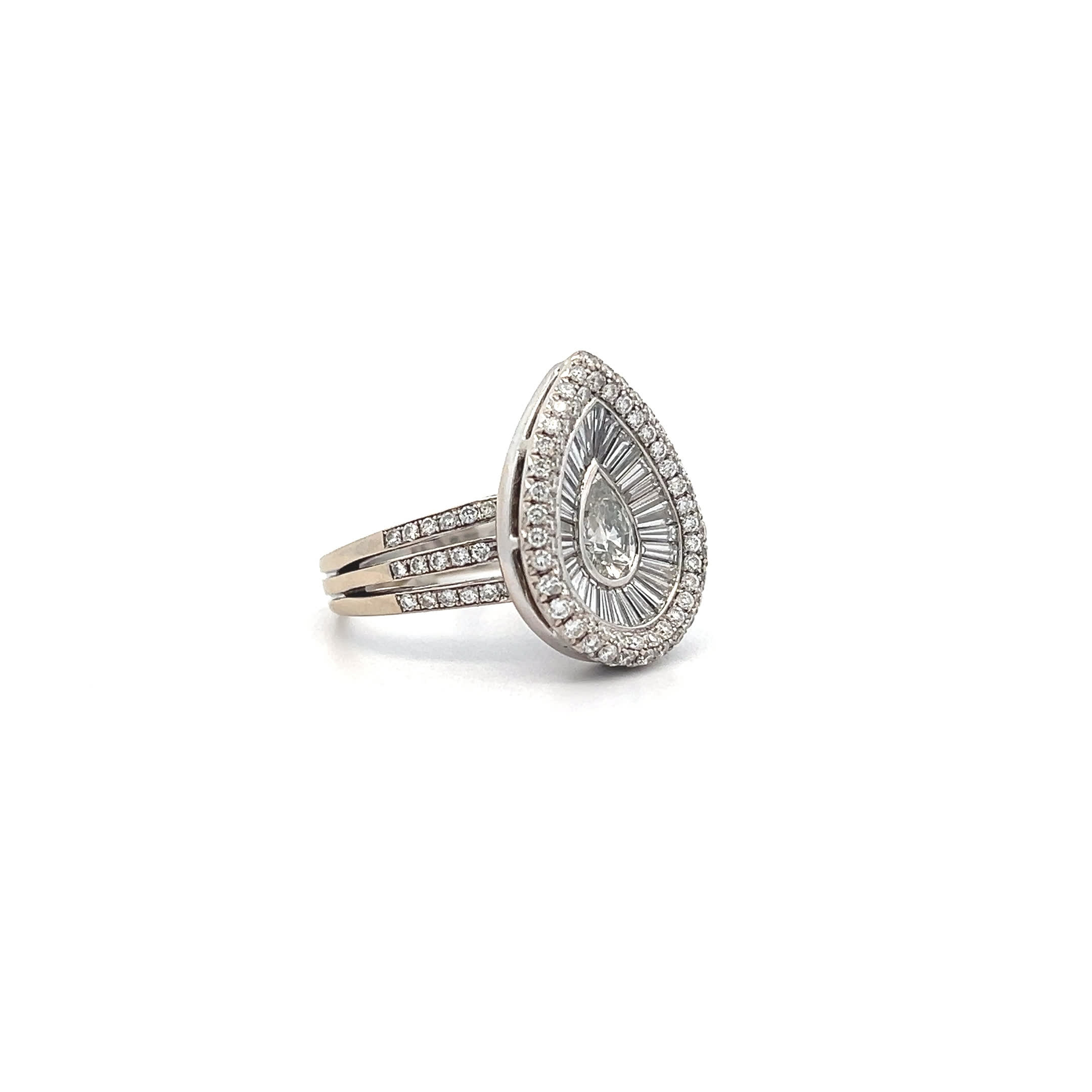 Ein Ring, der wie ein Tropfen purer Emotion funkelt – der "White Pear" mit seinem 0,71 Karat Pear-Diamanten verwandelt jeden Augenblick in eine kostbare Erinnerung. Umgeben von strahlenden Brillanten und eleganten Trapez-Diamanten in reinstem 18 Karat Weißgold, wird er zum stummen Zeugen Ihrer schönsten Momente. Ein Schmuckstück, das nicht nur getragen, sondern gefühlt wird – für die Frau, die weiß, dass wahre Schönheit von innen kommt und im Licht der Diamanten ihre perfekte Vollendung findet.