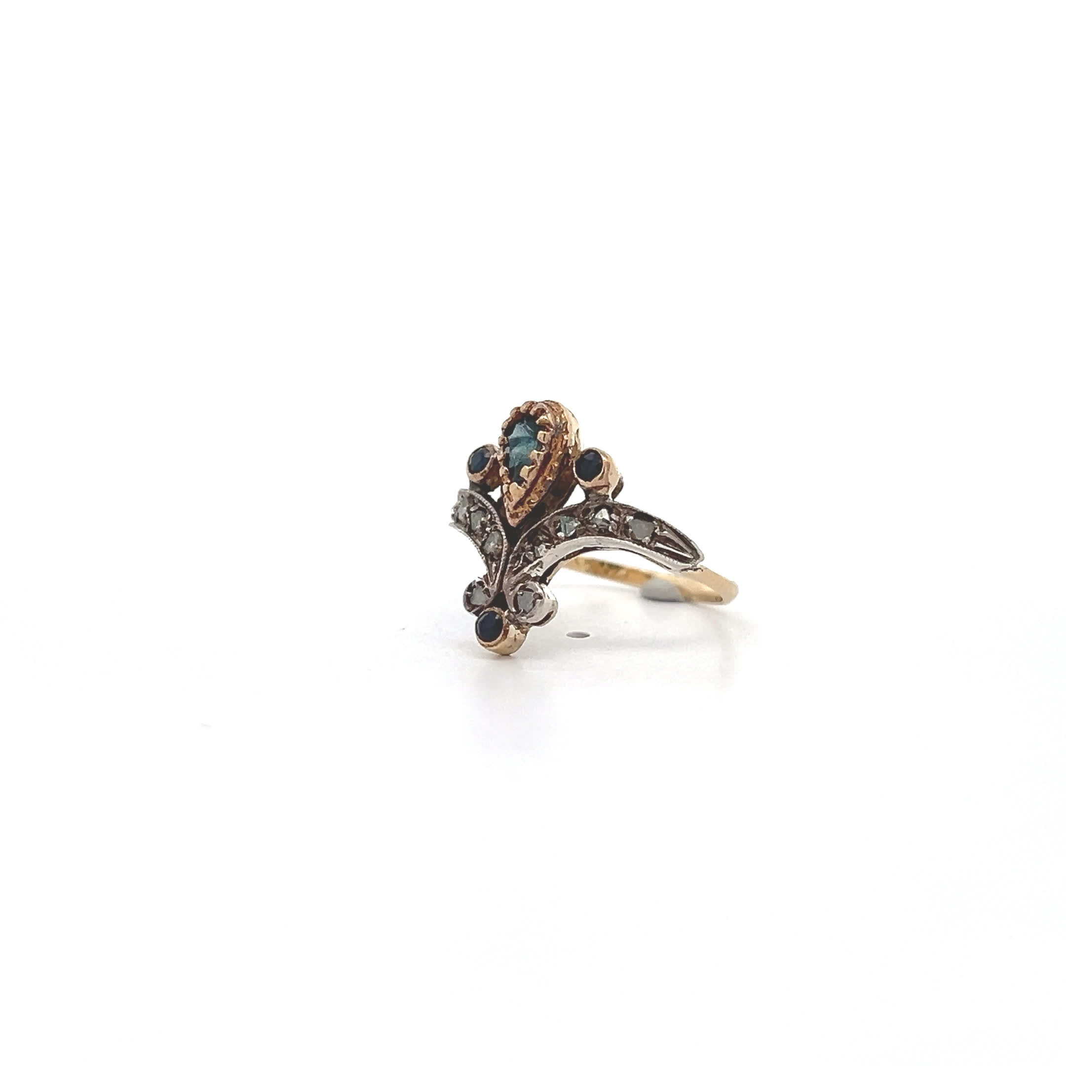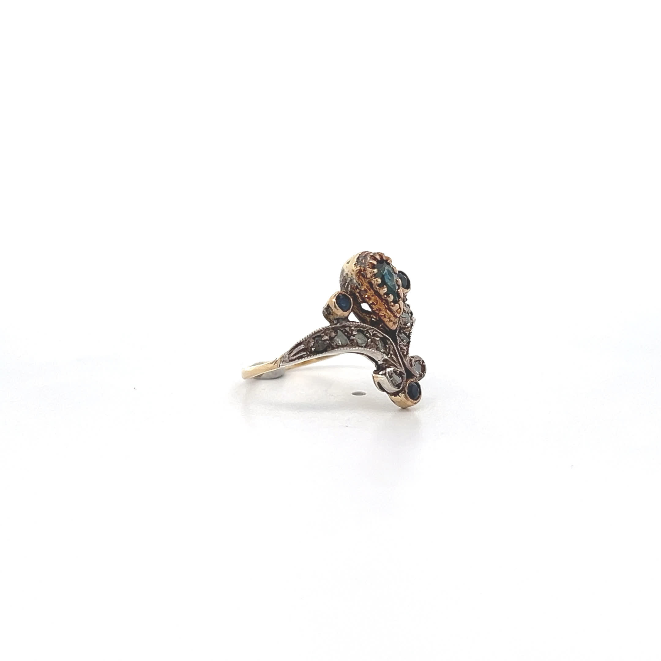 Ein Ring, der die Seele vergangener Jahrhunderte in sich trägt – die funkelnden Diamantrosen und tiefblauen Saphire in warmen 750er Gelbgold erzählen Geschichten von ewiger Liebe und zeitloser Schönheit. Spüren Sie, wie dieser außergewöhnliche Schatz Ihre Hand zu einer Hymne an die Eleganz macht und jeden Moment zu etwas Besonderem verwandelt. Ein Schmuckstück, das nicht nur getragen, sondern gefühlt wird – für all jene, die das Außergewöhnliche zu schätzen wissen.