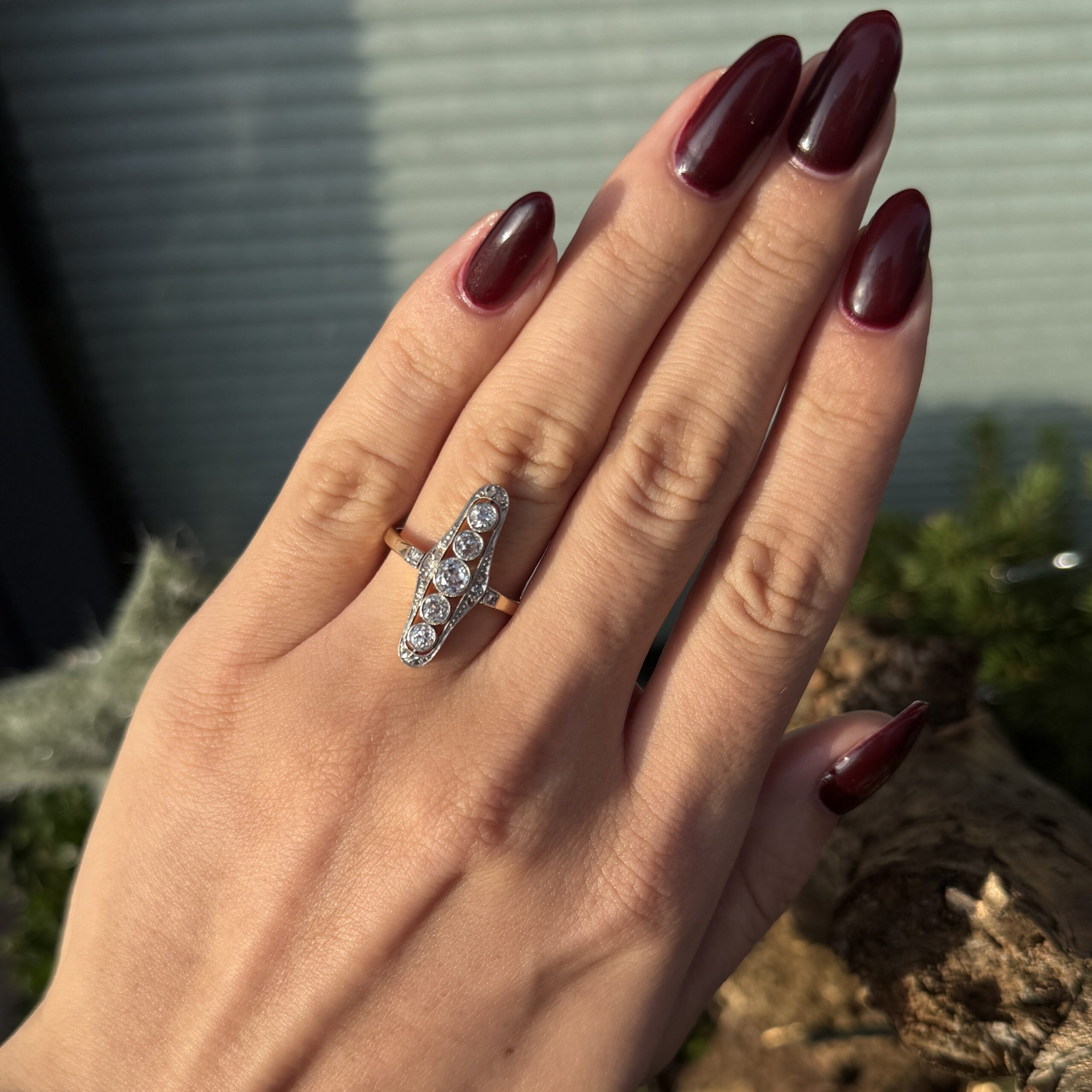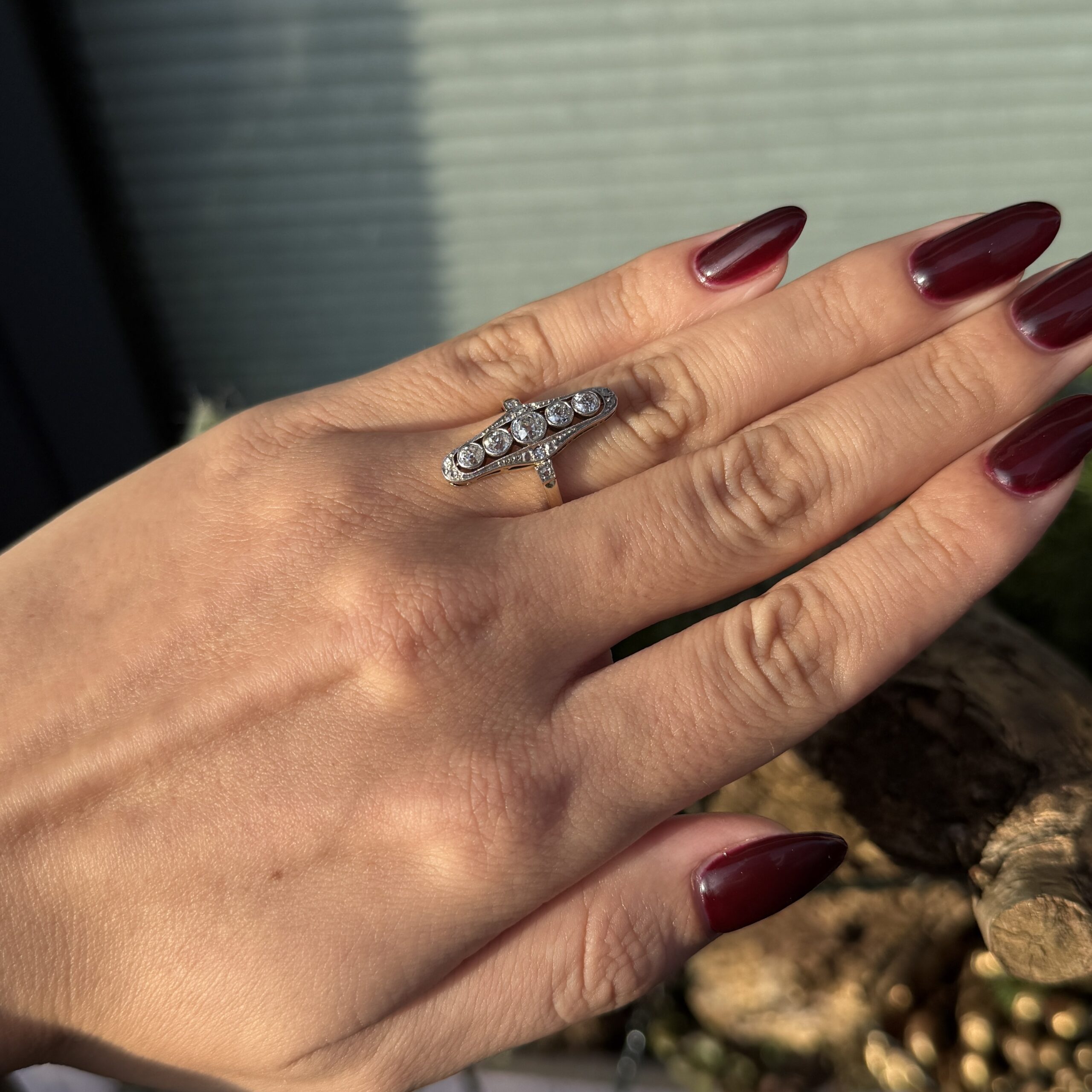 „Zeitglanz" – ein Ring aus den goldenen Zwanzigern, der seit 1930 darauf wartet, wieder zu leuchten und neue Liebesgeschichten zu schreiben. Seine funkelnden Altschliff-Diamanten flüstern von vergangenen Träumen und versprechen gleichzeitig eine strahlende Zukunft voller magischer Momente. Ein Juwel, das nicht nur Ihren Finger schmückt, sondern Ihr Herz berührt und jeden Tag zu etwas Besonderem macht.